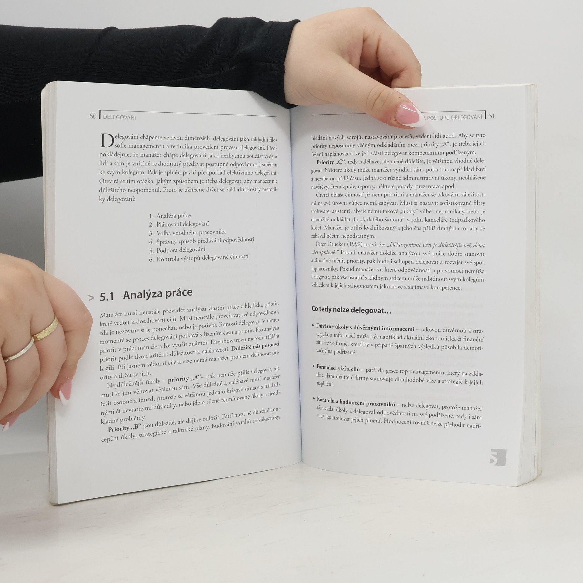 Většina manažerů považuje delegování za standardní přístup při předávání odpovědností a pravomocí, ale ve skutečnosti manažeři málokdy skutečně delegují. Nejčastější výhradou vůči delegování je, že než aby manažer podřízeným vše složitě vysvětloval, tak si práci raději udělá sám s jistotou vlastní kontroly kvality. Publikace se zaměřuje na skryté příčiny této neochoty delegovat, na analýzu manažerovy motivace k delegování a na hledání východiska z tohoto problému. Objasňuje přínosy delegování pro manažera, pracovníka a firmu, ukazuje jak správně delegovat a jaké jsou znaky špatného delegování, radí jak vybrat správného pracovníka pro delegování, jak poskytovat zpětnou vazbu či jak delegování využít k motivování pracovníka. Kniha nenabízí laciné návody, ale hlubší zamyšlení nad souvislostmi mezi delegováním, motivováním lidí, řízením priorit a koučováním. Delegování v této souvislosti chápeme spíše jako součást leadershipu a manažerovy sebereflexe než jako pouhé mana žerské řemeslo. Publikace provádí manažera úskalím sebepoznávání a základní "filosofie" úspěšného řízení.
