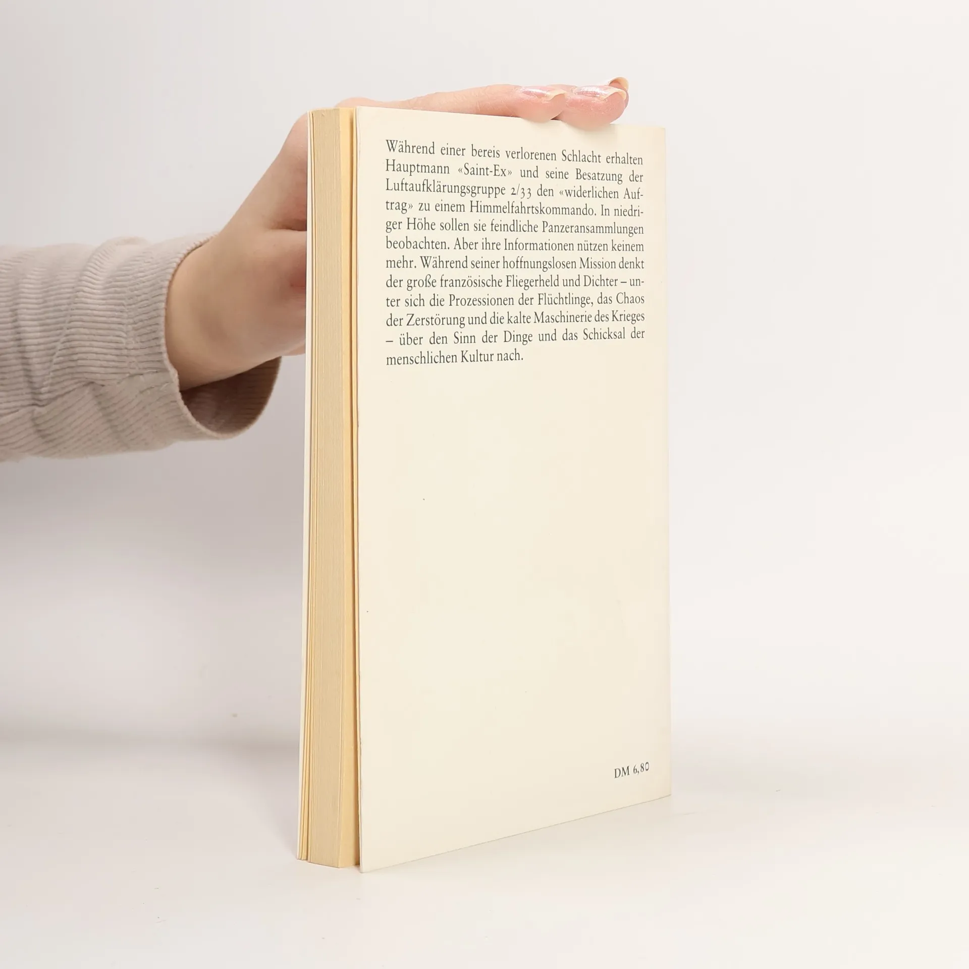 Während einer bereits verlorenen Schlacht erhalten Hauptmann «Saint-Ex» und seine Besatzung der Luftaufklärungsgruppe 2/33 den «widerlichen Auftrag» zu einem Himmelfahrtskommando. In niedriger Höhe sollen sie feindliche Panzeransammlungen beobachten. Aber ihre Informationen nützen keinem mehr. Während seiner hoffnungslosen Mission denkt der große französische Fliegerheld und Dichter - unter sich die Prozessionen der Flüchtlinge, das Chaos der Zerstörung und die kalte Maschinerie des Krieges - über den Sinn der Dinge und das Schicksal der menschlichen Kultur nach.