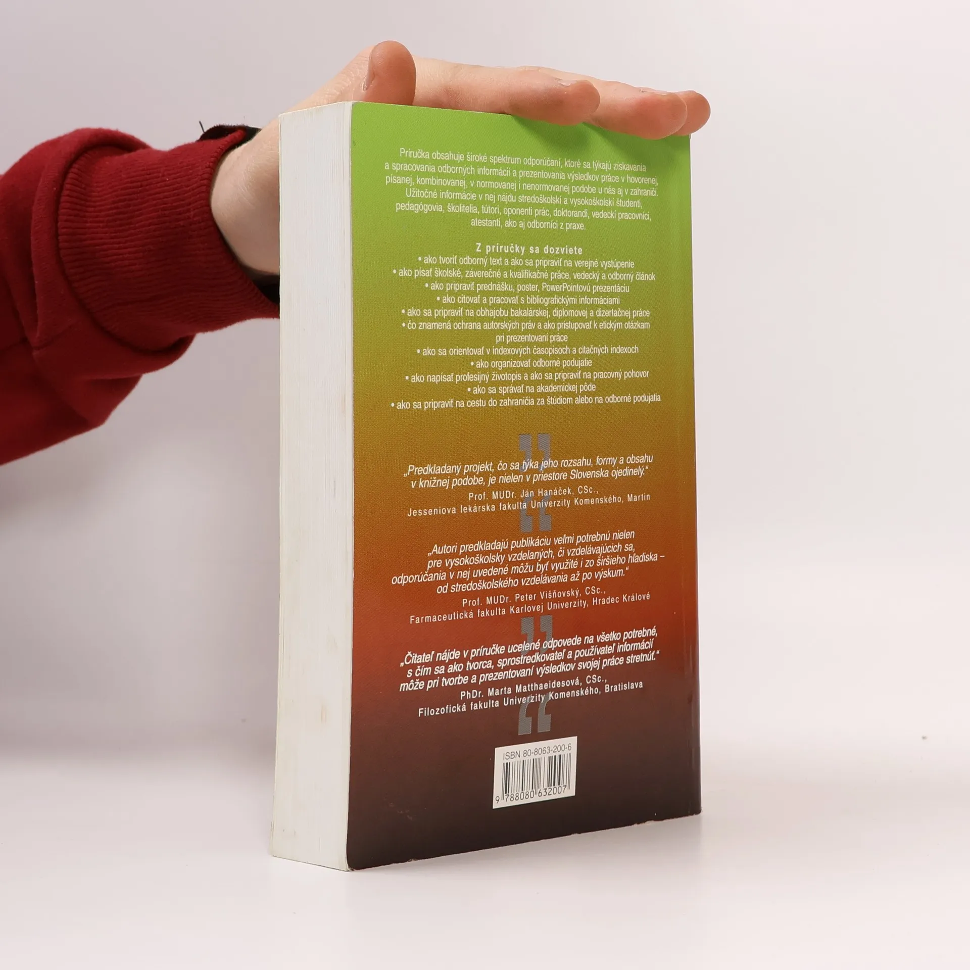 Akademická príručka, v druhom, upravenom vydaní, sa zaoberá kľúčovými otázkami získavania, spracovania a prezentovania informácií, ako aj ďalšími akademickými témami. Publikácia je unikátna v slovenskom kontexte z hľadiska rozsahu a obsahu. Obsahuje komplexné odporúčania pre prípravu rôznych odborných prác v stredoškolskom a univerzitnom prostredí, pričom rešpektuje národné a medzinárodné normy. Čitatelia tu nájdu užitočné rady aj pre prezentovanie „nenormovaných” prác, ako sú prednášky a postery. Zvláštnu pozornosť venuje bibliografickému odkazovaniu, ochrane duševného vlastníctva, etickým aspektom publikovania a výskumnej činnosti. Kapitoly o organizovaní odborných podujatí a príprave na profesionálny život (životopis, pracovný pohovor) sú tiež veľmi cenné. Nové kapitoly sa zaoberajú textovou výstavbou, rétorikou, akademickou etikou a radami na cestu do zahraničia. Autori sú odborníci z rôznych slovenských inštitúcií s bohatými skúsenosťami v prezentovaní informácií. Príručka je určená stredoškolským a vysokoškolským študentom, pedagógom, školiteľom a odborníkom. Obsahuje praktické rady na prípravu abstraktov, vedeckých článkov, citovanie, obhajoby prác, komunikačné zručnosti a organizáciu odborných podujatí.