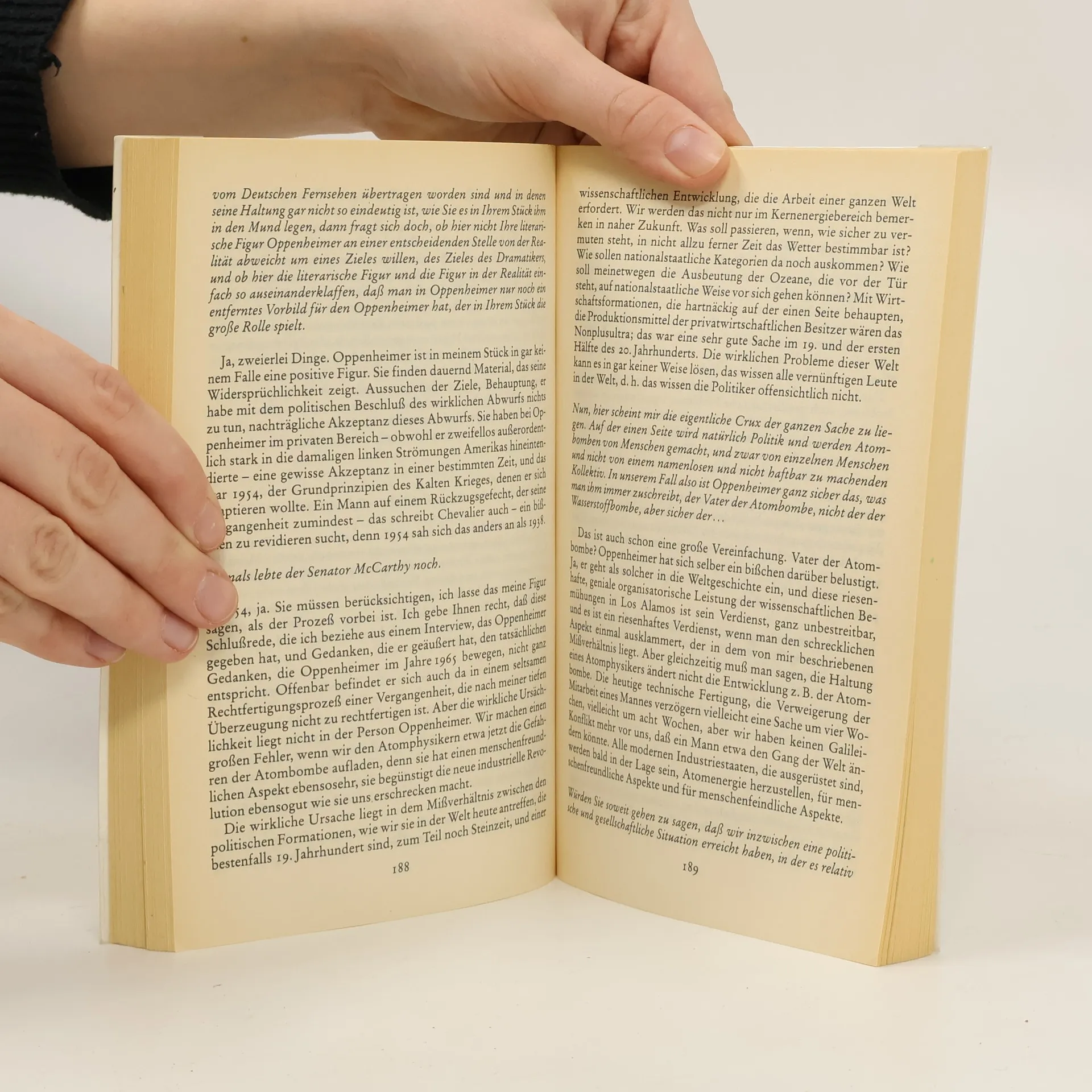 J. Robert Oppenheimer, einer der Väter der Atombombe, wird einer pazifistisch-prokommunistischen Gesinnung verdächtigt und muß sich und seine Arbeit von einem amerikanischen Untersuchungsausschuß rechtfertigen. In den Verhören, die Heinar Kipphardt auf der Grundlage von historischen Dokumenten schrieb, entsteht das Bild eines Wissenschaftlers, der die sozialen Folgen seiner Forschung bedenkt und dadurch in einen Konflikt mit dem Staat gerät.