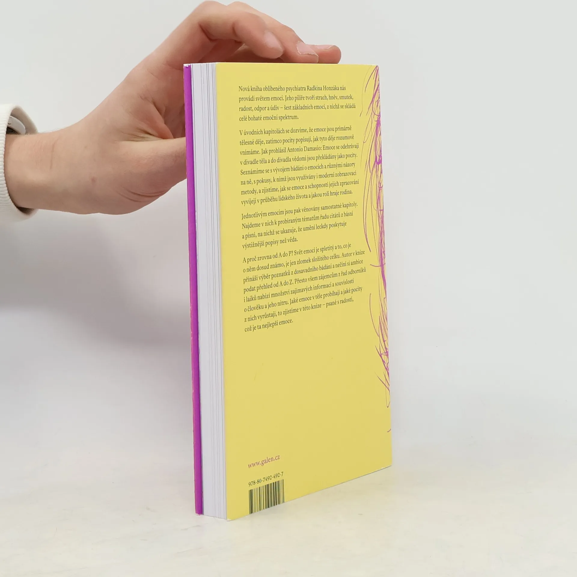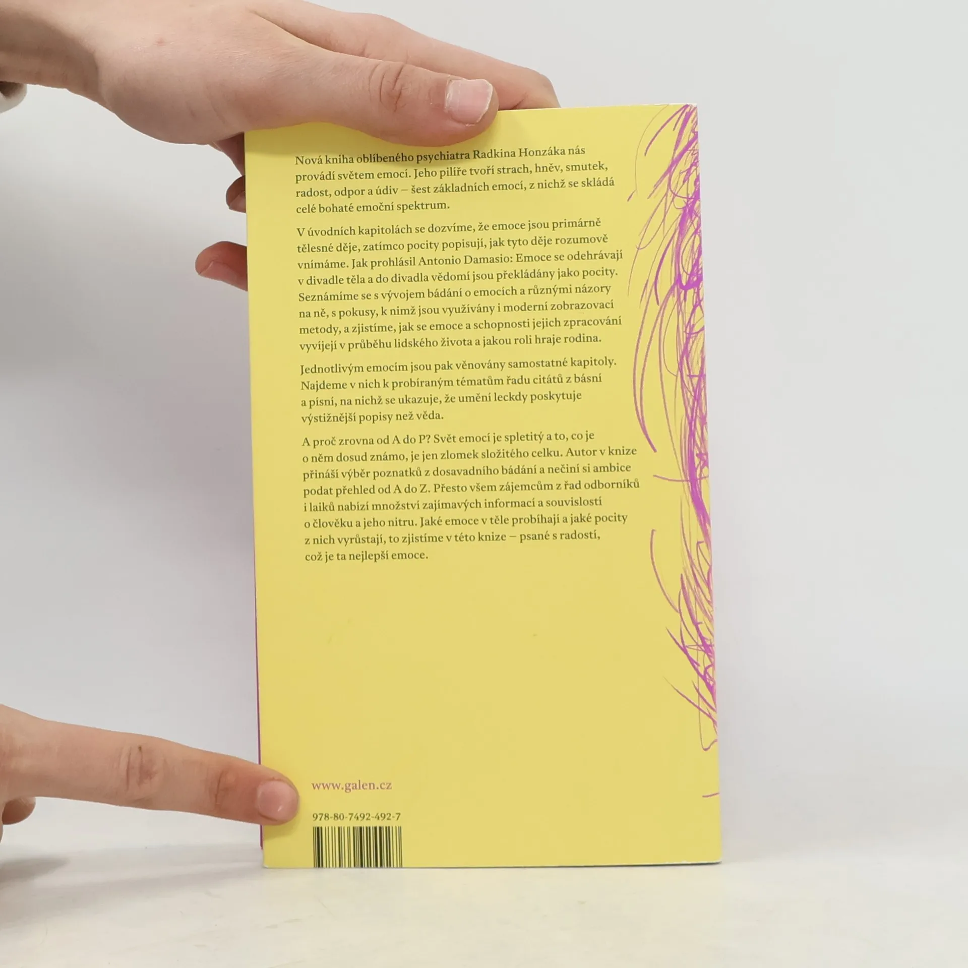 Kniha oblíbeného psychiatra Radkina Honzáka nás provádí světem emocí. Jeho pilíře tvoří strach, hněv, smutek, radost, odpor a údiv – šest základních emocí, z nichž se skládá celé bohaté emoční spektrum. V úvodních kapitolách se dozvíme, že emoce jsou primárně tělesné děje, zatímco pocity popisují, jak tyto děje rozumově vnímáme. Jak prohlásil Antonio Damasio: Emoce se odehrávají v divadle těla a do divadla vědomí jsou překládány jako pocity. Seznámíme se s vývojem bádání o emocích a různými názory na ně, s pokusy, k nimž jsou využívány i moderní zobrazovací metody, a zjistíme, jak se emoce a schopnosti jejich zpracování vyvíjejí v průběhu lidského života a jakou roli hraje rodina. Jednotlivým emocím jsou pak věnovány samostatné kapitoly. Najdeme v nich k probíraným tématům řadu citátů z básní a písní, na nichž se ukazuje, že umění leckdy poskytuje výstižnější popisy než věda. A proč zrovna od A do P? Svět emocí je spletitý a to, co je o něm dosud známo, je jen zlomek složitého celku. Autor v knize přináší výběr poznatků z dosavadního bádání a nečiní si ambice podat přehled od A do Z. Přesto všem zájemcům z řad odborníků i laiků nabízí množství zajímavých informací a souvislostí o člověku a jeho nitru. Jaké emoce v těle probíhají a jaké pocity z nich vyrůstají, to zjistíme v této knize – psané s radostí, což je ta nejlepší emoce.
