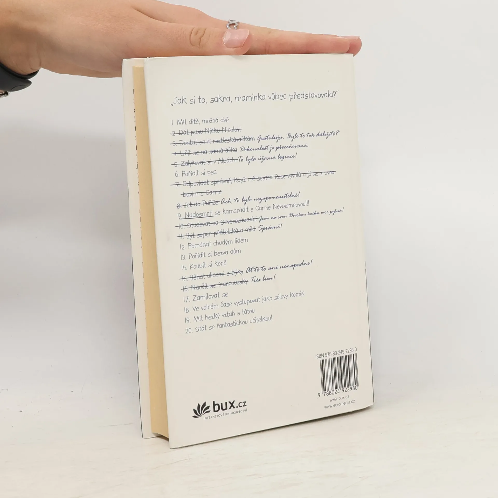 Brett Bohlingerová si až do svých 34 let žila jako princezna. Ze dne na den ale přichází o všechno, když zjišťuje, že milovaná maminka, majitelka obří kosmetické firmy, ji vynechala ze své závěti. Přesněji - její díl dědictví jí připadne pouze v případě, že dokáže do roka splnit všechna svá dětská přání, jejichž seznam si jako malá sepsala a na které už dávno zapomněla. Na rozdíl od matky. Jenomže proč by se měla Brett najednou stát učitelkou a ve volném čase dělat sólového komika, když se tak tvrdě připravovala na to, že jednou převezme rodinné impérium? A k čemu by jí byl kůň? Brett se cítí podvedená a ponížená, navíc přichází o práci, jistý příjem i dlouholetého přítele. S vidinou dědictví začíná plnit jeden bod seznamu za druhým a brzy si s překvapením uvědomuje, že jí ten starý ušmudlaný list papíru úplně ovládá. A že jí to vlastně vůbec nevadí … Půvabný románový debut americké autory o cestě za štěstím a o snech, jichž bych se člověk neměl nikdy vzdávat.