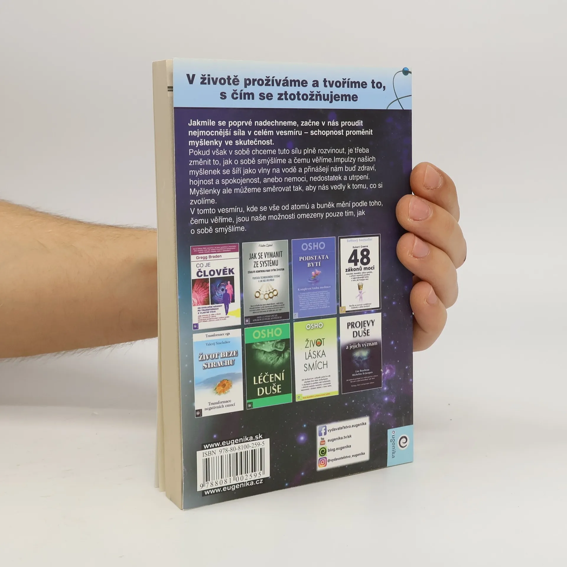 Poutavé vysvětlení, založené na moderním vědeckém výzkumu, jak naše myšlenky a přesvědčení ovlivňují naši skutečnost. Zároveň návod, jak se vymanit z pout starých, omezujících názorů. Impulzy našich myšlenek se šíří jako vlny na vodě a přinášejí nám buď zdraví, hojnost a spokojenost, anebo nemoci, nedostatek a utrpení. Myšlenky ale můžeme směrovat tak, aby nás vedly k tomu, co si zvolíme. V tomto vesmíru, kde se vše od atomů a buněk mění podle toho, čemu věříme, jsou naše možnosti omezeny pouze tím, jak o sobě smýšlíme.