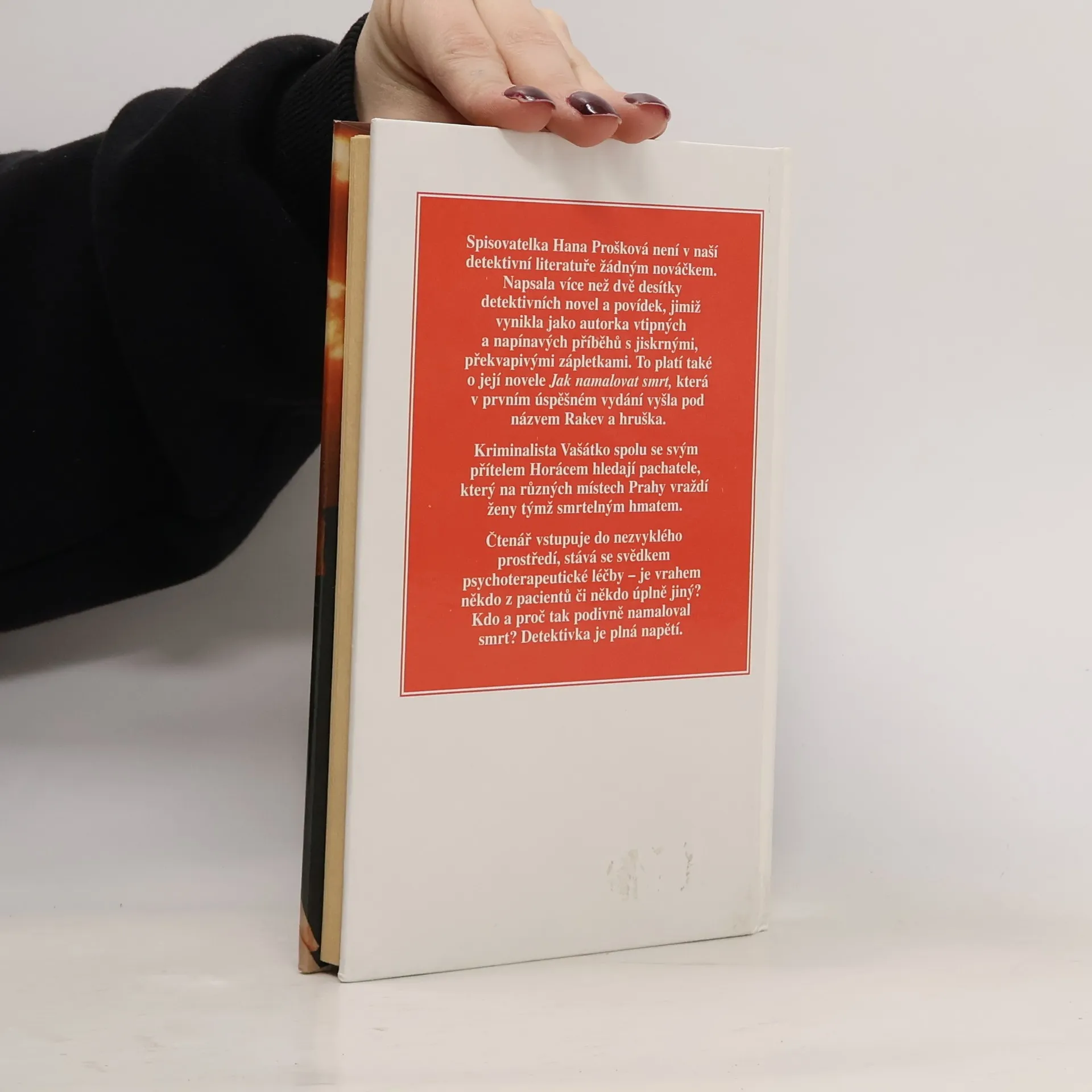 Spisovatelka Hana Pošková není v naší detektivní literatuře žádným nováčkem. Napsala více než dvě desítky detektivních povídek a novel, jimiž vynikla jako autorka vtipných a napínavých příběhů s jiskrnými, překvapivými zápletkami. To platí také o její novele Jak namalovat smrt, která v prvním úspěšném vzdání vyšla pod názvem Rakev a hruška. Kriminalista Vašátko spolu se svým přítelem Horácem hledají pachatele, který na různých místech Prahy vraždí ženy týmž smrtelným hmatem. Čtenář vstupuje do nezvyklého prostředí, stává se svědkem psychoterapeutické léčby - je vrahem někdo z pacientů či někdo úplně jiný? Kdo a proč tak podivně namaloval smrt? Detektivka je plná napětí.
