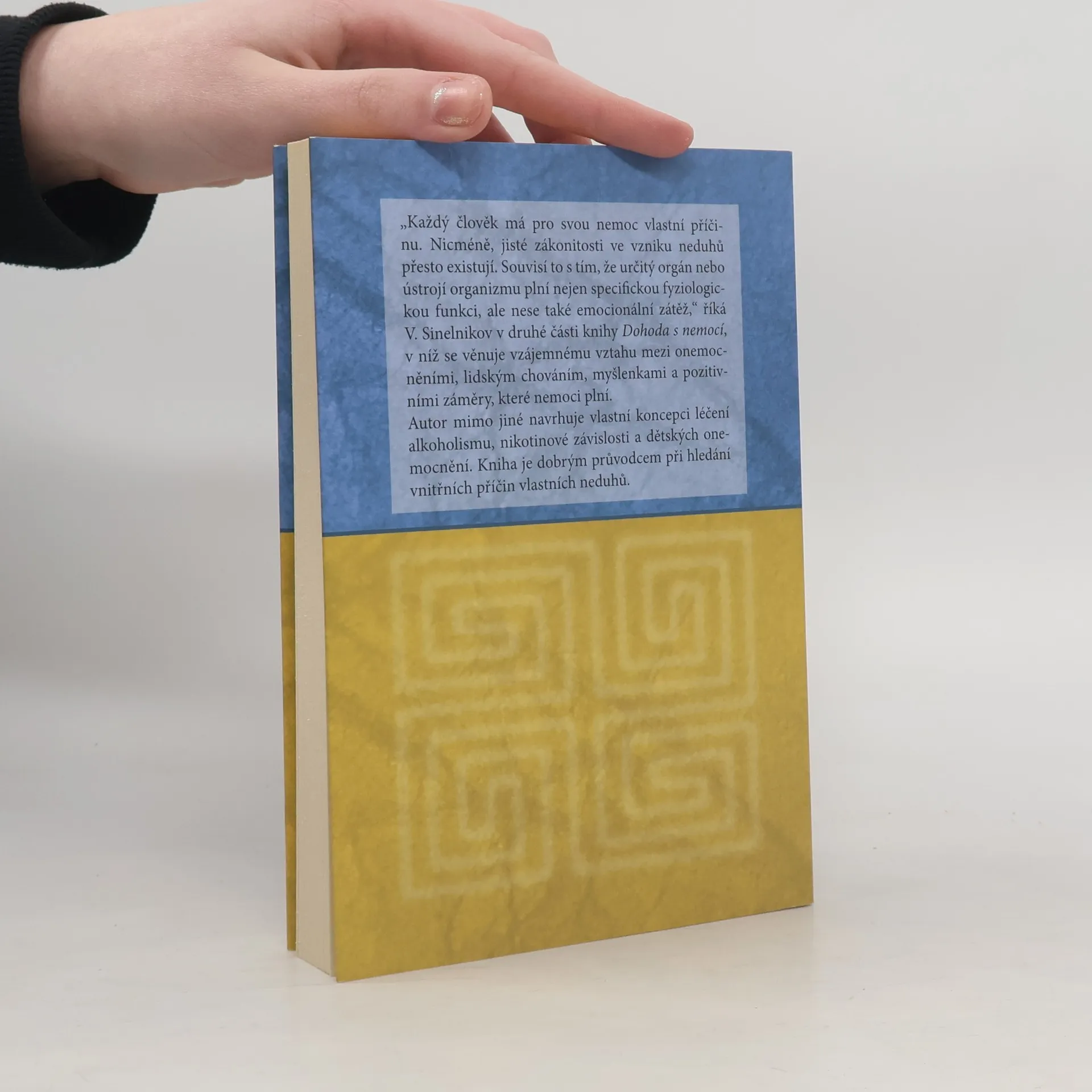 Každý člověk má pro svou nemoc vlastní příčinu. Nicméně, jisté zákonitosti ve vzniku neduhů přesto existují. Souvisí to s tím, že určitý orgán nebo ústrojí organismu plní nejen specifickou fyziologickou funkci, ale nese také emocionální zátěž, říká V. Sinelnikov v druhé knize Dohoda s nemocí, v níž se věnuje vzájemnému vztahu mezi onemocněním, lidským chováním, myšlenkami a pozitivními záměry, které nemoci plní. Autor mimo jiné navrhuje vlastní koncepci léčení alkoholismu, nikotinové závislosti a dětských onemocnění. Kniha je dobrým průvodcem při hledání vnitřních příčin vlastních neduh