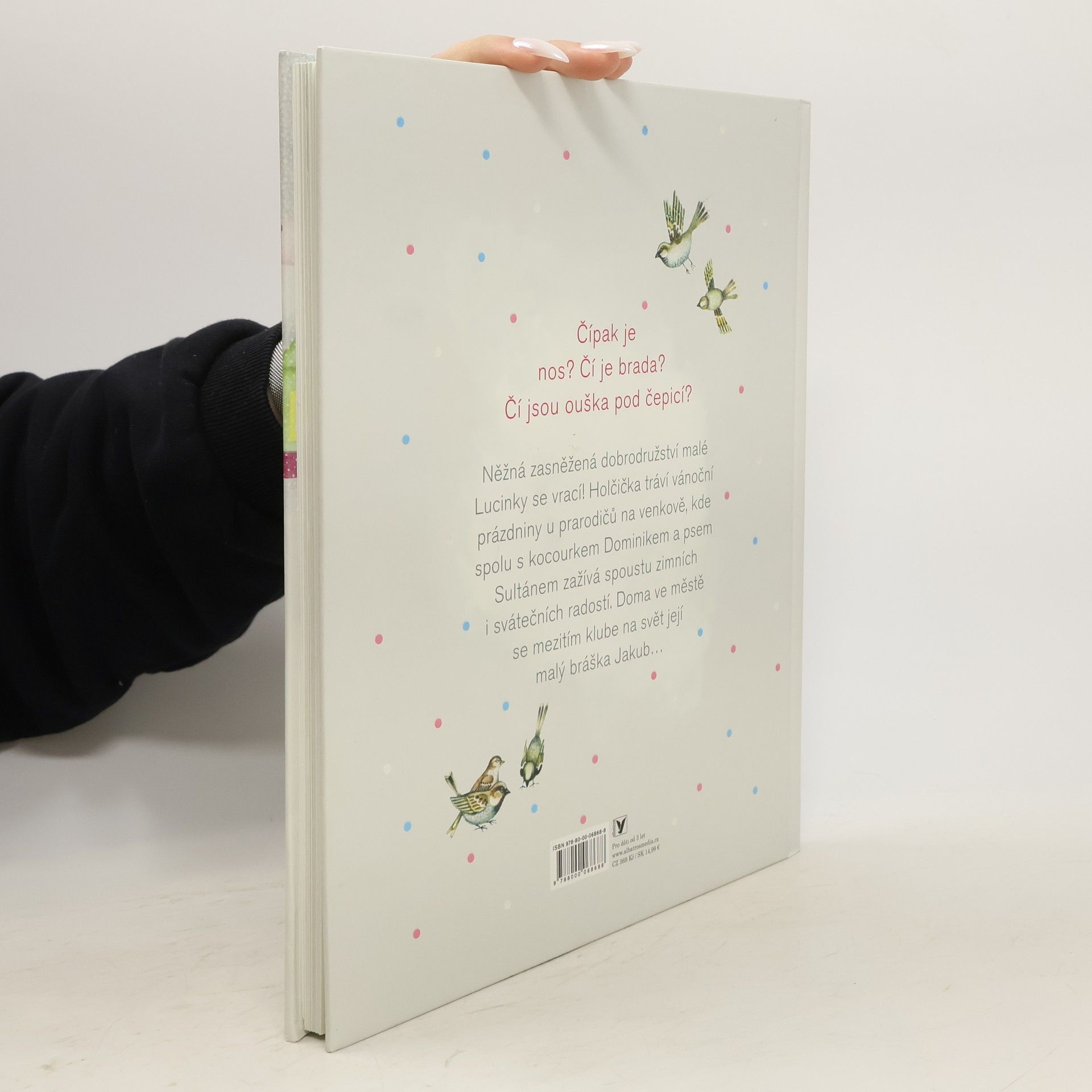Čípak je nos? Čí je brada? Čí jsou ouška pod čepicí? Něžná zasněžená dobrodružství malé Lucinky se vrací! Holčička tráví vánoční prázdniny u prarodičů na venkově, kde spolu s kocourkem Dominikem a psem Sultánem zažívá spoustu zimních i svátečních radostí. Doma ve městě se mezitím klube na svět její malý bráška Jakub…