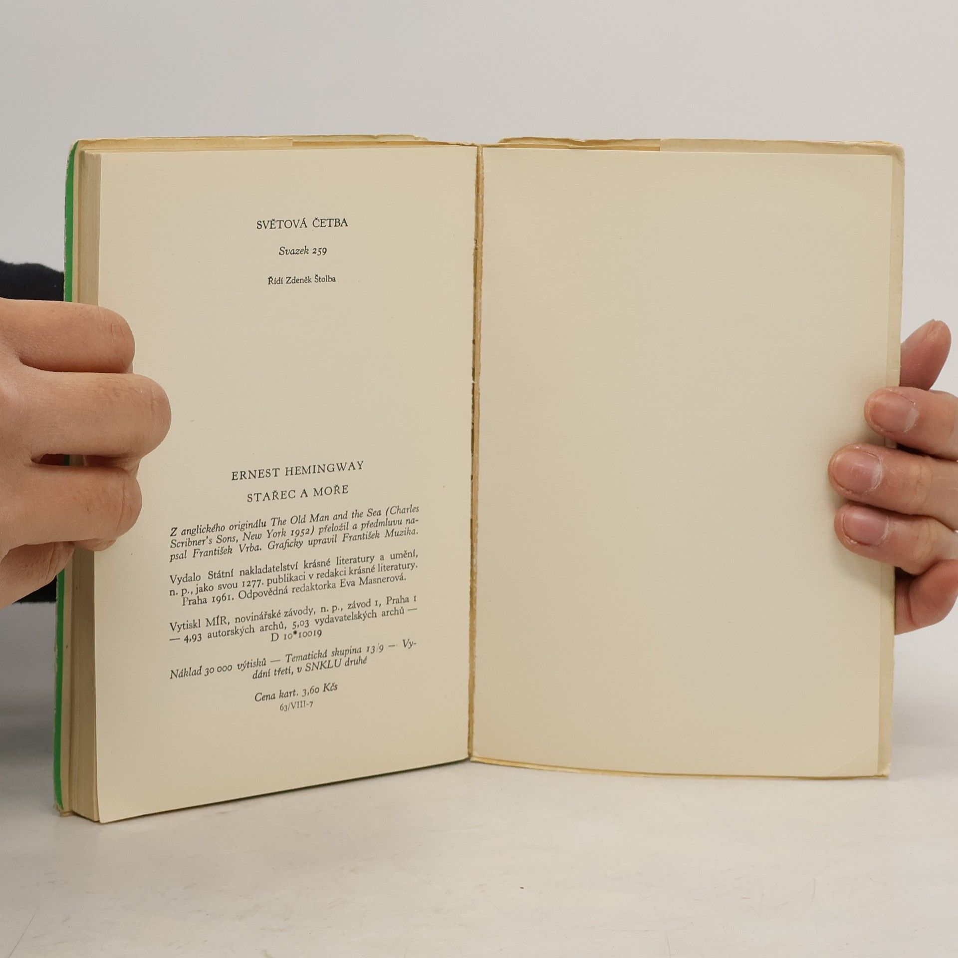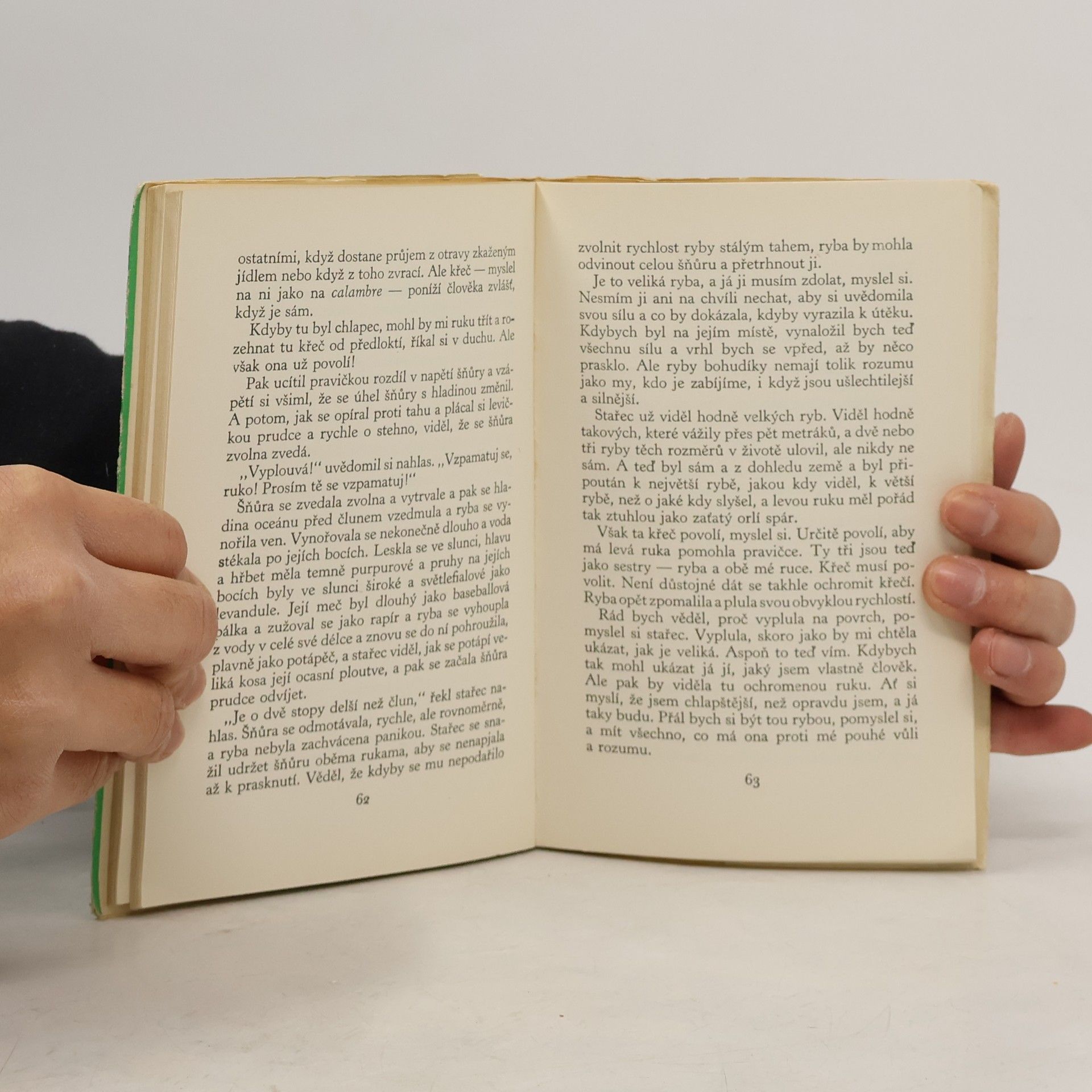 Snad nejznámější novela autora, který ovlivnil celou generaci amerických i evropských prozaiků. Byla napsána r. 1952 a objevila se i ve filmové podobě. Příběh bezejmenného starce, jenž bojuje na širém moři o svůj úlovek a později už jen o holý život, symbolizuje odvěký zápas člověkas přírodou, zápas, který vyplňuje lidský život. Spisovateli byla za toto dílo udělena Nobelova cena. Edice: Světová četba ; sv. 259 30000 výt. 3. vydání, v SNKLHU 2. vydání.