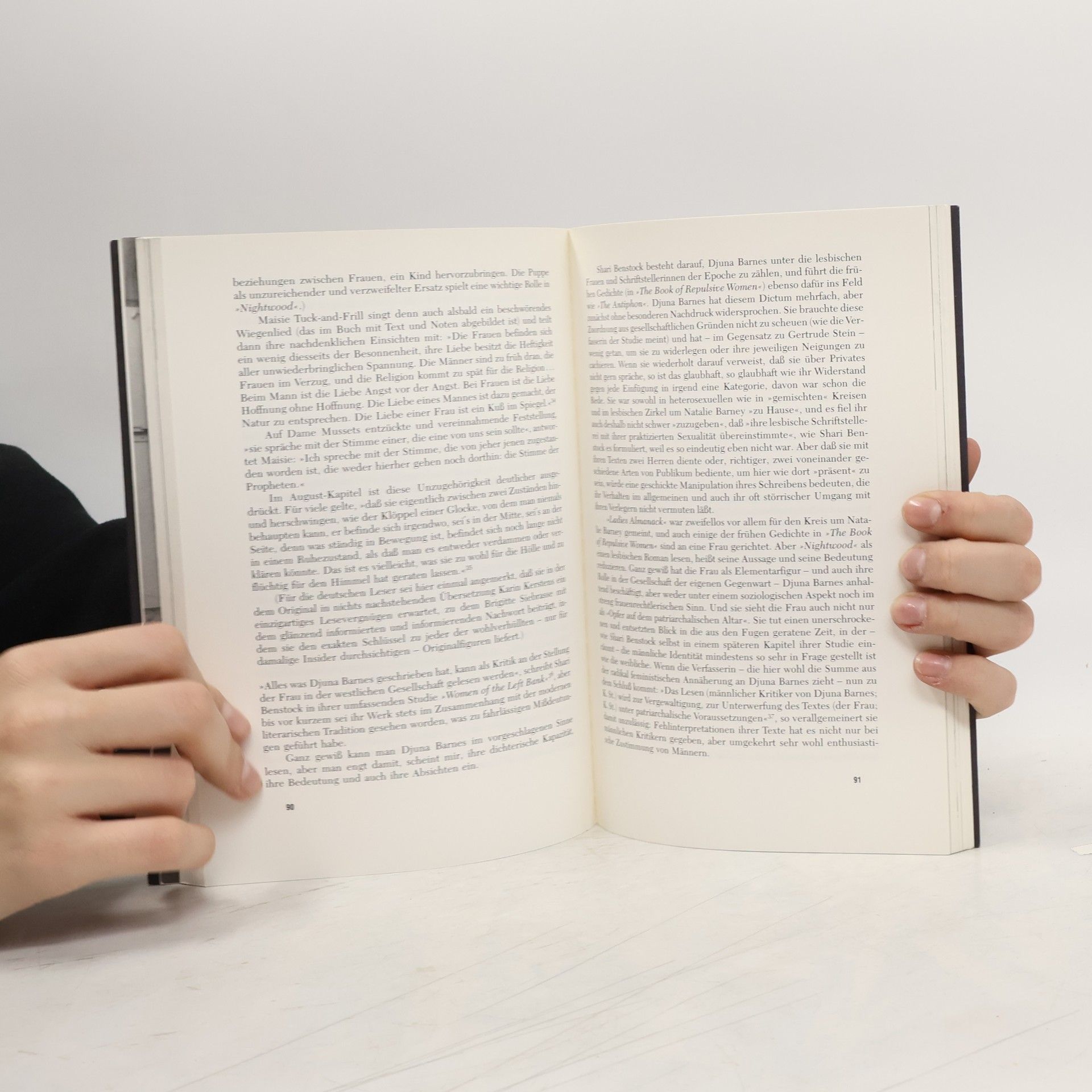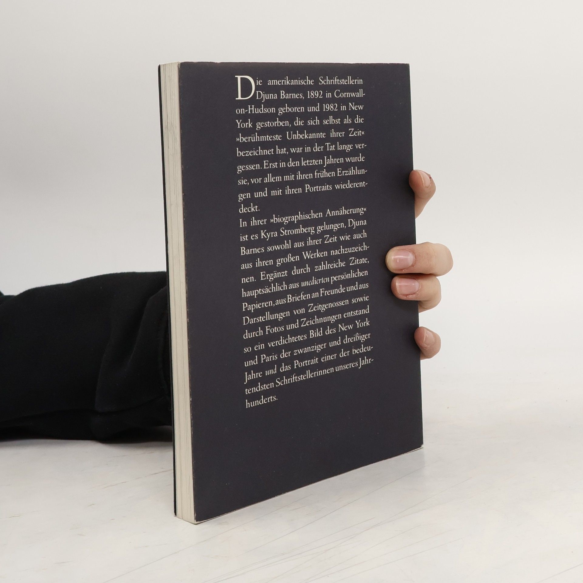 Djuna Barnes, 1892 in Cornwall-on-Hudson geboren und 1982 in New York gestorben: eine begabte junge Journalistin, die um den ersten Weltkrieg in New York respektlose Interviews, dekuvrierende Portraits, scharfsichtige short stories und Kurzdramen veröffentlichte. In Paris eine faszinierende Erscheinung von satirischem Witz, gern gesehen in den literarischen Cafés und Salons der Zwanziger Jahre. Eine passionierte Liebhaberin von Frauen – und bisweilen auch Männern –, die den Irrungen und Wirrungen der Liebe im Leben meist erlag und sie literarisch mit Ironie bezwang oder tragisch deutete. Eine große, lange verkannte Schriftstellerin, die nach einem unruhigen Leben als menschenscheue Exzentrikerin starb.