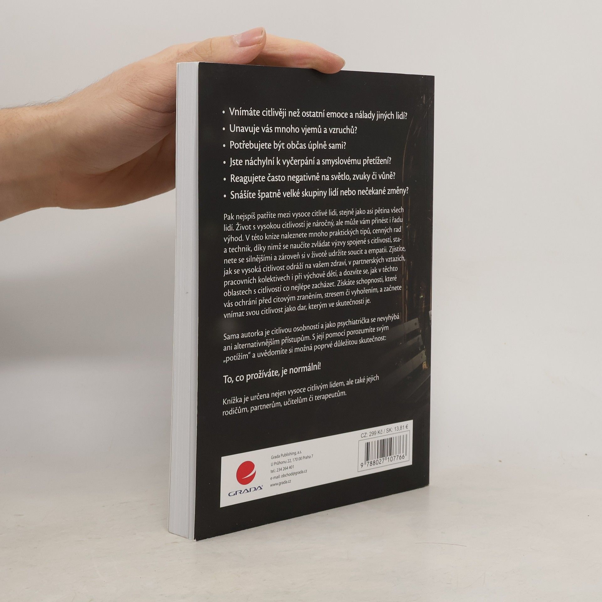 Vnímáte citlivěji než ostatní emoce a nálady jiných lidí? Unavuje vás mnoho vjemů a vzruchů? Potřebujete být občas úplně sami? Jste náchylní k vyčerpání a smyslovému přetížení? Reagujete často negativně na světlo, zvuky či vůně? Snášíte špatně velké skupiny lidí nebo nečekané změny? Pak nejspíš patříte mezi vysoce citlivé lidi, stejně jako asi pětina všech lidí. Život s vysokou citlivostí je náročný, ale může vám přinést i řadu výhod. V této knize naleznete mnoho praktických tipů, cenných rad a technik, díky nimž se naučíte zvládat výzvy spojené s citlivostí, stanete se silnějšími a zároveň si v životě udržíte soucit a empatii. Zjistíte, jak se vysoká citlivost odráží na vašem zdraví, v partnerských vztazích, pracovních kolektivech i při výchově dětí, a dozvíte se, jak v těchto oblastech s citlivostí co nejlépe zacházet. Získáte schopnosti, které vás ochrání před citovým zraněním, stresem či vyhořením, a začnete vnímat svou citlivost jako dar, kterým ve skutečnosti je. Sama autorka je citlivou osobností a jako psychiatrička se nevyhýbá ani alternativnějším přístupům. S její pomocí porozumíte svým „potížím“ a uvědomíte si možná poprvé důležitou skutečnost: To, co prožíváte, je normální! Knížka je určena nejen vysoce citlivým lidem, ale také jejich rodičům, partnerům, učitelům či terapeutům.