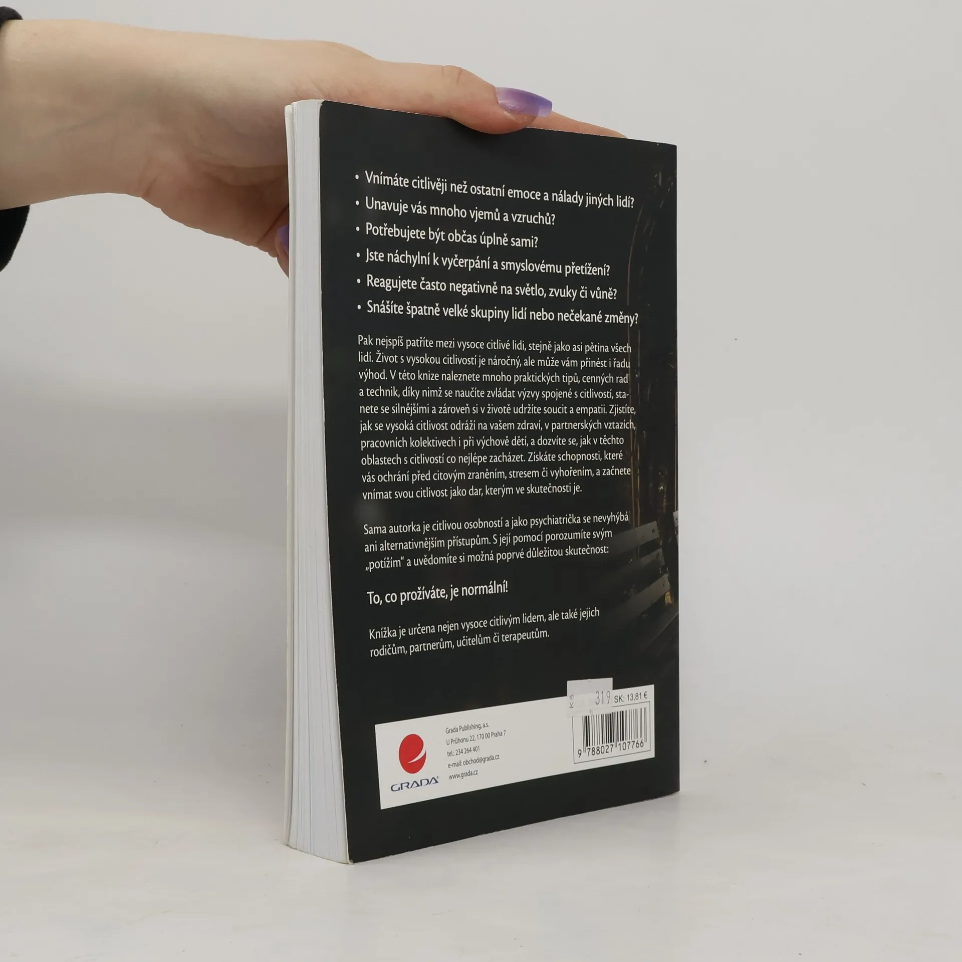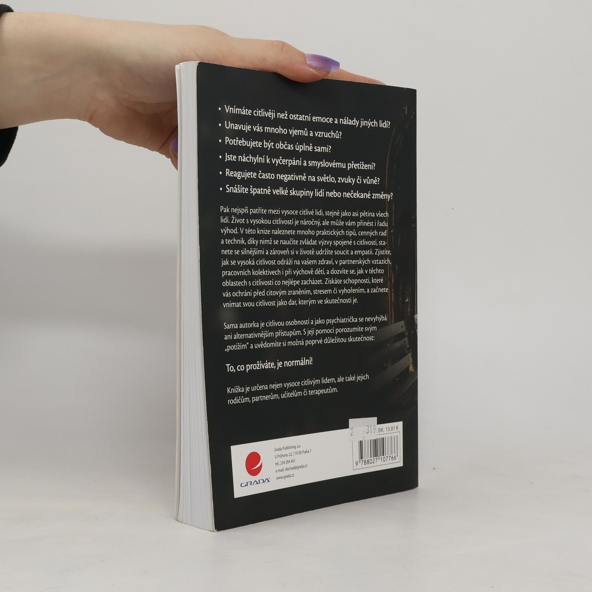Vnímáte citlivěji než ostatní emoce a nálady jiných lidí? Unavuje vás mnoho vjemů a vzruchů? Potřebujete být občas úplně sami? Jste náchylní k vyčerpání a smyslovému přetížení? Reagujete často negativně na světlo, zvuky či vůně? Snášíte špatně velké skupiny lidí nebo nečekané změny? Pak nejspíš patříte mezi vysoce citlivé lidi, stejně jako asi pětina všech lidí. Život s vysokou citlivostí je náročný, ale může vám přinést i řadu výhod. V této knize naleznete mnoho praktických tipů, cenných rad a technik, díky nimž se naučíte zvládat výzvy spojené s citlivostí, stanete se silnějšími a zároveň si v životě udržíte soucit a empatii. Zjistíte, jak se vysoká citlivost odráží na vašem zdraví, v partnerských vztazích, pracovních kolektivech i při výchově dětí, a dozvíte se, jak v těchto oblastech s citlivostí co nejlépe zacházet. Získáte schopnosti, které vás ochrání před citovým zraněním, stresem či vyhořením, a začnete vnímat svou citlivost jako dar, kterým ve skutečnosti je. Sama autorka je citlivou osobností a jako psychiatrička se nevyhýbá ani alternativnějším přístupům. S její pomocí porozumíte svým „potížím“ a uvědomíte si možná poprvé důležitou skutečnost: To, co prožíváte, je normální! Knížka je určena nejen vysoce citlivým lidem, ale také jejich rodičům, partnerům, učitelům či terapeutům.