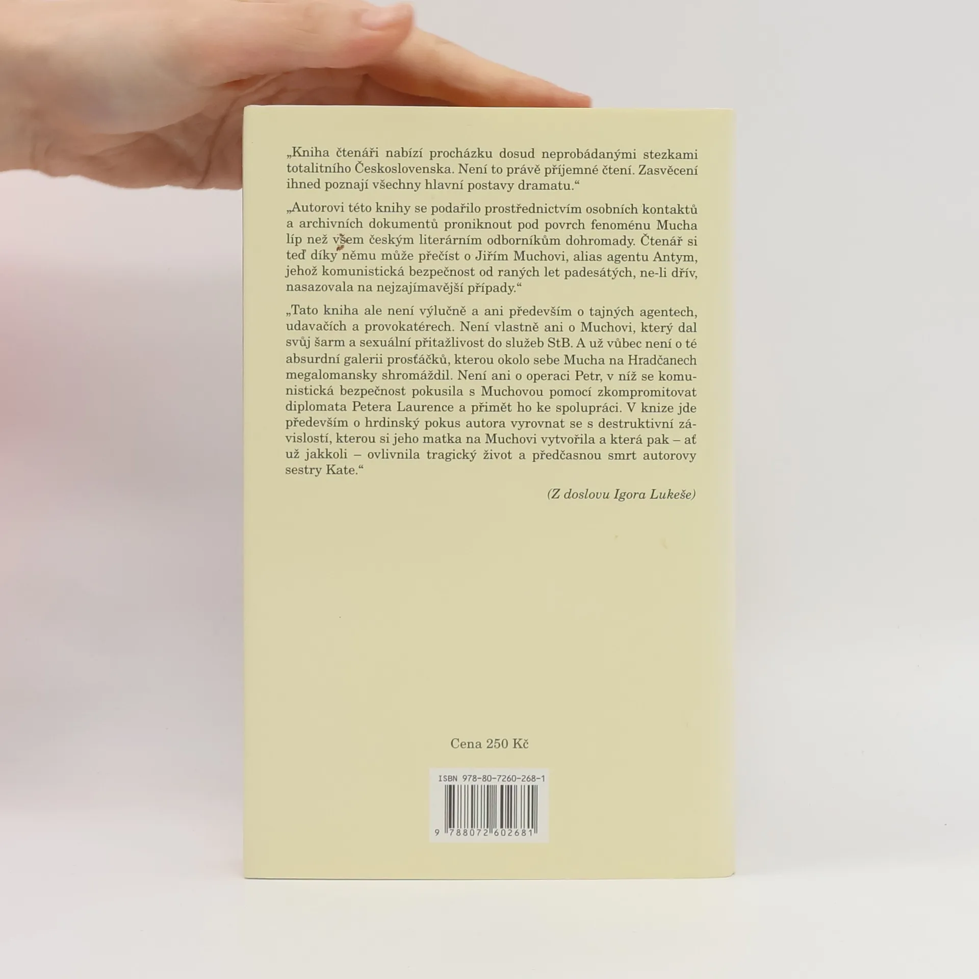 Autobiografická kniha novináře Charlese Laurence, jehož otec byl britským diplomatem, zachycuje příběh rodiny žijící v Praze v padesátých letech, což mělo na jejich životy zásadní dopad. Autor, jako malý chlapec, vnímal jen fragmenty událostí kolem sebe, což dodává knize kouzlo a hloubku. Po roce 1989 se Laurence vrací do Prahy, aby na základě rozhovorů a dokumentů odhalil důvody dočasného odvolání svého otce a jeho vliv na matku a sestru. Dva rozhovory s Geraldinou Muchovou, manželkou Jiřího Muchy, rámují celý příběh. Autor zjišťuje, že milostná aféra jeho matky s Jiřím Muchou byla součástí operace Státní bezpečnosti, v níž Mucha hrál roli "společenského agenta". Kniha se tak stává "klíčovým románem", v němž se objevují známé osobnosti české kultury a jejich role ve špionážní hře studené války. Laurence poskytuje nový pohled na Muchovu činnost za komunistického režimu a na mechanismy, jimiž Státní bezpečnost získávala informace a kontrolovala občany. Jiří Mucha, syn Alfonse Muchy, byl novinář, spisovatel, vězeň komunistického režimu a pozdější předseda československého PEN klubu. Kniha je přeložena z anglického originálu a obsahuje fotografii Jiřího Muchy.