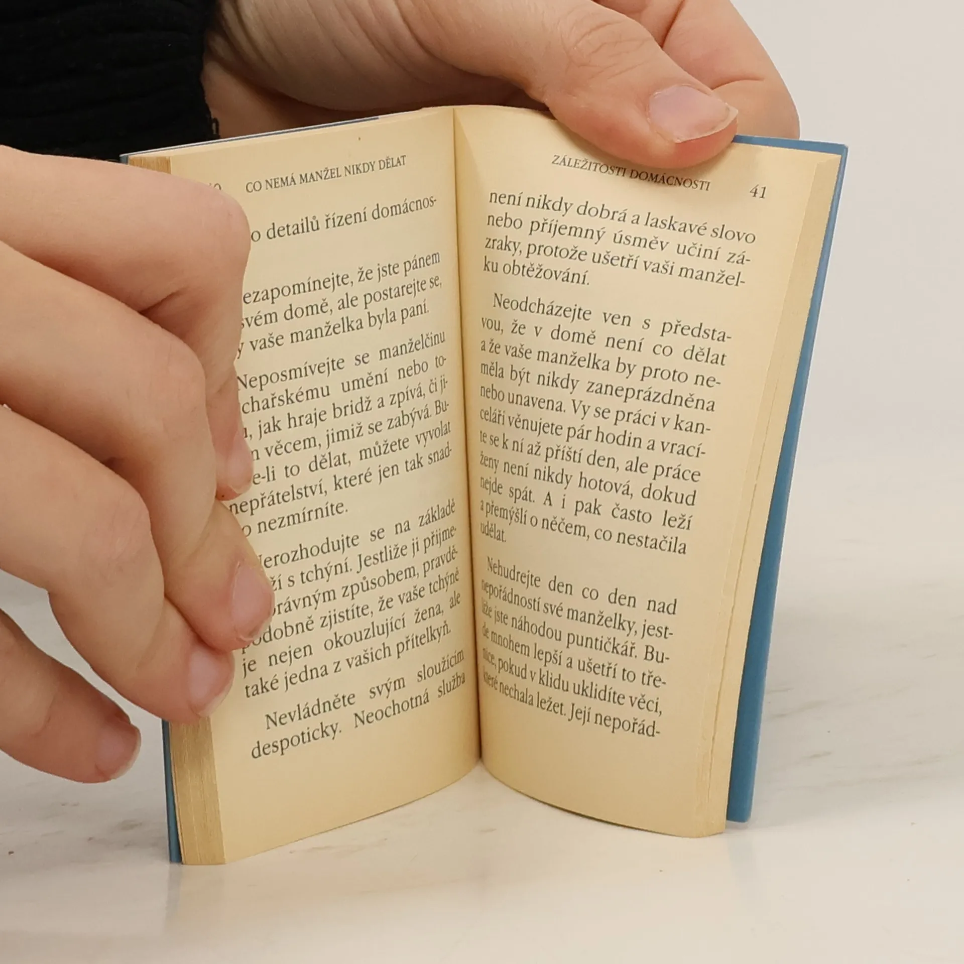 Dnes již klasická kniha rad, čeho se mají muži v manželství vystříhat. Rady týkající se všeobecných zvyků, osobních vztahů, žárlivosti, financí, domácnosti, zábavy a svátků, zdraví, oblečení, zálib, stravy i dětí.
