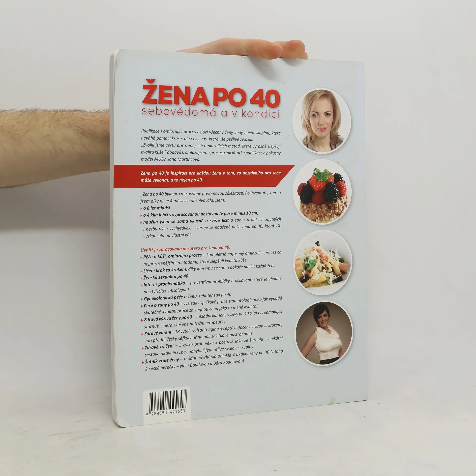 Unikátní publikace pro ženy, nejen po 40, v níž jedna z autorek podstoupila omlazující proces přirozenějšími metodami na vlastní kůži. Je možné během čtyř měsíců omládnout o 8 let, zhubnout 4 kilogramy a 10 cm v pase? Rozšířit si kosmetický i módní obzor? A změnit pohled na sebe a svůj život? To Vám prozradí pokusný model, MUDr. Jana Martincová. Nemusíte detailně dodržet návod. Nechte se inspirovat. Zůstaňte SEBEVĚDOMÁ A V KONDICI. Autorský tým složený z 13 odborníků, lékařů, nutriční terapeutky, fyzioterapeutky, vizážistky, módní návrhářky, šéfkuchaře, připravil desatero nejen pro ženu po 40. Herečky Nela Boudová (Doktoři z Počátků) a Bára Kodetová v modelech módní návrhářky. Žena po 40 obsahuje desatero nejen pro ženu po 40: - Omlazující proces - možnosti péče o kůži a přirozenější omlazující metody krok za krokem - Líčení s vizážistkou - návod, díky kterému se dokáže nalíčit každá žena - Sexualita ženy po 40 - Preventivní prohlídky a očkování vhodné po 40 - Gynekologická péče o ženu po 40 - Péče o zuby - jak vypadá špičková práce za stejnou cenu jako méně kvalitní - Zdravá výživa po 40 - Zdravé vaření -18 výtečných anti-aging receptů, připravených předním českým šéfkuchařem - nafocených krok za krokem - 5 cviků proti věku - cvičení, u kterého se nezapotíte a po pár týdnech budete mít tělo zpevněné jako ze žurnálu - Šatník zralé ženy, co by měl obsahovat, jaké to je nechat se obléci v módním salónu.