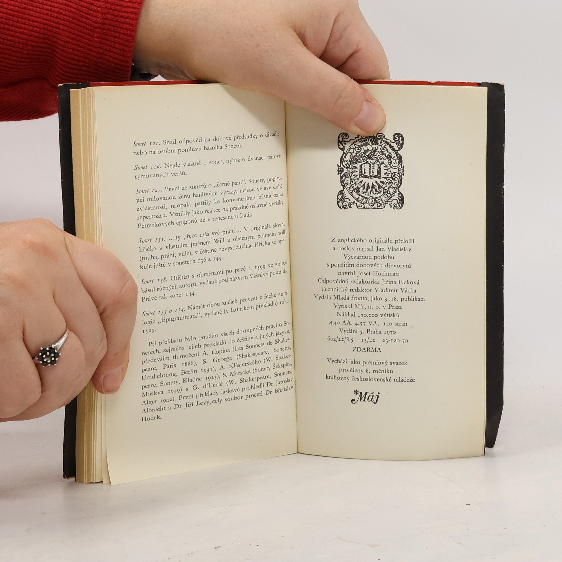 Páté vydání 154 Shakespearových sonetů, tentokrát v překladu Jana Vladislava. Prémiový svazek 8. ročníku edice Máj.