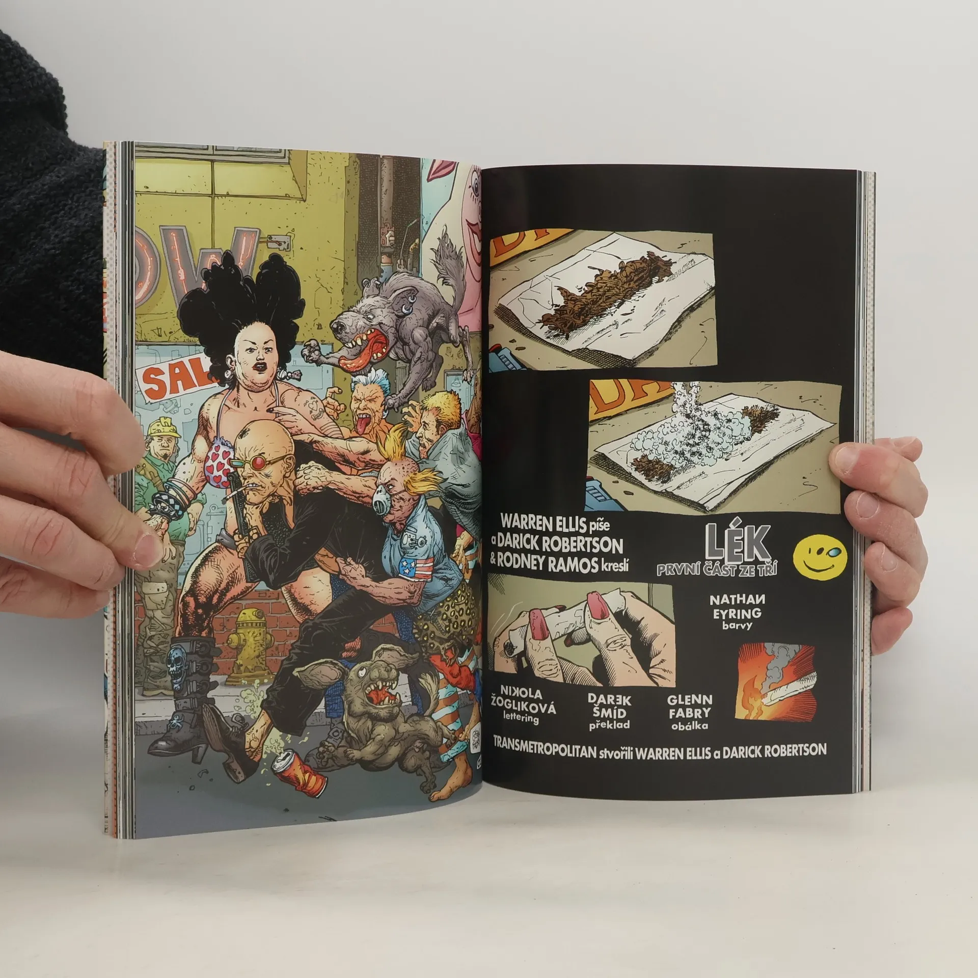 Jde do tuhého. Zuřivý reportér Spider Jerusalem přišel o práci i o všechno, co měl, mozek mu ničí nevyléčitelná choroba a v patách má nájemné vrahy, které si platí samotný prezident Spojených států. I tak má ale Spider úsměv na tváři a v srdci smích. Proč? Protože společně se svými ohavnými asistentkami narazil na pořádně prohnilou stopu, kterou za sebou prezident nechal. Protože skládanka podvodů a vražd se dá konečně složit. A protože Spider má na své straně pravdu a ztratit už nemá co. Legendární scenárista Warren Ellis (The Authority, Planetary) a kreslíř Darick Robertson (Banda, Wolverine) zvyšují kreativní radiaci až někam na sterilizační úroveň; kniha Transmetropolitan: Lék shrnuje čísla 49–54 jejich toxické komiksové série.