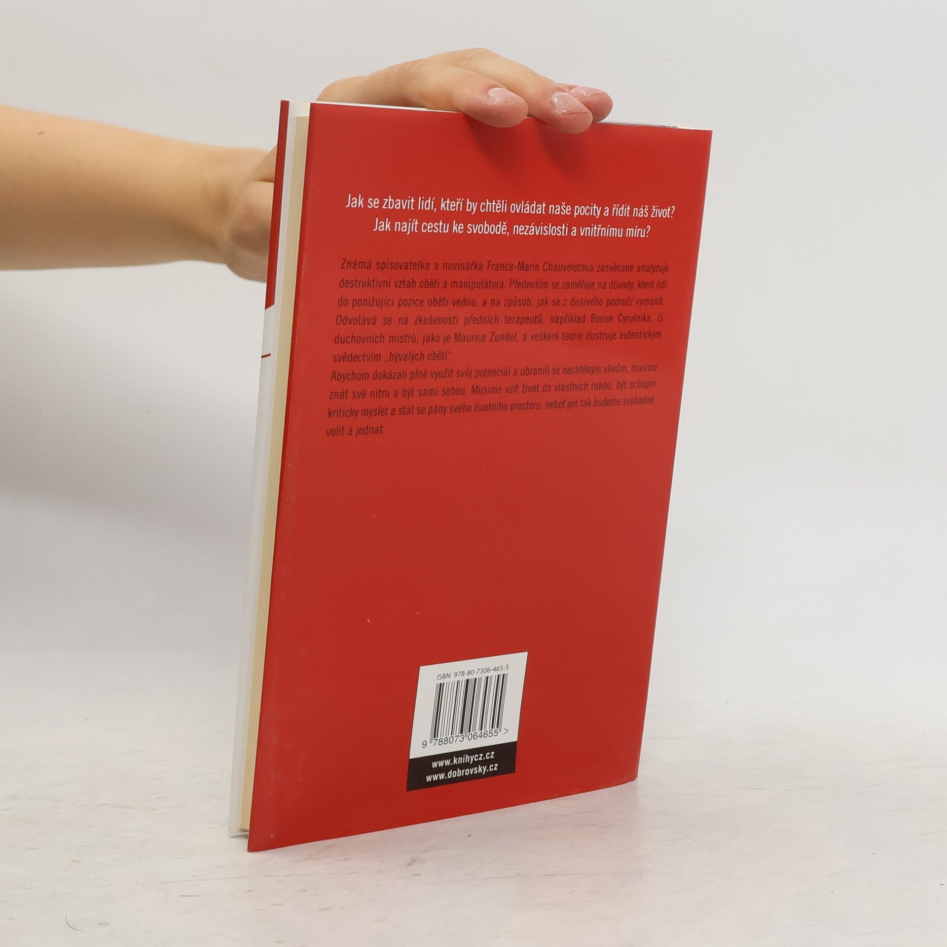 V moderním světě – ovládaném do značné míry médii – často podléháme manipulaci: v osobním životě, v práci, při nákupu zboží, v hodnotové orientaci. Lze se tomu vyhnout a nestát se bezbrannou obětí manipulátorů? Cesta k nápravě spočívá především v nás. Autorka knihy analyzuje proces, jímž se z člověka stává oběť takové manipulace a vysvětluje jeho mechanismy. Na řadě příkladů ze života pak dokládá nutnost spojit psychologické úsilí se zásadami duchovního života; k obraně proti manipulacím – abychom mohli svobodně a s úspěchem sami rozhodovat, co zvolíme – je nutné, abychom se stali pány svého vnitřního světa. To ovšem neznamená uzavírat se před vnějším světem: naopak, vnitřní vyrovnanost nám pomůže akceptovat i vnější realitu.