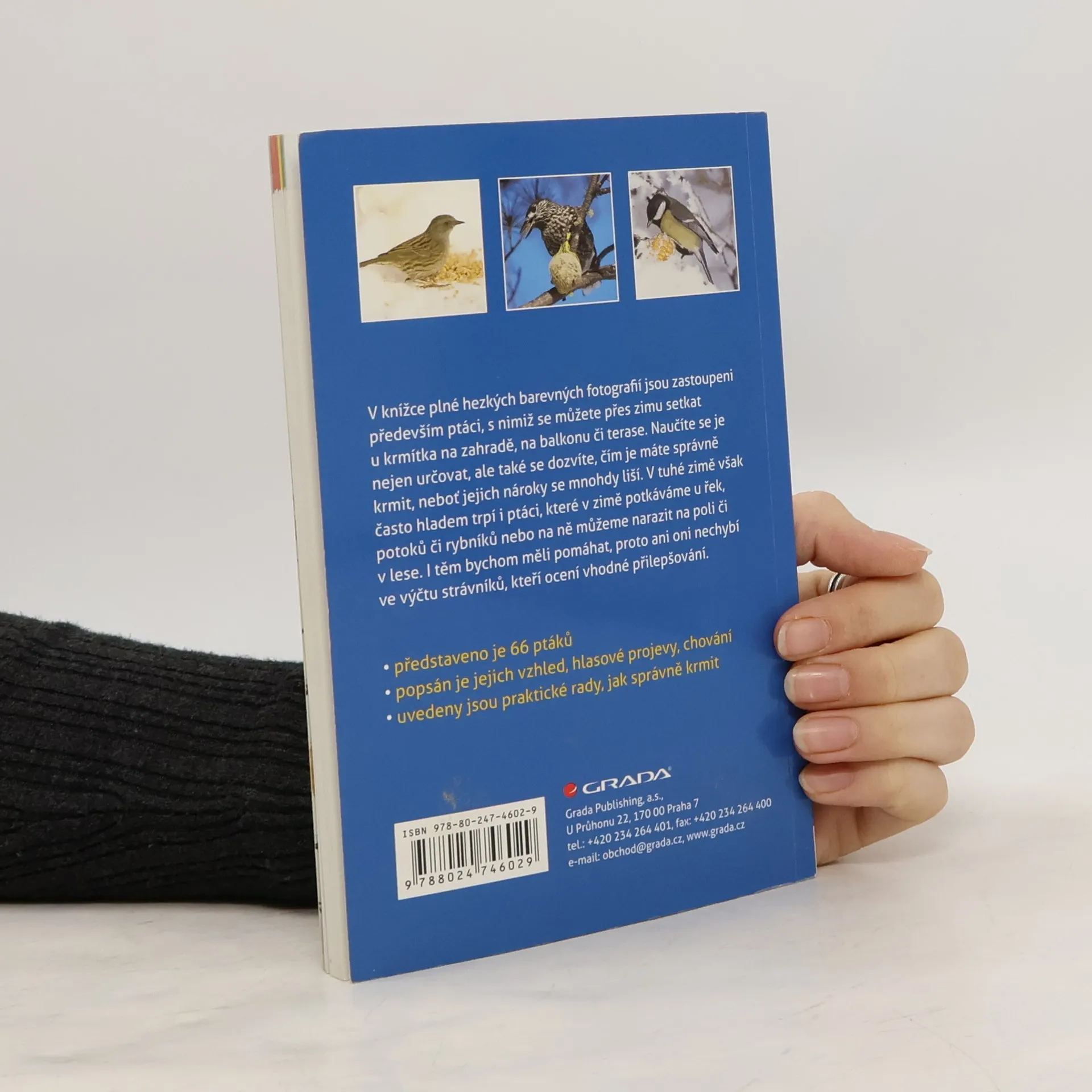 Knížka plná hezkých fotografií představuje několik desítek ptáků, které můžete pozorovat především u krmítka na zahradě, balkonu či terase, ale jsou tu zobrazeni i ti, kteří žijí u vodních toků a rybníků nebo na poli či v lese. Také oni totiž často potřebují naši pomoc, aby přečkali nepříznivé období. Popsán je vzhled uvedených ptáků, jejich hlasový projev a výskyt. Dozvíte se leccos o jejich chování, proč někteří přilétají ke krmení v hejnu, a někteří jednotlivě, kdo je typ hašteřivý a kdo spíše kliďas, kdo je masožravec a kdo vegetarián, ale hlavně - čím se mají krmit.