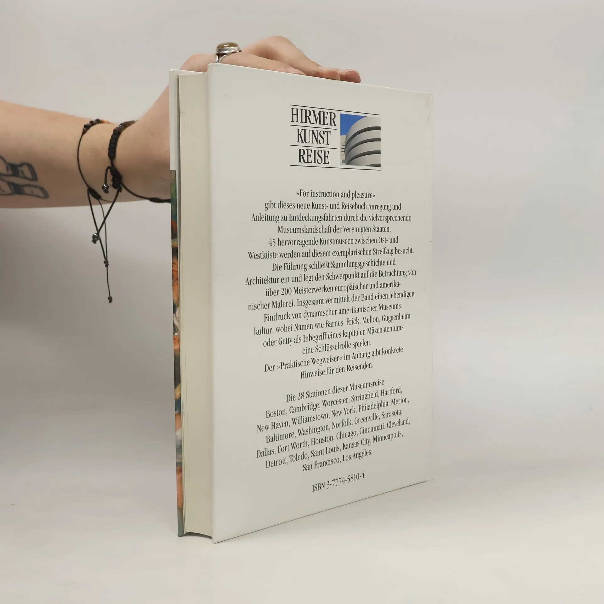 Ein Führer zu 45 bedeutenden Kunstmuseen in den USA von Neuengland bis Kalifornien kann, auch wenn er sich ausdrücklich auf Gemälde beschränkt, auf 329 Seiten nur einen 1. Eindruck geben. Dieser bringt auf begrenztem Raum viel Wesentliches zur amerikanischen Museumskultur und zu Geschichte, Architektur und Sammlungsschwerpunkten der einzelnen Museen, schlägt Rundgänge vor, bildet ca. 200 Exponate farbig ab (mit Erläuterungen) und informiert im Anhang über Adressen, Öffnungszeiten, Verkehrsverbindungen zu den Museen, Lagepläne und Grundrisse der wichtigsten Museen. - Als Kunstführer und attraktiver Bildband einsetzbar. (LK/HL: Ittekkot)
