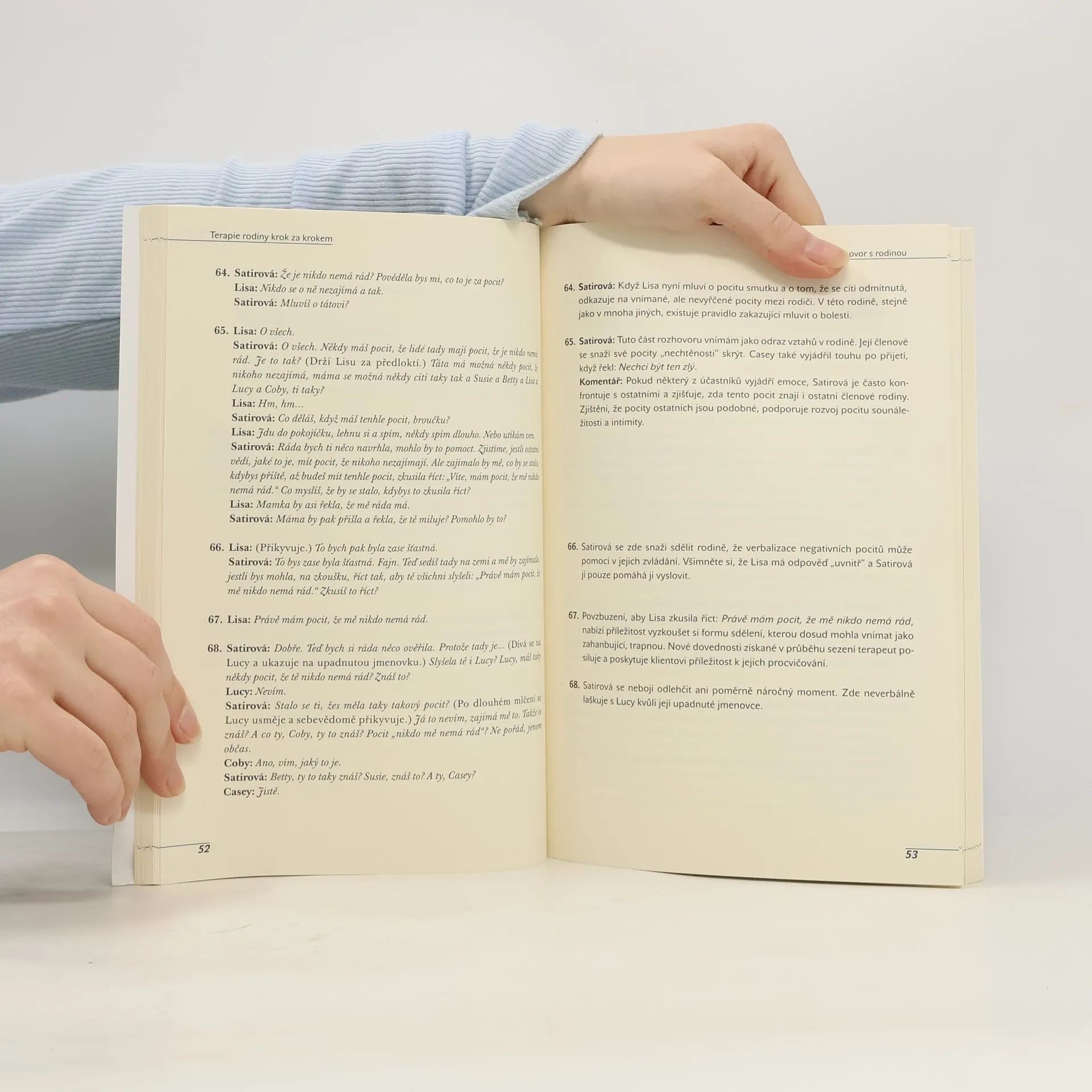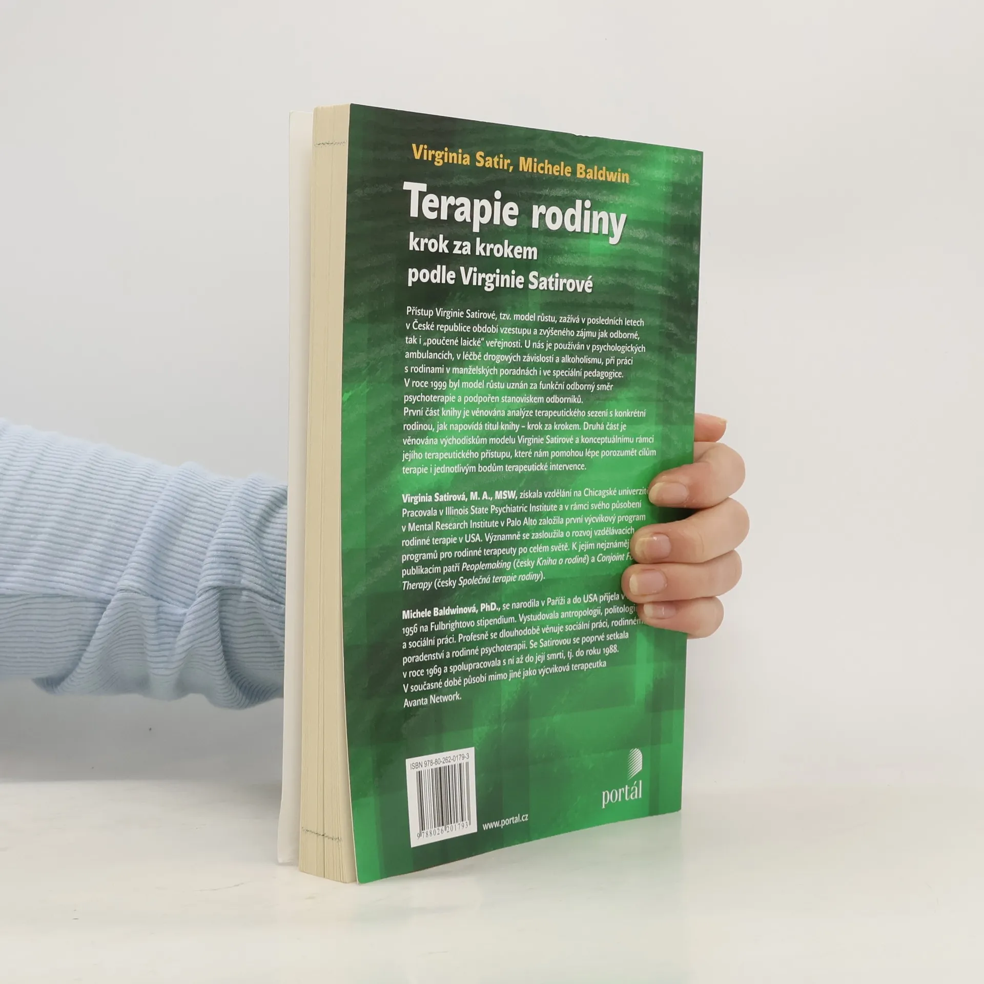 Přístup Virginie Satirové, známý jako model růstu, v posledních letech v ČR zažívá vzestup zájmu odborné i laické veřejnosti. Tento model se používá v psychologických ambulancích, při léčbě závislostí, v manželských poradnách a ve speciální pedagogice. V roce 1990 byl uznán jako funkční směr psychoterapie. První část knihy analyzuje terapeutické sezení s rodinou, přičemž sudé strany obsahují autentické záznamy a liché strany komentáře a postřehy. Druhá část se zaměřuje na východiska Satirové modelu a konceptuální rámec jejího terapeutického přístupu, což pomáhá lépe porozumět cílům terapie a jednotlivým bodům intervence. Virginia Satirová, M.A., MSW, studovala na Chicagské univerzitě a pracovala v Illinois State Psychiatric Institute. V Mental Research Institute v Palo Alto založila první výcvikový program rodinné terapie v USA a významně přispěla k rozvoji vzdělávacích programů pro rodinné terapeuty po celém světě. Mezi její známé publikace patří Peoplemaking a Conjoint Family Therapy. Michele Baldwin, PhD., se narodila v Paříži a do USA přišla v roce 1956 na Fulbrightovo stipendium. Vystudovala antropologii, politologii a sociální práci. Dlouhodobě se věnuje sociální práci a rodinné psychoterapii a se Satirovou spolupracovala až do její smrti v roce 1988. Nyní působí jako výcviková terapeutka a přednáší na Virginia Satir International Training Institute.