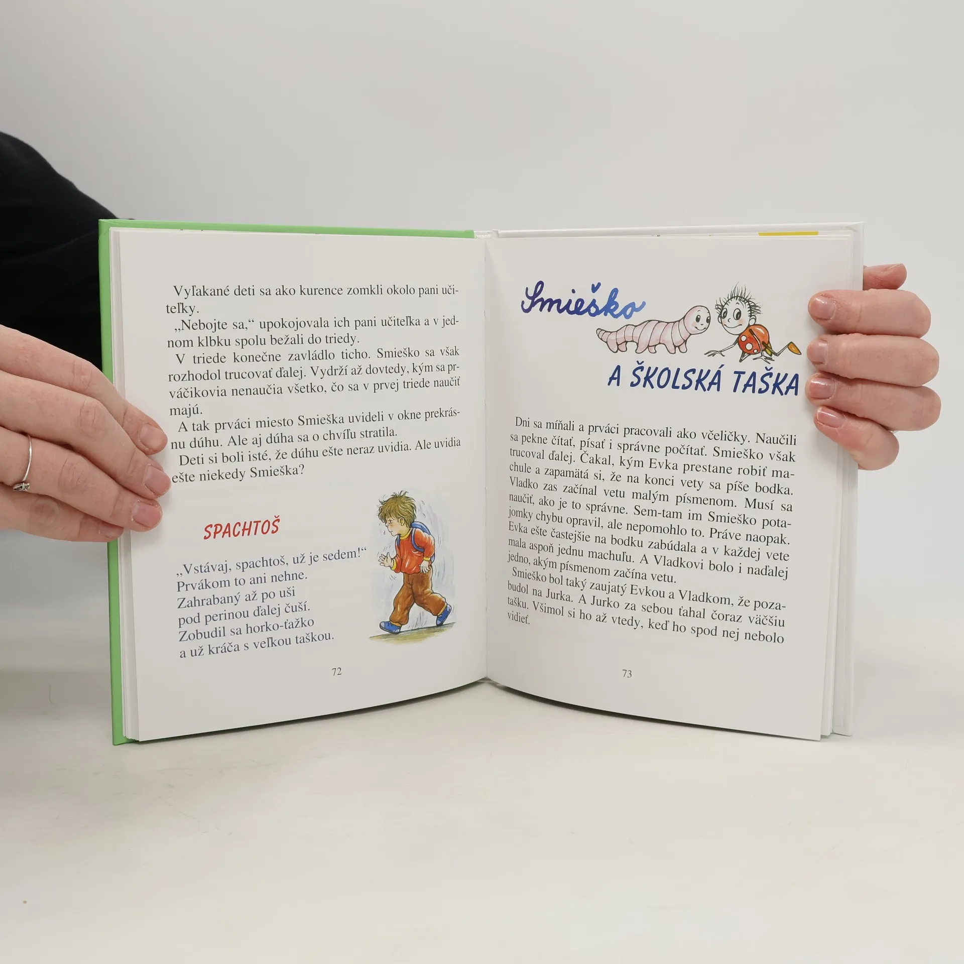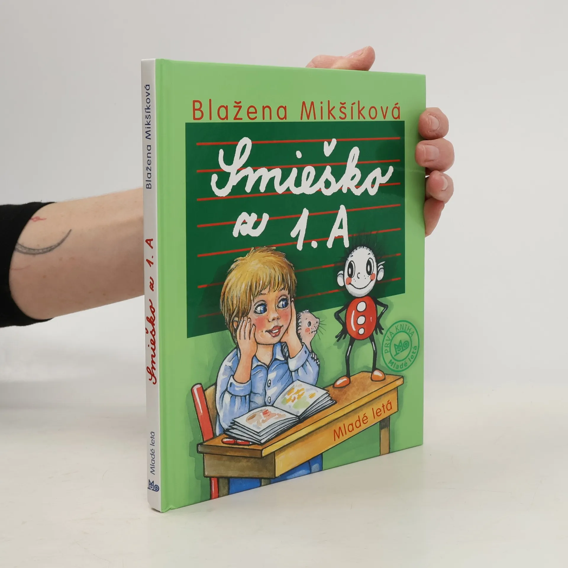Pani učiteľka z 1.A triedy sa veľmi teší na svojich nových prváčikov. Verí, že v jej triede bude deťom naozaj veselo, a to najmä vďaka škriatkovi Smieškovi, ktorého však vidia iba deti. Nanešťastie tento rok sa Smieško deťom akosi neukazuje. Napokon Jurko nakreslil dve veľké oči, nos a ústa a stala sa prečudesná vec: to okaté čudo sa samo dokreslilo na malého človiečika-panáčika, ušlo z výkresu a začalo tancovať na stole. Deti sa rozosmiali a odvtedy bolo v triede veselo, ba niekedy aj viac, ako bolo treba. V tejto veselej prváckej knižke si prečítate kopu ďalších kúskov výmyselného Smieška a nájdete v nej aj milé krátke básničky.