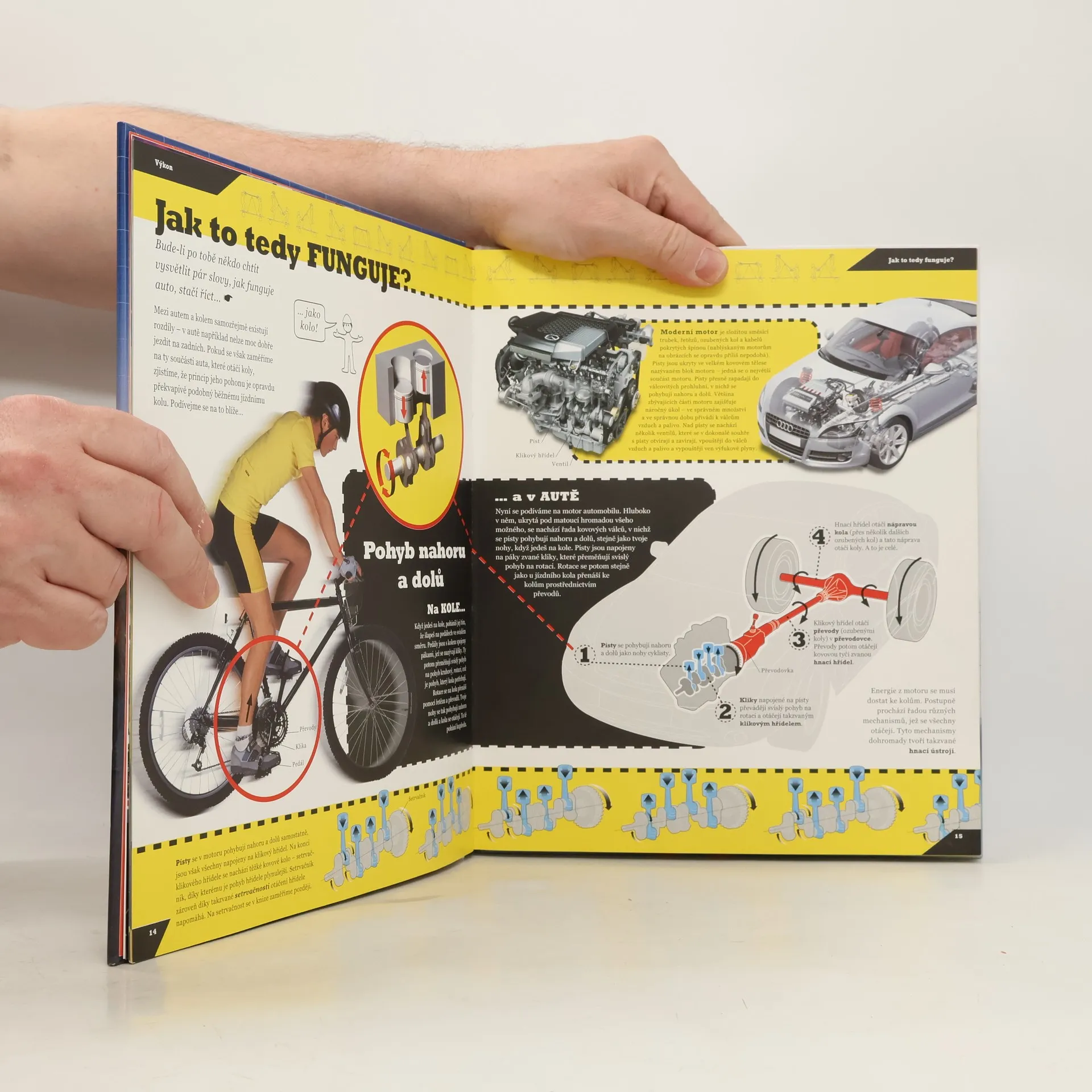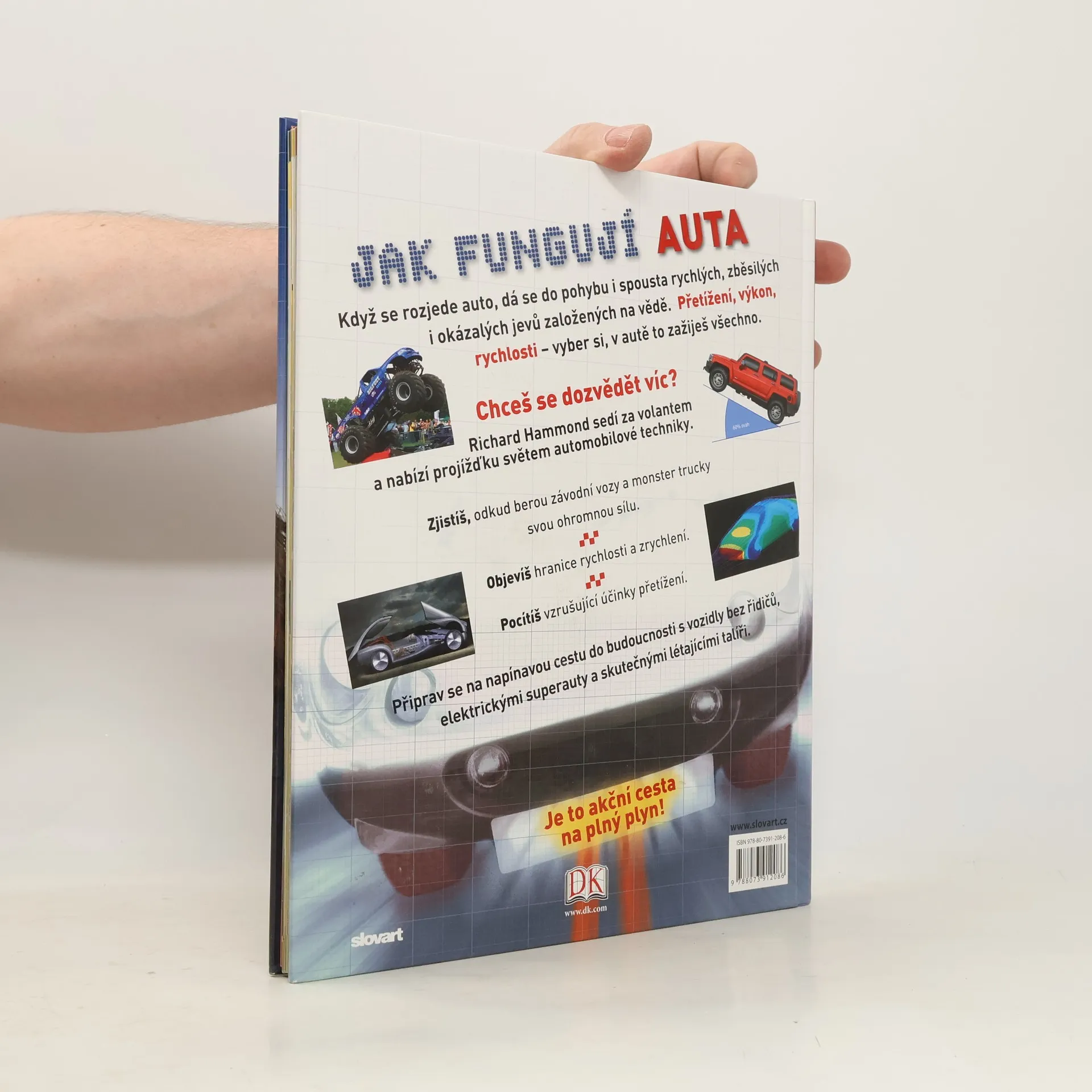 Fungování automobilů je rozsáhlé téma rozdělené na čtyři kapitoly: Výkon, Rychlost, Jízdní vlastnosti a Technika. Každá kapitola obsahuje vše potřebné, aby se z malého obdivovatele stal opravdový odborník na automobily. Jak funguje turbodmychadlo, jak se vyrábí benzin, z čeho se skládá převodovka, proč brzdy vozů Formule 1 po zastavení žlutě září. Představy aut, v jakých se možná jednou bude jezdit – napínavá cesta do budoucnosti s vozidly bez řidičů, elektrickými superauty a skutečnými létajícími talíři.