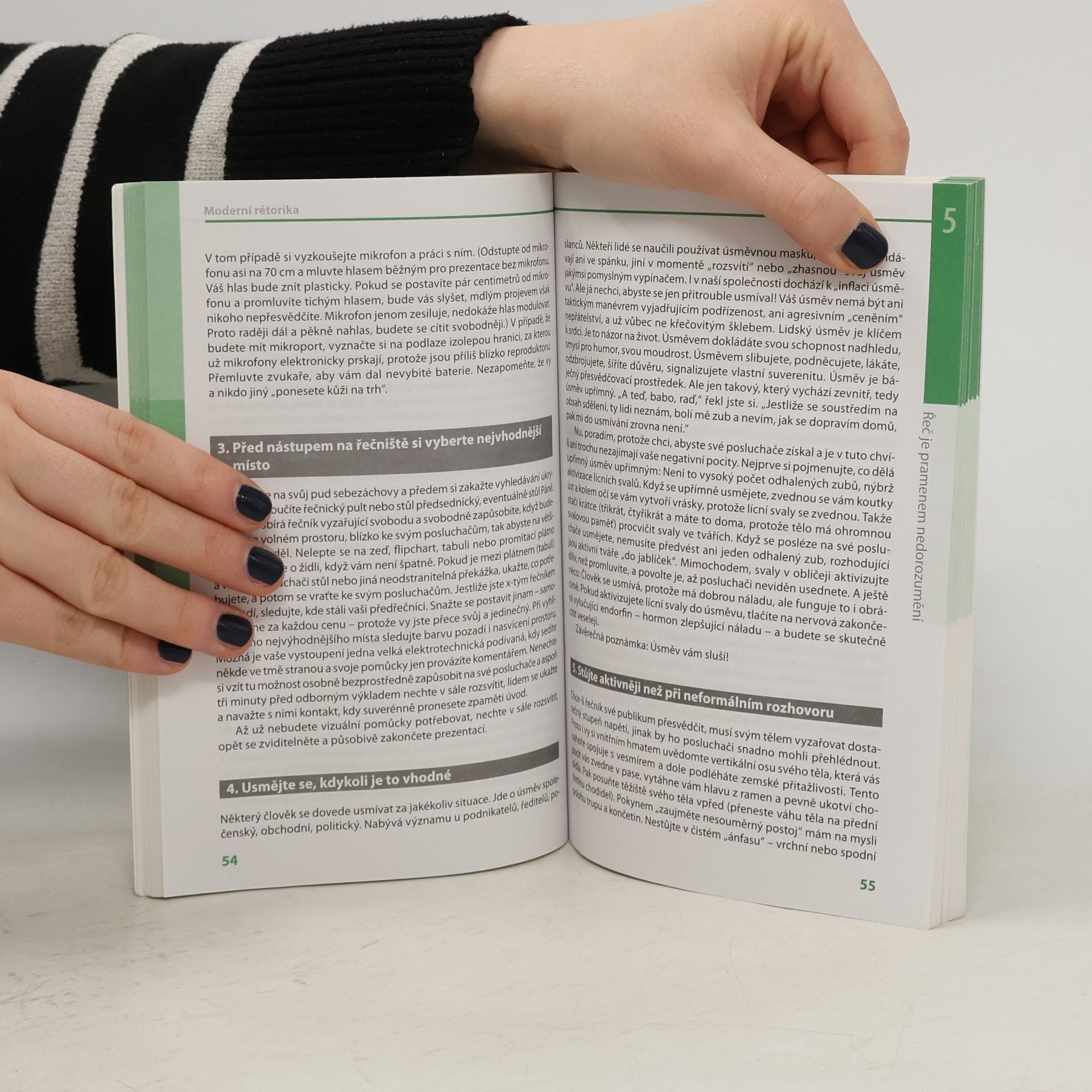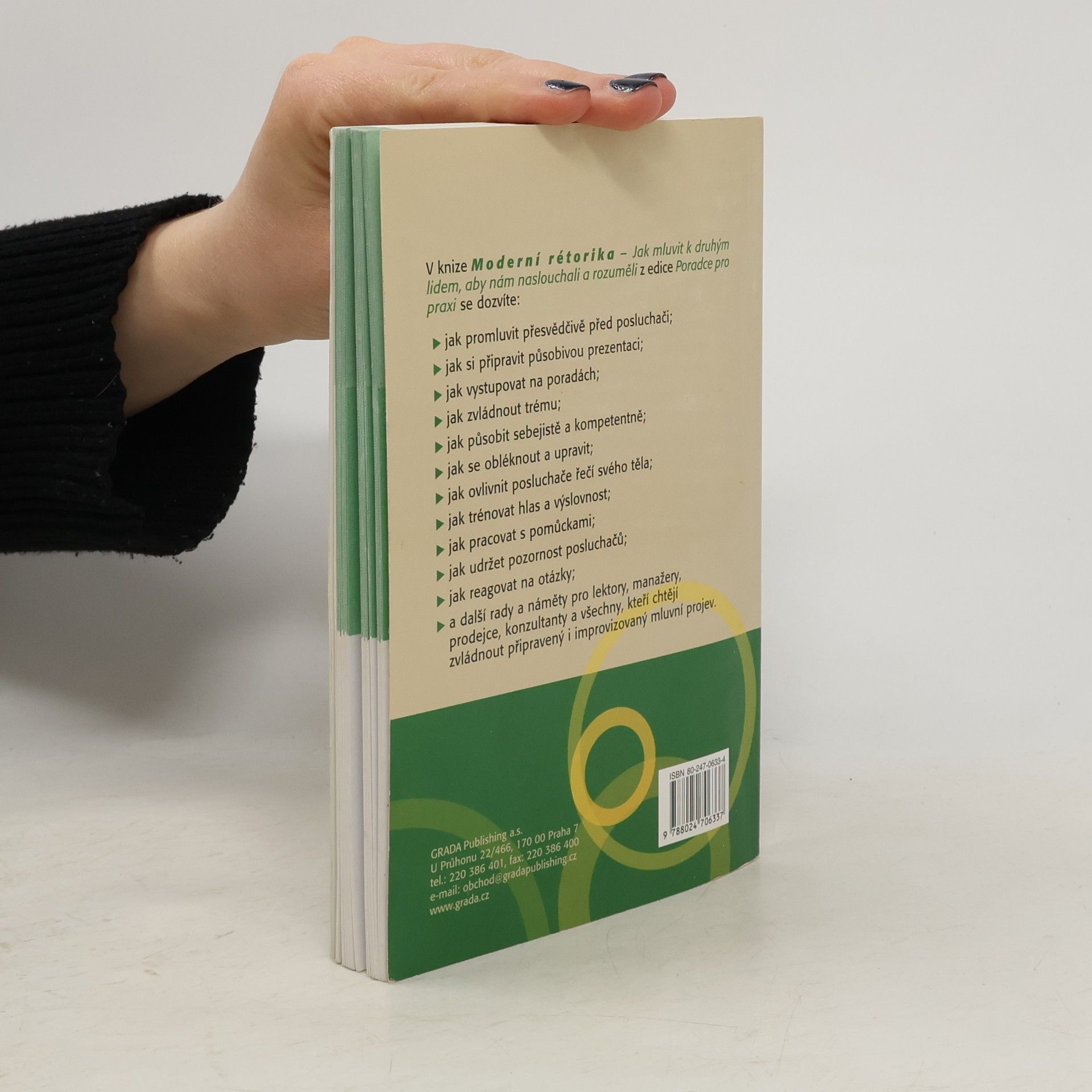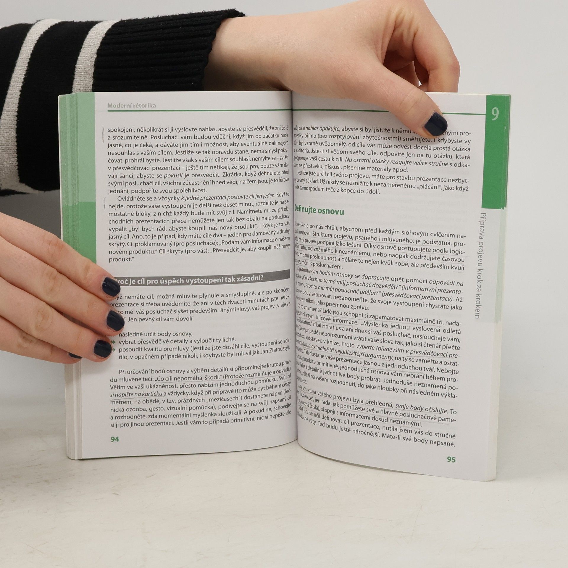 Kniha seznamuje se všemi prvky úspěšného přesvědčování od image a etikety mluvčího přes neverbální komunikaci po vlastní zřetelný a srozumitelný mluvený projev. Obsah publikace plně vystihuje její podnázev "Jak mluvit k druhým lidem, aby nám naslouchali a rozuměli", protože technikám vlastní rétoriky jsou věnovány z desíti kapitol pouze tři. Ty se zabývají hlasovým tréninkem, jazykovými prostředky spisovné češtiny a přípravou na vlastní projev. Kniha je doplněna Prezentačním desaterem a přehledem doporučené literatury.