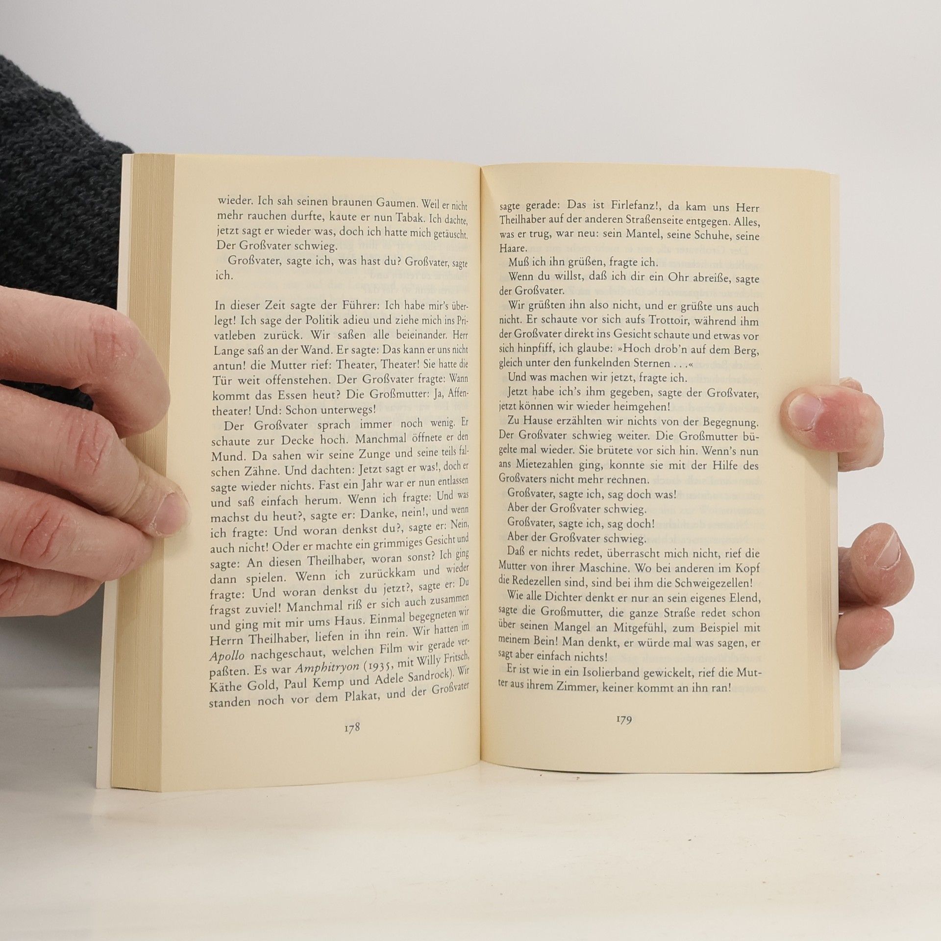 Der Enkel Gert Hofmann geht als Kind jeden Tag mit dem Großvater ins Kino (23 Sitzplätze, viele Stehplätze), wenn der zum Stummfilm erzählt und Klavier spielt. 'Aufpassen und nicht schlafen jetzt, wir kommen an eine sehr schöne Stelle!' ruft er in den unruhigen Zuschauerraum und bringt, sein Bambusstückchen in der Hand, den Leuten die Romanze auf der 'Hintertreppe' zwischen Fritz Kortner und Henny Porten nahe. Dabei fühlt er sich als Künstler und zu Höherem berufen. Dann kommt der erste Tonfilm nach Limbach. Der Kinobesitzer hofft, mit den sprechenden Bildern mehr Zuschauer ins Kino zu locken. Der Film und der Kinoerzähler sind von da an Feinde: je lauter der eine tönt, desto weniger darf der andere sagen. Bis sich die Nazis in Limbach breitmachen: da hofft der Großvater, daß 'die Bewegung' den deutschen Stummfilm zu ihrer Sache macht - Der Roman wurde von Bernhard Sinkel mit Armin Mueller-Stahl in der Rolle des Großvaters verfilmt.
