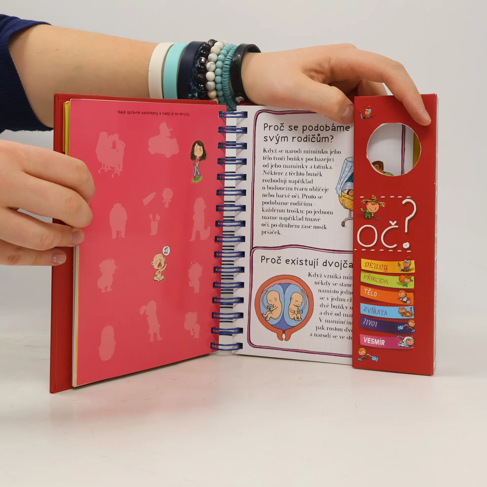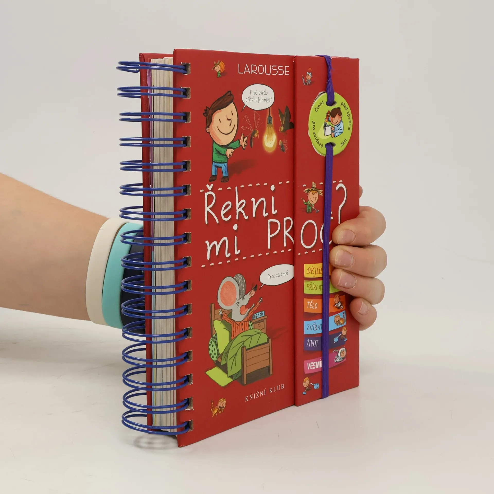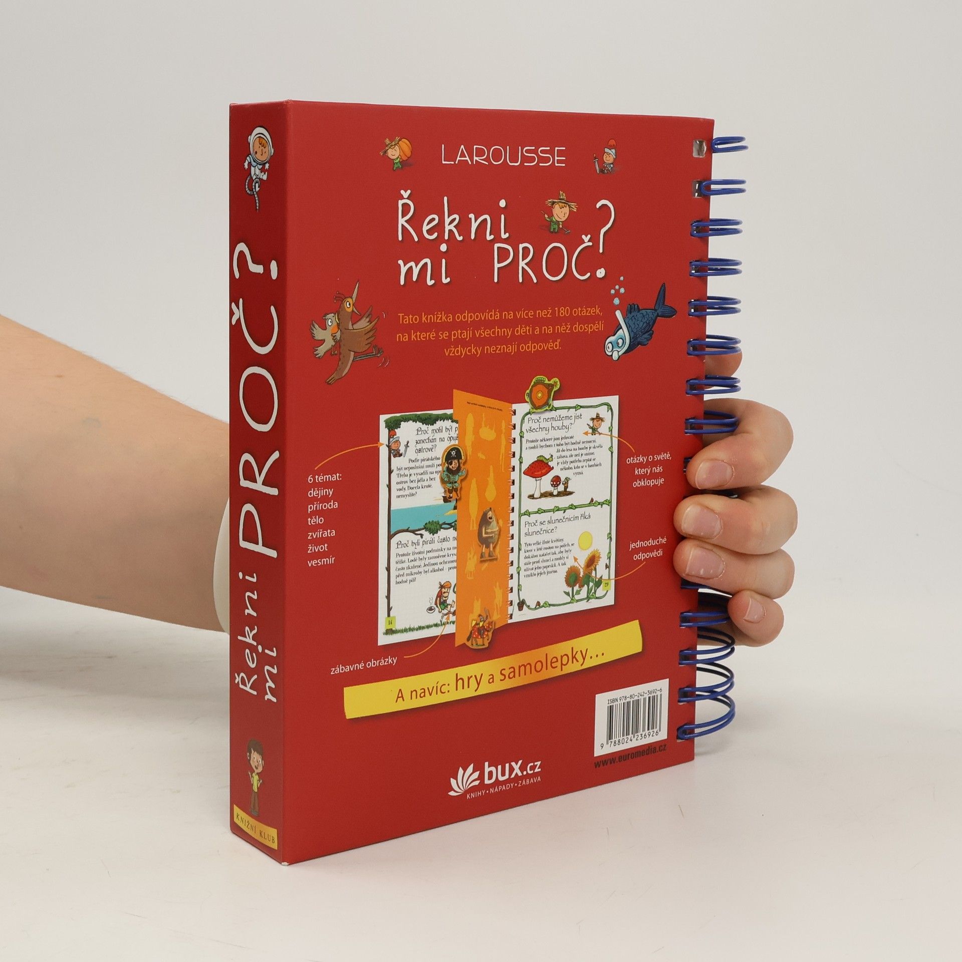 Knížka v kroužkové vazbě má 118 stránek a nacházejí se v ní odpovědi na 180 běžných dětských otázek. Jsou seřazené podle témat do šesti oblastí: dějiny, příroda, lidské tělo, zvířata, život a vesmír. Dozvíte se například, proč je nebe modré, proč Egypťané stavěli pyramidy, proč chodíme do školy, proč se potíme, proč kočky předou a spoustu, spoustu dalšího. Každou tematickou kapitolu navíc doplňují kvízy a samolepky.