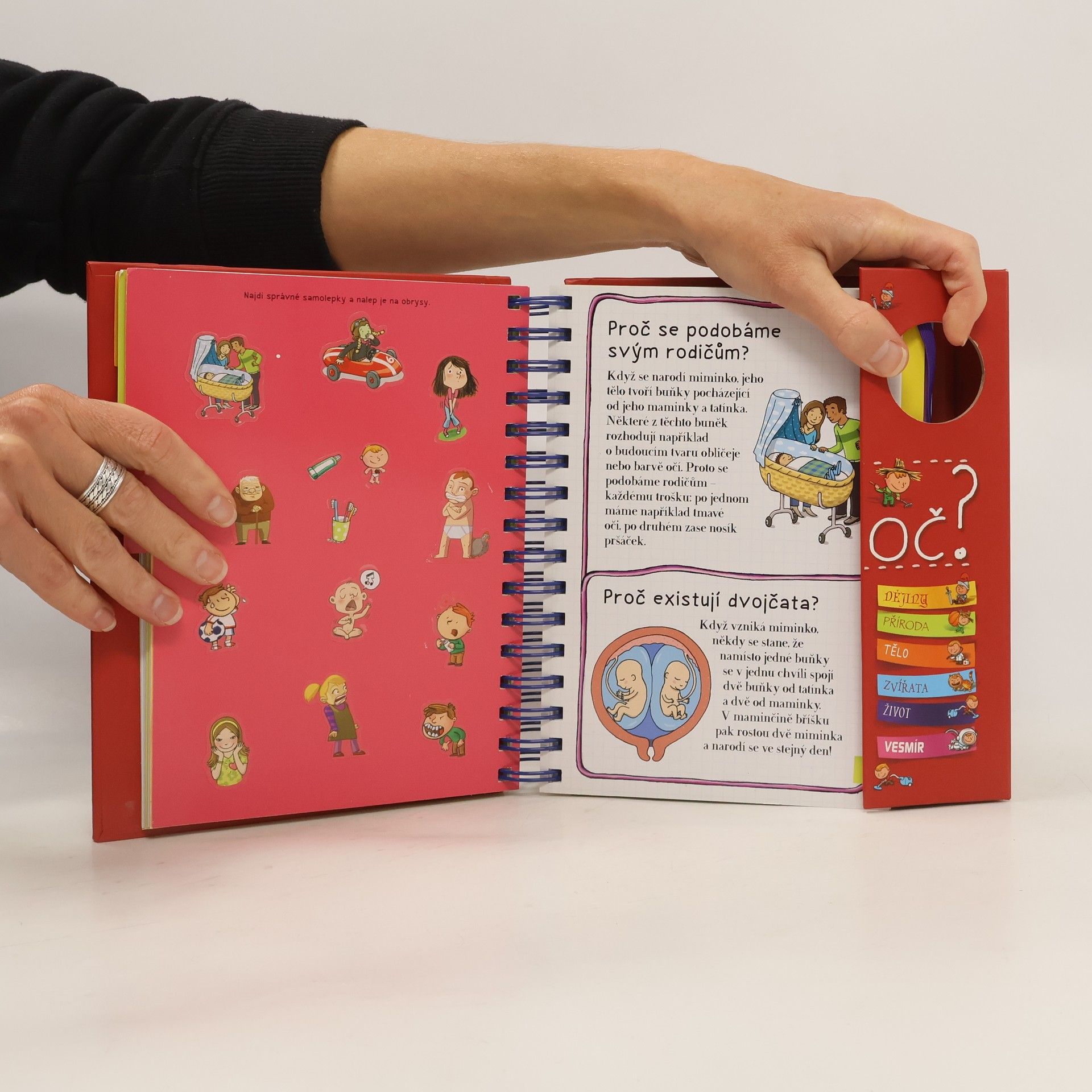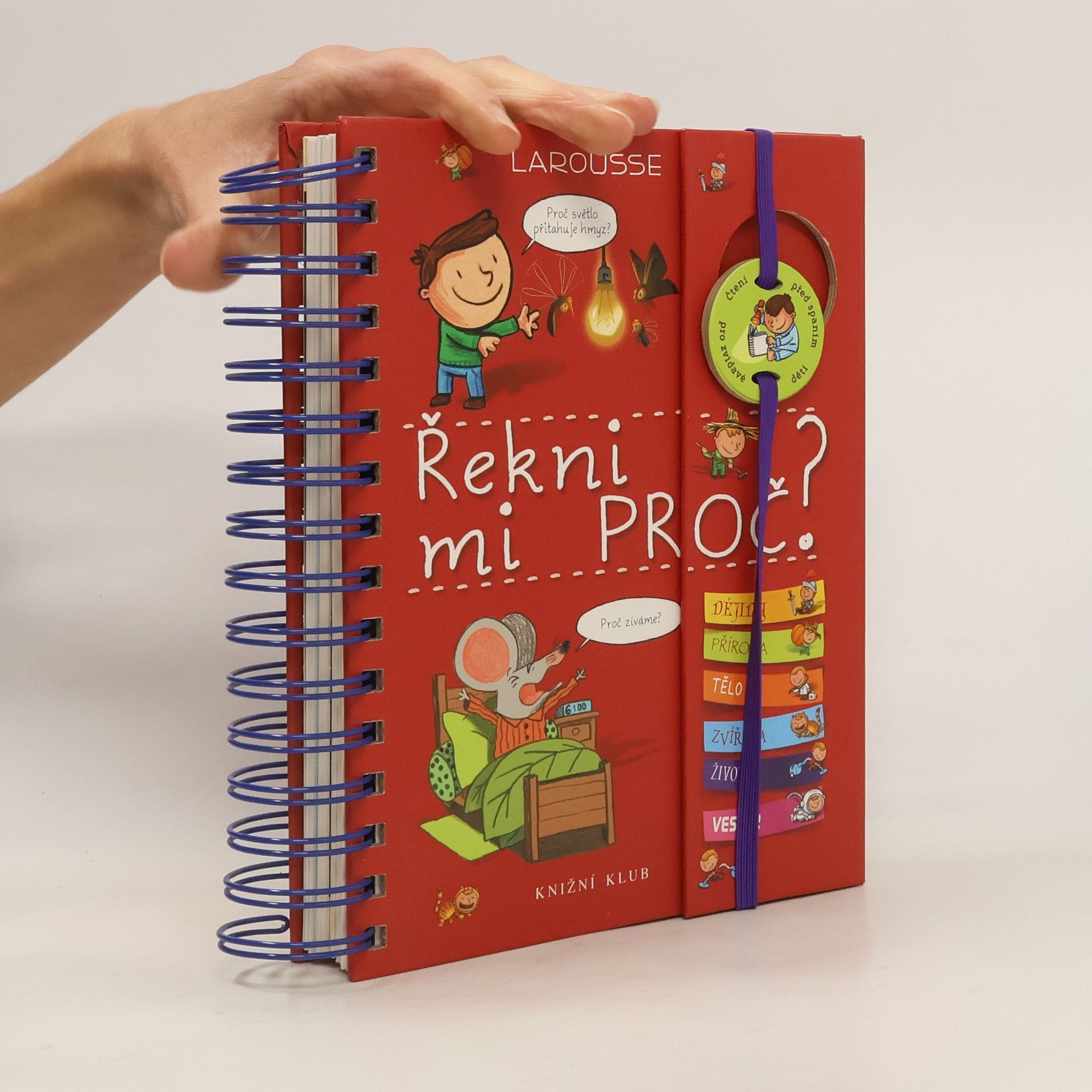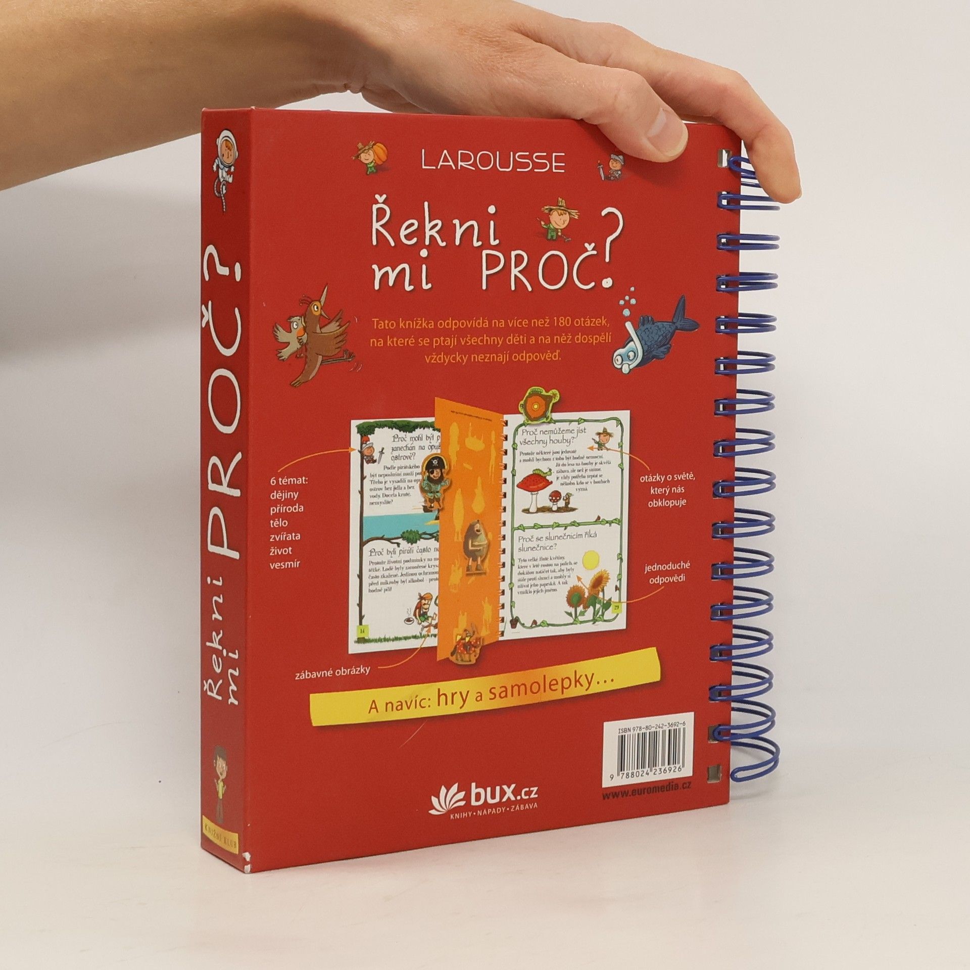 Knížka v kroužkové vazbě má 118 stránek a nacházejí se v ní odpovědi na 180 běžných dětských otázek. Jsou seřazené podle témat do šesti oblastí: dějiny, příroda, lidské tělo, zvířata, život a vesmír. Dozvíte se například, proč je nebe modré, proč Egypťané stavěli pyramidy, proč chodíme do školy, proč se potíme, proč kočky předou a spoustu, spoustu dalšího. Každou tematickou kapitolu navíc doplňují kvízy a samolepky.