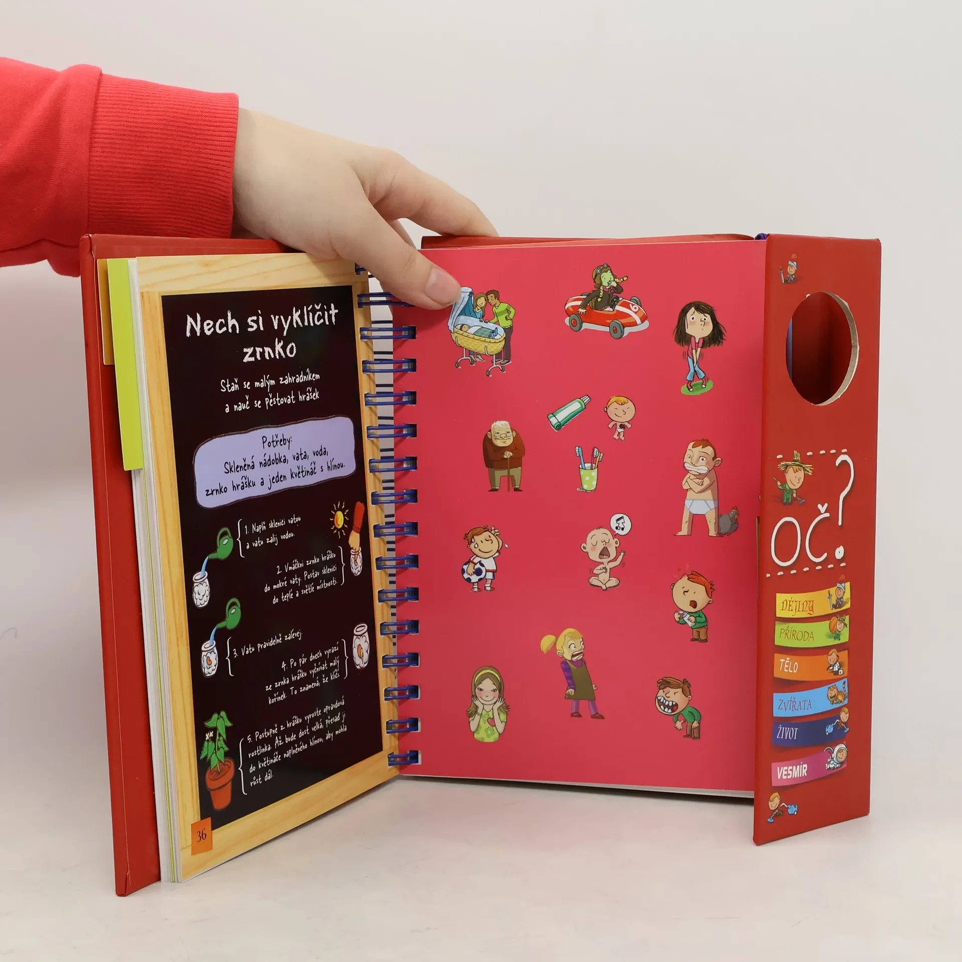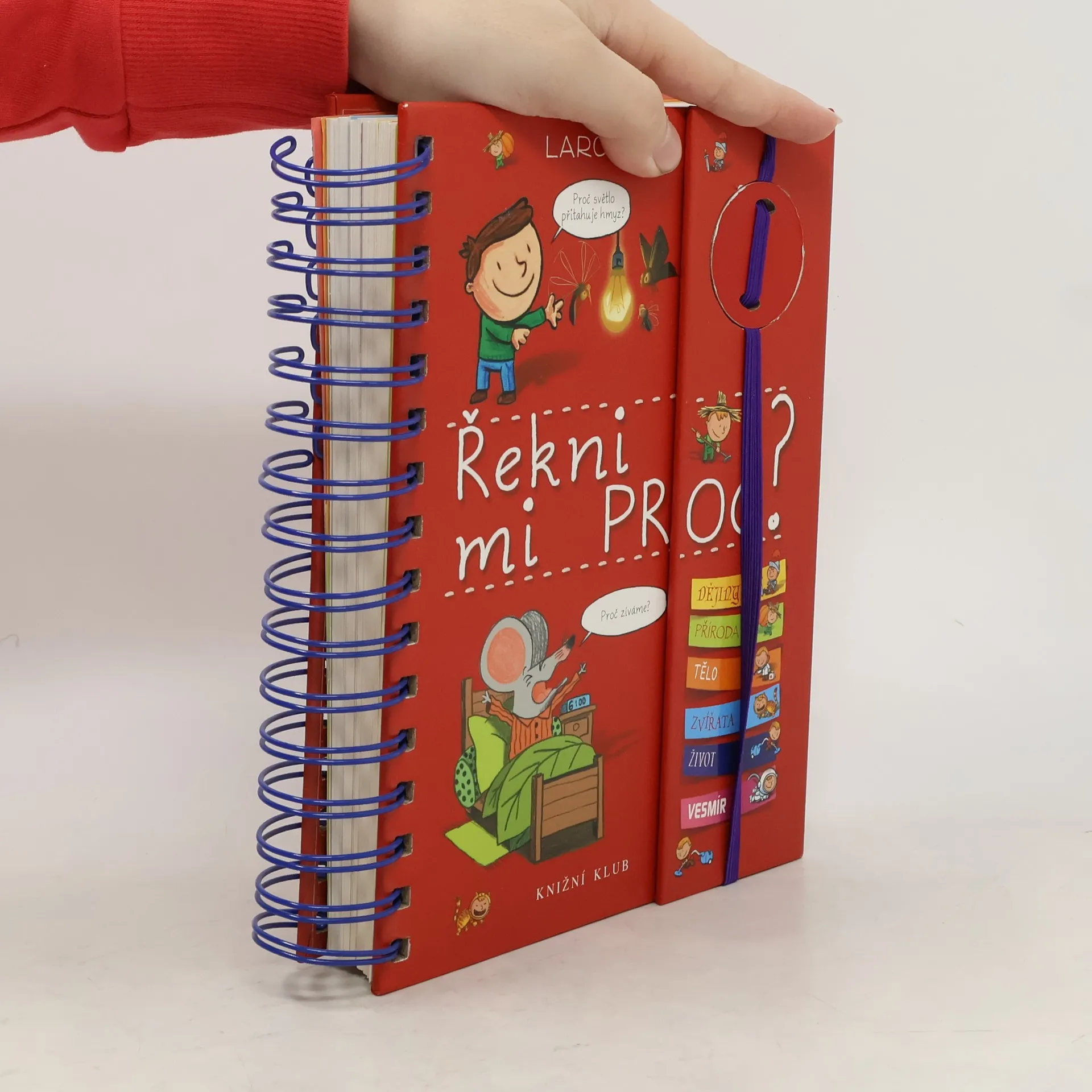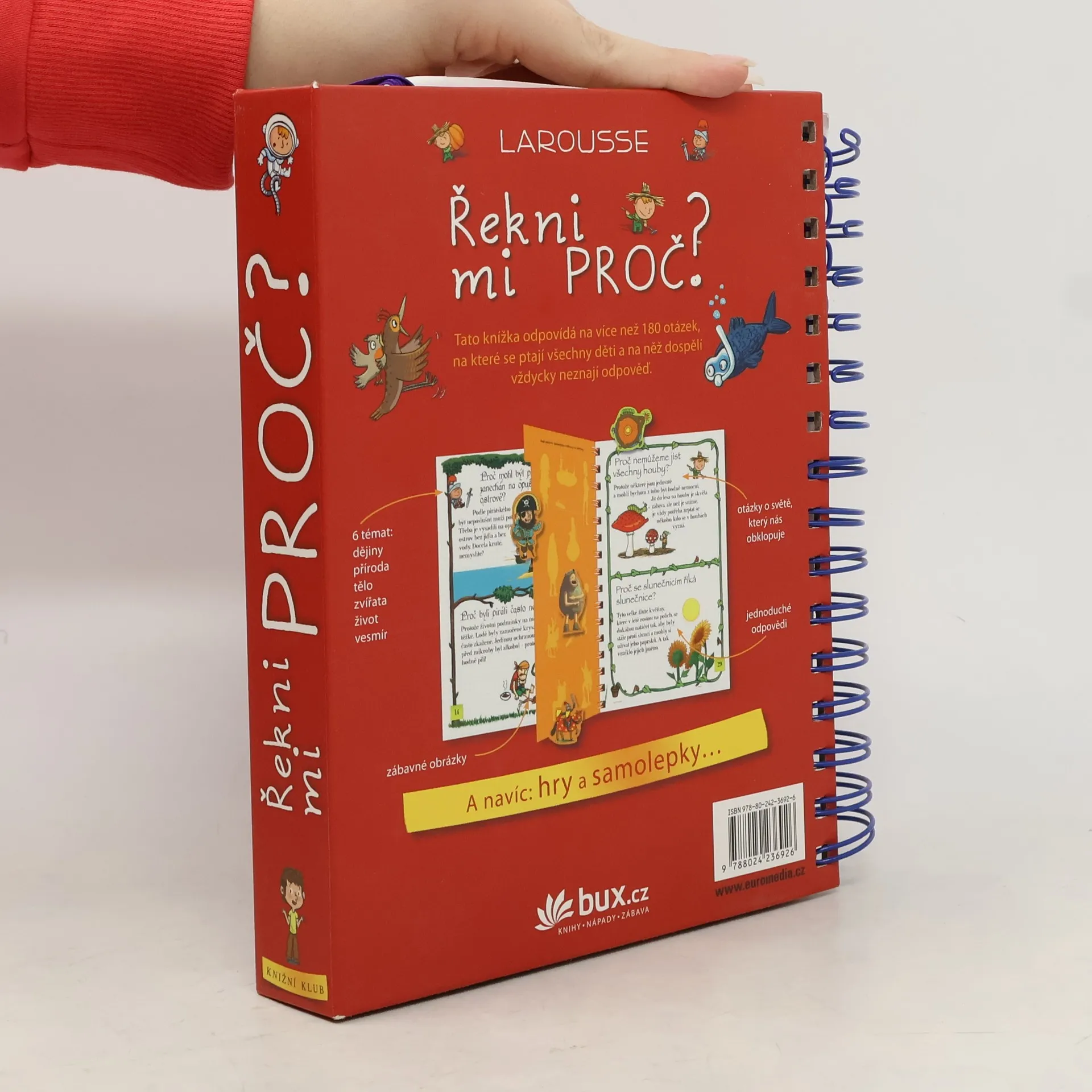 Knížka v kroužkové vazbě má 118 stránek a nacházejí se v ní odpovědi na 180 běžných dětských otázek. Jsou seřazené podle témat do šesti oblastí: dějiny, příroda, lidské tělo, zvířata, život a vesmír. Dozvíte se například, proč je nebe modré, proč Egypťané stavěli pyramidy, proč chodíme do školy, proč se potíme, proč kočky předou a spoustu, spoustu dalšího. Každou tematickou kapitolu navíc doplňují kvízy a samolepky.