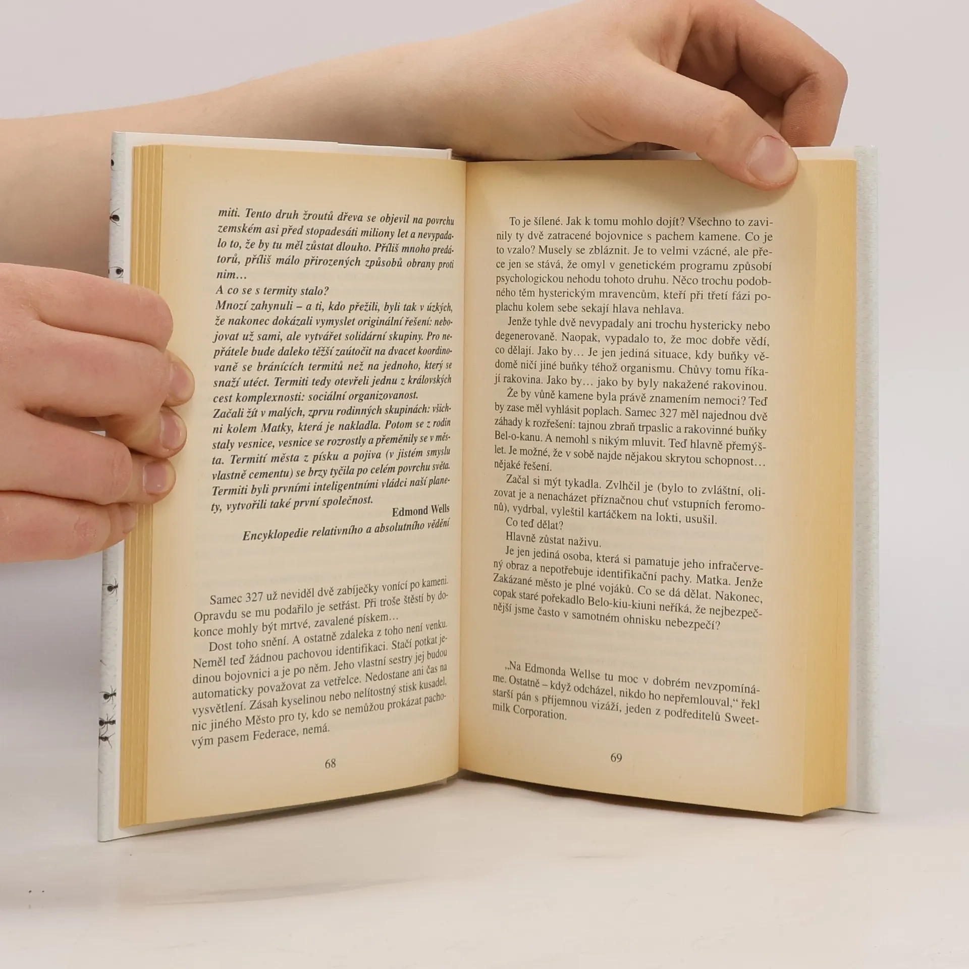 Dávejte pozor, kam šlapete! Během několika vteřin, které potřebujete k přečtení tohoto odstavce, se narodí 40 lidí… a 700 milionů mravenců. Malí, pro nás takřka neviditelní, a přesto úchvatní tvoři vytvořili od doby, kdy se před stovkou milionů let na Zemi objevili, zcela dokonalou a všestranně fungující civilizaci. Budují města a federace, bojují o území, společnými silami odrážejí útoky vetřelců a predátorů. Zakládají houbová políčka nebo mšičí farmy a svá hnízda dokážou utkat z listí. Vyznávají kastovní systém a některé druhy si otrokářským způsobem podrobují jiné. Přestože představivost lidí vždy s oblibou hledala paralelní světy po nejrůznějších koutech vesmíru, na fantastickou existenci těch, kteří žijí v poloskrytu pod našima nohama, se zapomínalo. Jsou mravenci anarchisté, roajalisté anebo se jejich organizace blíží totalitnímu zřízení? Jak chápou čas? Co o nich vlastně víme? A vědí oni o nás? Werberův román Mravenci bývá právem označován jako realistická sci-fi: to nejúžasnější je na něm právě to, co je skutečné. Po jeho přečtení už nikdy nebudete vnímat svět tak jako dosud - stejně jako hrdina knihy, nezaměstnaný pařížský zámečník Jonathan Wells, který po svém excentrickém strýci zdědil suterénní byt a tajemné varování: Hlavně nikdy nechoď do sklepa!