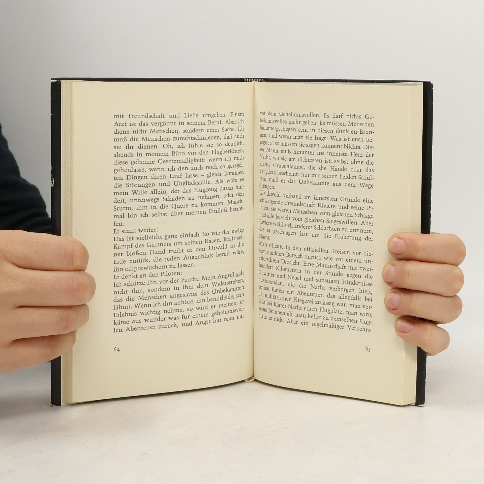 In seinem 1931 erstmals erschienenen Nachtflug gestaltet Saint-Exupéry eigenes Erleben zum Roman: als Betriebsleiter der argentinischen ›Aeropostale‹ hatte er selbst zwei Jahre lang Nachtflüge ausgeführt. Im Mittelpunkt steht der verantwortliche Flugleiter der südamerikanischen Strecken, Rivière - sein Vorbild ist Saint-Exupérys Fluglehrer Didier Daurat -, der Ehrgeiz, Mut und berufliche Befähigung seiner Piloten mit Umsicht und Härte nutzt, um einer Idee, »etwas, was das Menschenleben an Wert übertrifft«, zu dienen. Der Einzelne stirbt; aber er überdauert in dem, was er getan hat: »Das Ziel«, gesteht sich Rivière, »ist vielleicht fragwürdig, aber die Tat befreit vom Tode.«