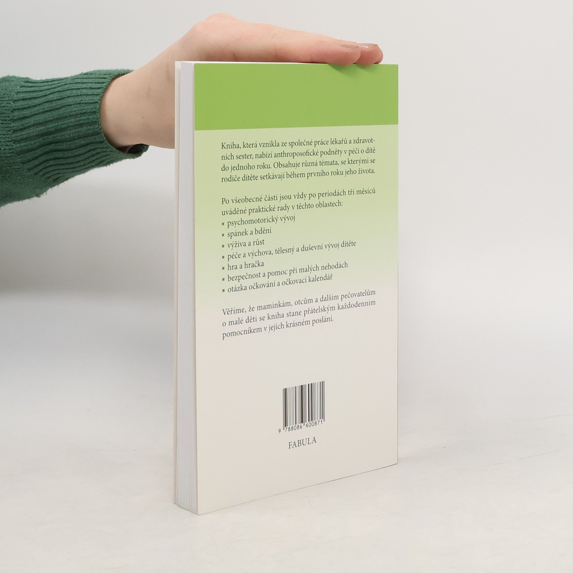 Po velkém zájmu, se kterým byl přijat v roce 2005 Průvodce péčí o děti od 1 do 4 let, nakladatelství Fabula vydává další knihu od stejných autorek. Kromě nich na knížce pracovali praktičtí lékaři a dětský lékař Edmond Schoorel a text byl obšírně probírán se skupinou matek, ošetřovatelů a dětských lékařů. Především do prvního roku dítěte působí nenápadná každodenní péče na dětský organismus nejhlouběji. Kniha obsahuje anthroposofický pohled na vyrůstající dítě, praktické rady ohledně výživy, bezpečí, pravidelnosti spánku a bdění, bezpečnosti a pomoci při různých zdravotních potížích, získání a zdravých smyslových vjemů a další témata, se kterými se rodiče setkávají během prvního roku života dítěte. Po všeobecné části jsou vždy po periodách tří měsíců uváděné praktické rady v těchto oblastech: - psychomotorický vývoj - spánek a bdění - výživa a růst - péče a výchova, tělesný a duševní vývoj dítěte - hra a hračka - bezpečnost a pomoc při malých nehodách - otázka očkování a očkovací kalendář
