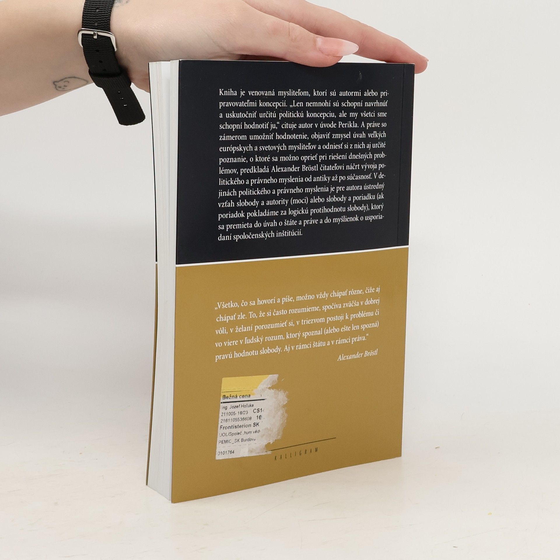 Kniha je venovaná mysliteľom, ktorí sú autormi alebo pripravovateľmi koncepcií. „Len nemnohí sú schopní navrhnúť a uskutočniť určitú politickú koncepciu, ale my všetci sme schopní hodnotiť ju,“ cituje autor v úvode Perikla. A práve so zámerom umožniť hodnotenie, objaviť zmysel úvah veľkých európskych a svetových mysliteľov a odniesť si z nich aj určité poznanie, o ktoré sa možno oprieť pri riešení dnešných problémov, predkladá Alexander Bröstl čitateľovi náčrt vývoja politického a právneho myslenia od antiky až po súčasnosť. V dejinách politického a právneho myslenia je pre autora ústredný vzťah slobody a autority (moci) alebo slobody a poriadku (ak poriadok pokladáme za logickú protihodnotu slobody), ktorý sa premieta do úvah o štáte a práve a do myšlienok o usporiadaní spoločenských inštitúcií.