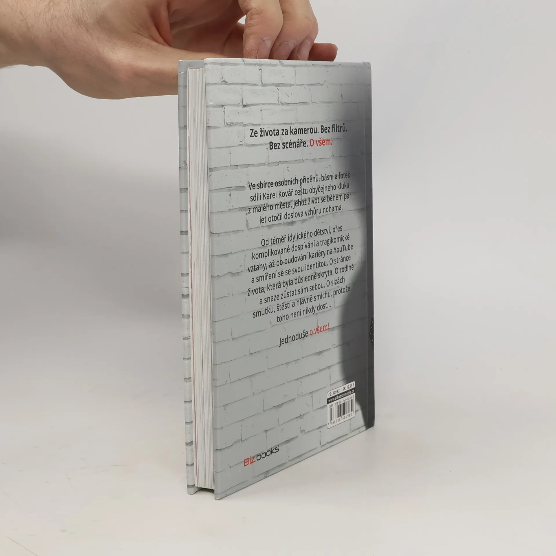 Bez filtrů. Bez scénáře. O všem. Ve sbírce osobních příběhů, básní a fotek sdílí Karel Kovář cestu obyčejného kluka z malého města, jehož život se během pár let otočil doslova vzhůru nohama. Od téměř idylického dětství, přes komplikované dospívání a tragikomické vztahy, až po budování kariéry na YouTube a smíření se se svou identitou. O stránce života, která byla důsledně skryta. O rodině a snaze zůstat sám sebou. O slzách smutku, štěstí a hlavně smíchu, protože toho není nikdy dost–… Jednoduše o všem!