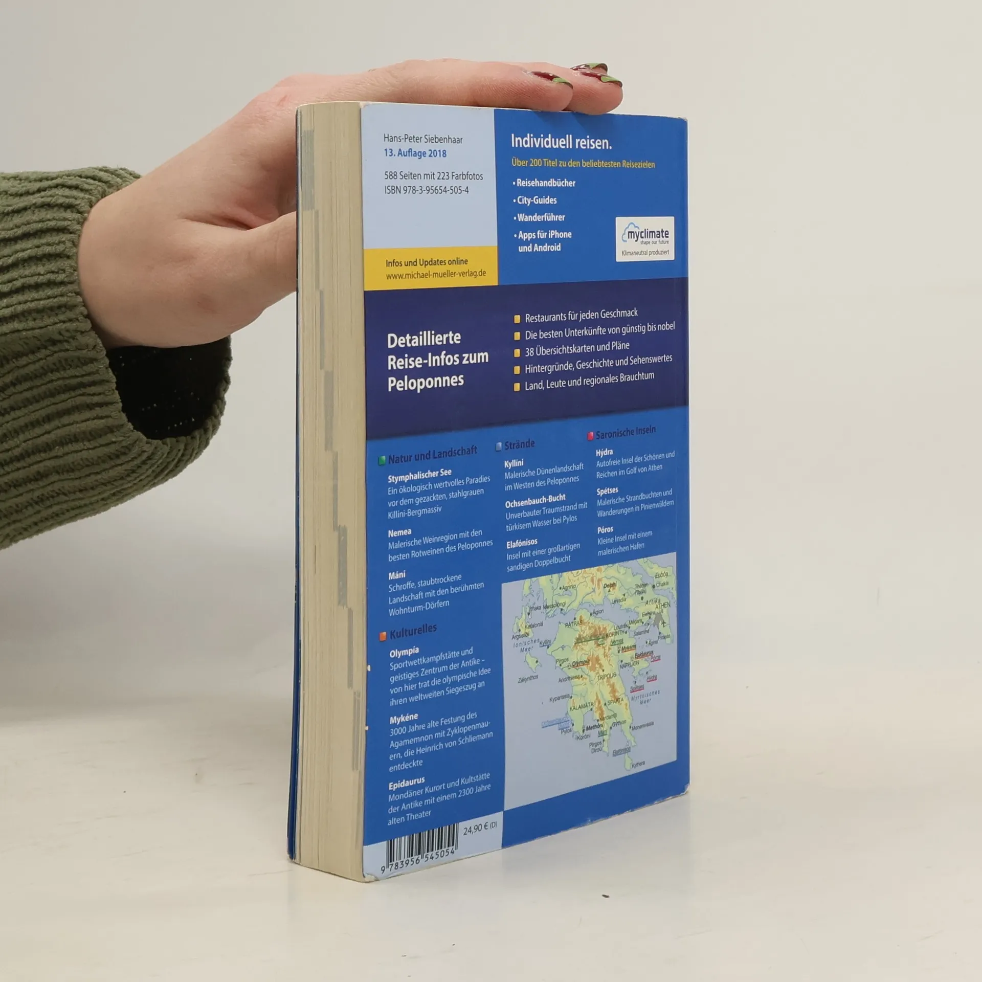 Lassen Sie sich von Griechenland und Peloponnes verzaubern, wie es unser Autor Hans-Peter Siebenhaar seit über 30 Jahren tut. In der 13. Auflage des Reiseführers „Peloponnes“ finden Sie auf 588 Seiten mit 223 Farbfotos seine Entdeckungen und Erfahrungen. Mit 38 Karten, einschließlich einer Peloponnes-Karte, sind Sie optimal orientiert und haben stets einen Überblick über Strände, Sehenswürdigkeiten, Restaurants und Unterkünfte. Über 140 ausführlich beschriebene Orte und Reiseziele wurden vor Ort akribisch recherchiert. Ökologisch und nachhaltig wirtschaftende Betriebe sind kenntlich gemacht, und zahlreiche Kurz-Essays bieten interessante Hintergrundinformationen. Die Geheimtipps des Autors eröffnen Ihnen sowohl Highlights als auch weniger bekannte Sehenswürdigkeiten. Praktische Tipps und Ratschläge runden den Reiseführer ab. Mit 112 Seiten Landeskunde erfahren Sie alles über Geographie, Tier- und Pflanzenwelt sowie Feste. Die wichtigsten griechischen Redewendungen und Begriffe sind ebenfalls enthalten. Besuchen Sie den Kanal von Korínth, Mykéne, Epídauros und viele mehr. Entspannen Sie an den schönsten Stränden oder entdecken Sie antike Ausgrabungsstätten. Der Reiseführer ist Ihr kompetenter Begleiter für einen individuellen und gelungenen Urlaub. Die Reiseführer des Michael-Müller-Verlags werden klimaneutral produziert.