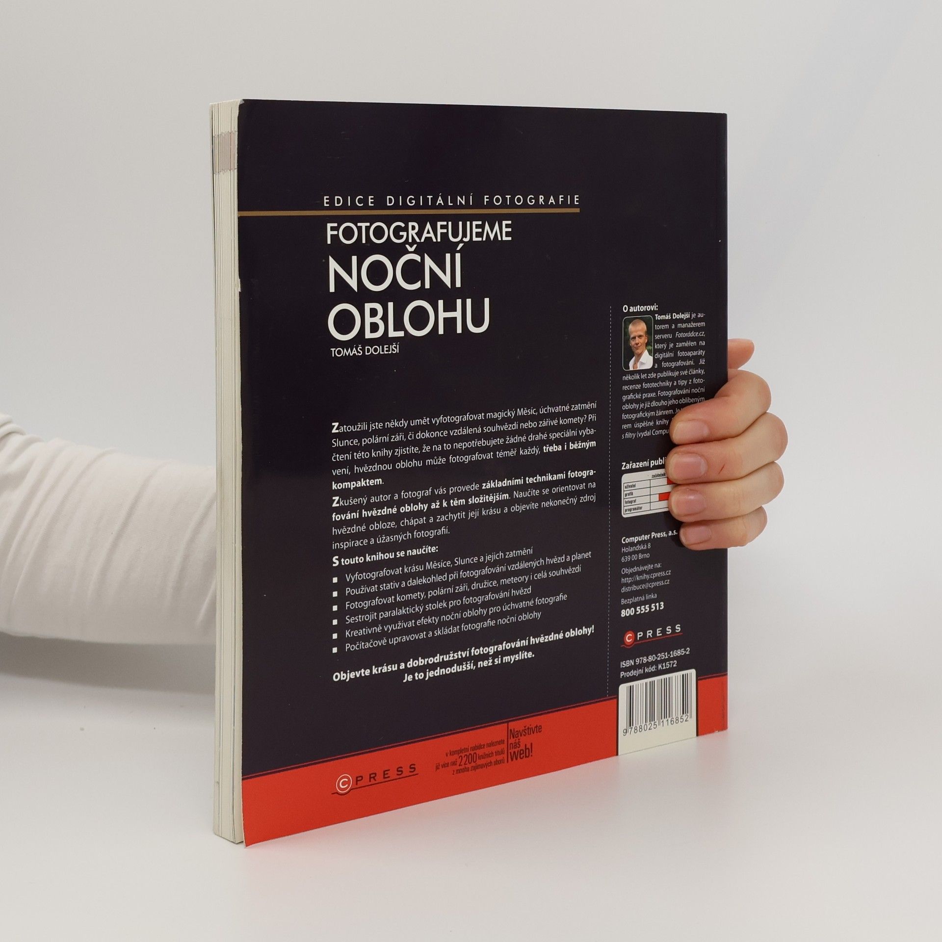 Zatoužili jste někdy umět vyfotografovat magický Měsíc, úchvatné zatmění Slunce, polární záři, či dokonce vzdálená souhvězdí nebo zářivé komety? Při čtení této knihy zjistíte, že na to nepotřebujete žádné drahé speciální vybavení, hvězdnou oblohu může fotografovat téměř každý, třeba i běžným kompaktem. Zkušený autor a fotograf vás provede základními technikami fotografování hvězdné oblohy až k těm složitějším. Naučíte se orientovat na hvězdné obloze, chápat a zachytit její krásu a objevíte nekonečný zdroj inspirace a úžasných fotografií. S touto knihou se naučíte: - Vyfotografovat krásu Měsíce, Slunce a jejich zatmění - Používat stativ a dalekohled při fotografování vzdálených hvězd a planet - Fotografovat komety, polární záři, družice, meteory i celá souhvězdí - Sestrojit paralaktický stolek pro fotografování hvězd - Kreativně využívat efekty noční oblohy pro úchvatné fotografie - Počítačově upravovat a skládat fotografie noční oblohy Objevte krásu a dobrodružství fotografování hvězdné oblohy! Je to jednodušší, než si myslíte.