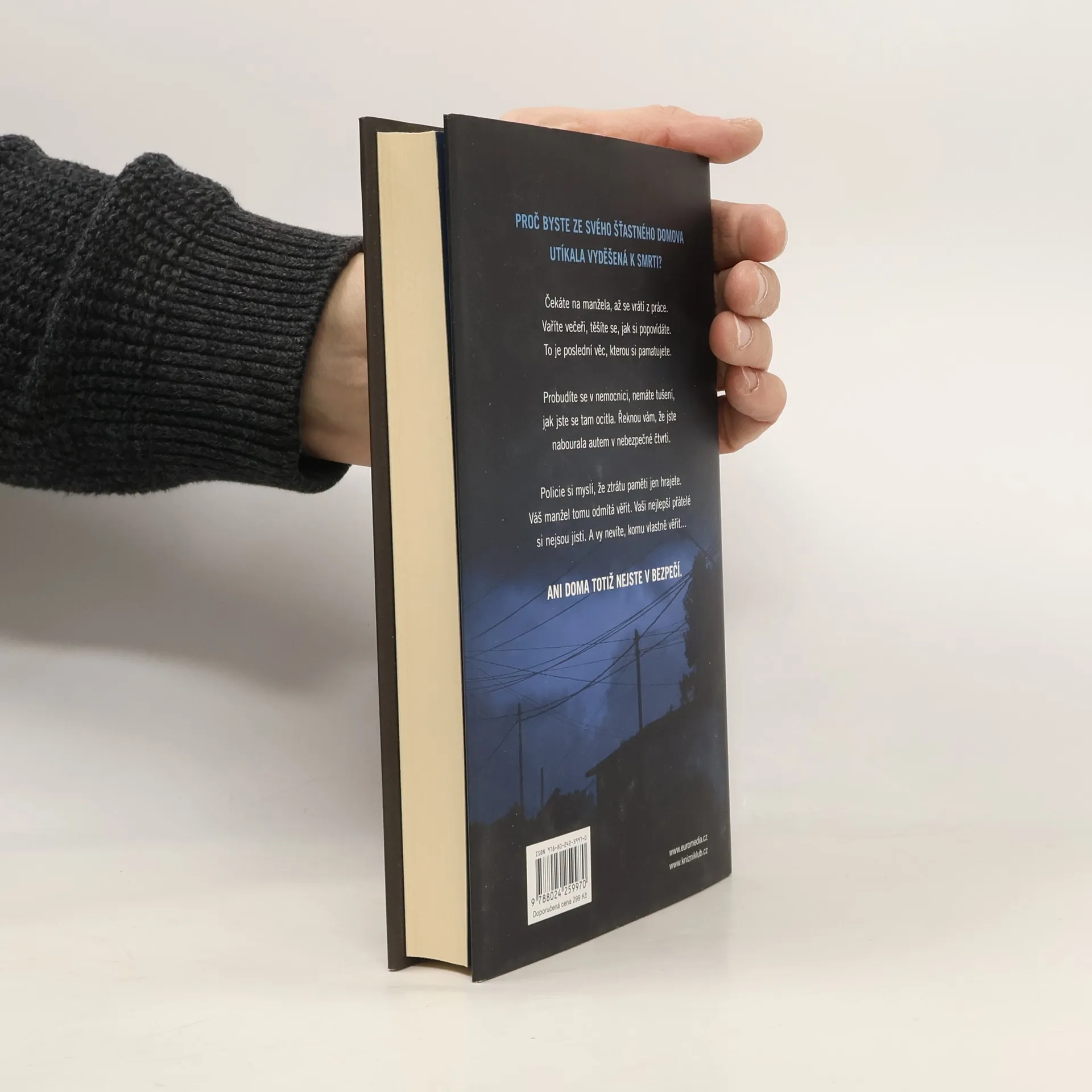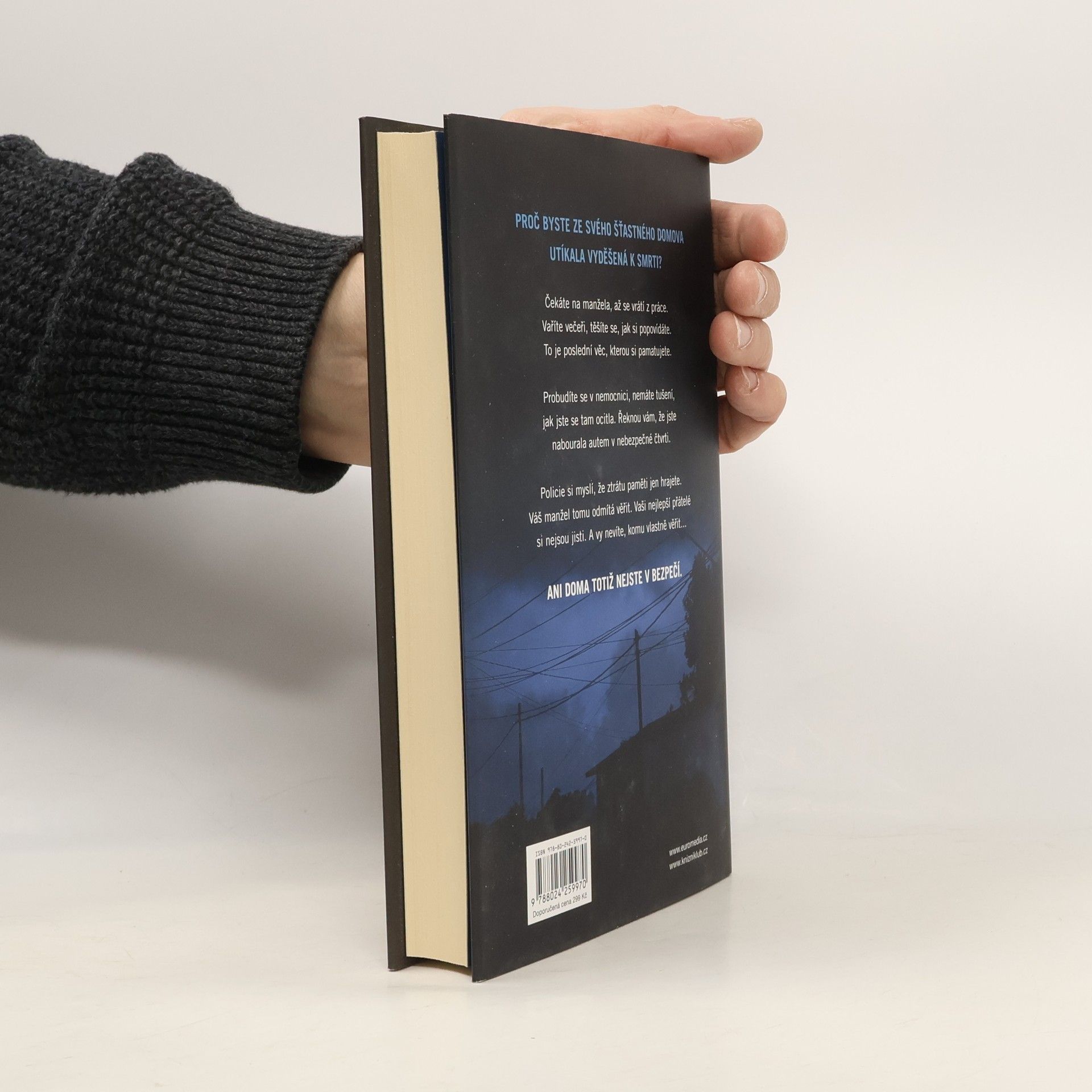 V téhle útulné čtvrti spokojených domovů zůstávají nebezpečné lži uzavřeny za dveřmi… Shari Lapena, autorka thrilleru roku 2017 Manželé odvedle, přichází s dalším rodinným dramatem plným tajemství a nečekaných zvratů, které nikdy nepřestanou překvapovat. Karen a Tom Kruppovi jsou šťastní – vzali se teprve nedávno a vlastní nádherný dům poblíž New Yorku. Jednoho dne se Tom vrátí domů a zjistí, že Karen zmizela – její auto je pryč a zdá se, že odjela ve spěchu. Nevzala si dokonce ani kabelku, telefon, doklady. Krátce nato se Tom dozví, že Karen měla nehodu a leží v nemocnici s otřesem mozku a ztrátou paměti. Po čase se Karen, odhodlaná vyléčit se a zapomenout, vrací s Tomem domů. Ale zdá se, že se tam něco změnilo. Něco není v pořádku. Někdo tam byl. Někdo cizí. Jenže v tomhle domě je každý cizí. Každý má něco, co by podle něj mělo zůstat skryto. Něco, kvůli čemu by raději vraždil, jen aby si to mohl nechat pro sebe...
