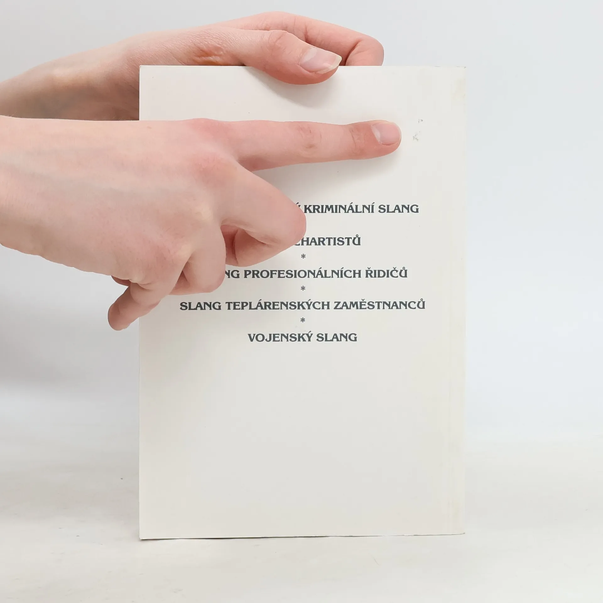 Jedná se o sbírku stručných slovníků slangu kriminálního, chartistického, profesionálních řidičů, teplárenských zaměstnanců a slang vojenský