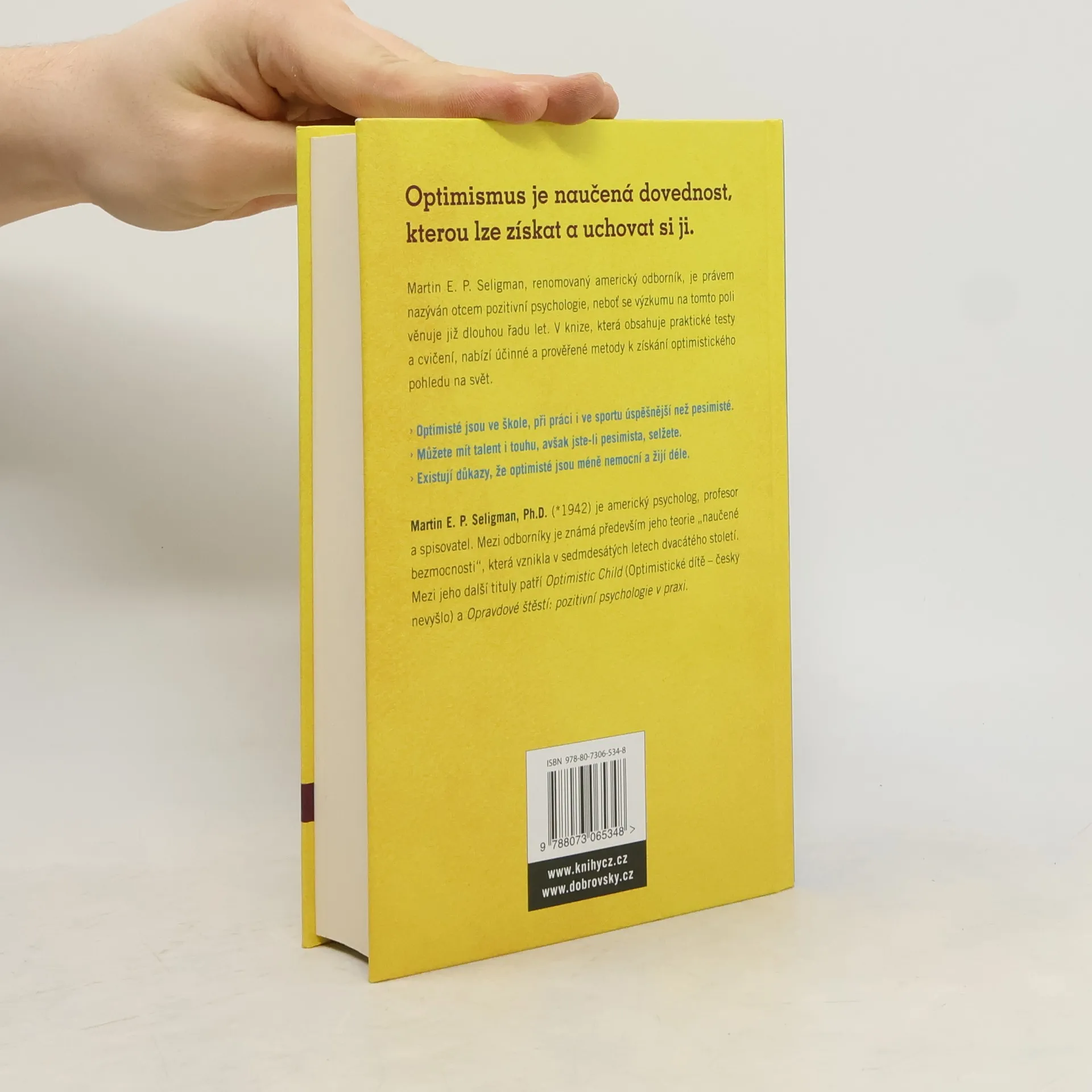 Do rukou se vám dostává seriózní kniha založená na mnohaletém výzkumu významného psychologa. Martin E. P. Seligman se bádání na tomto poli věnuje už několik desetiletí. V knize Naučený optimismus shrnul své poznatky a nabízí účinné metody k získání pozitivního pohledu na svět. Dozvíte se, jak se zbavit zlozvyku pesimismu a nevzdávat se kvůli maličkostem - dokážete si konstruktivněji vysvětlit své chování a naučíte se jednat sami se sebou mnohem pozitivněji. Podaří se vám prolomit depresivní myšlenky, lépe využijete svého potenciálu, budete úspěšnější a spokojenější. Kniha obsahuje konkrétní cvičení, testy a rady pro různá prostředí (škola, práce, rodina) a naučí optimismu i toho nejzarytějšího pesimistu.