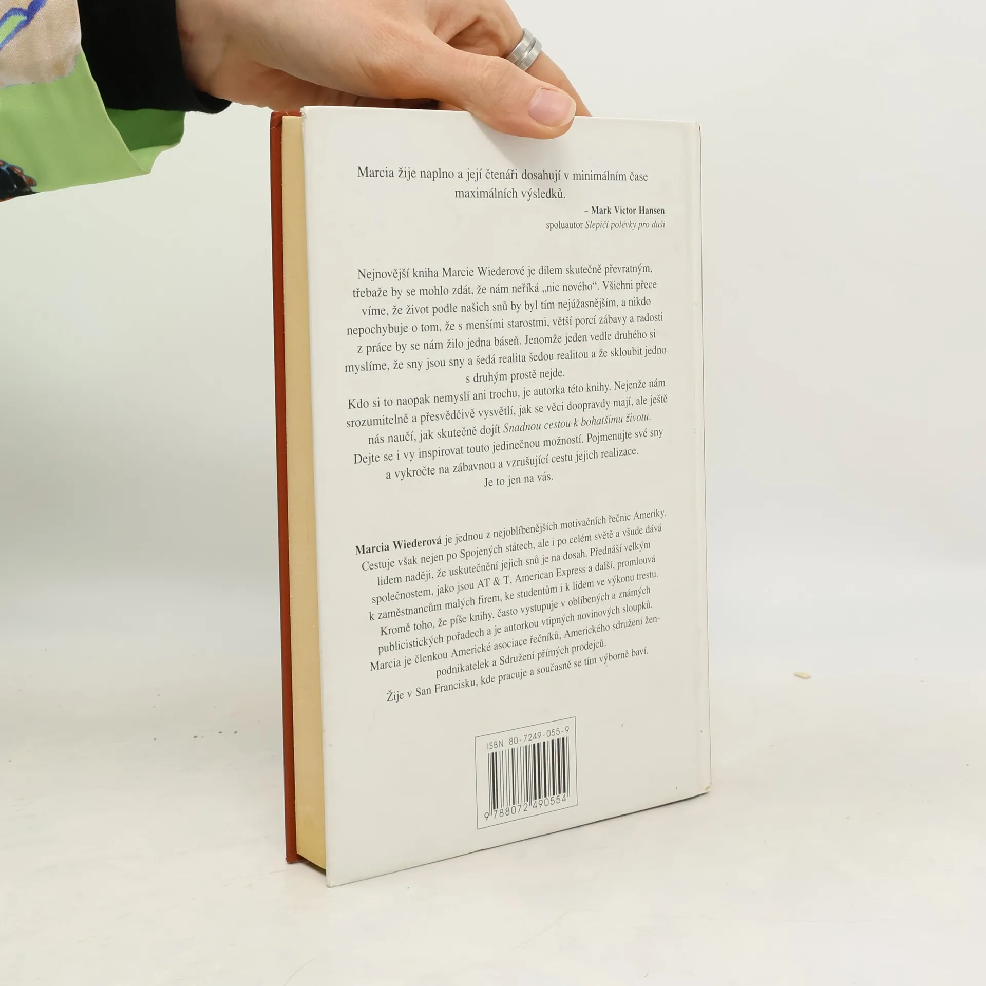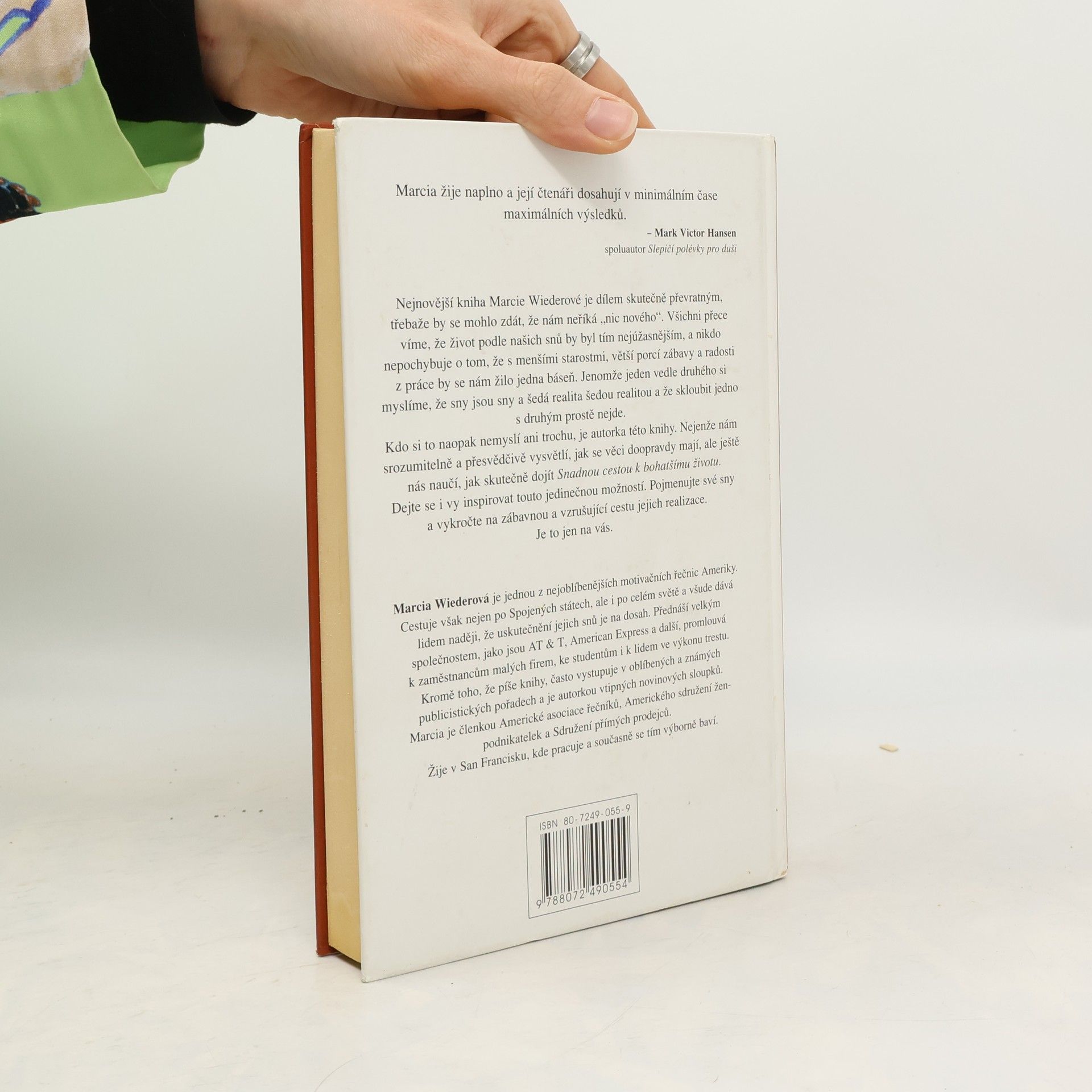 Nejnovější kniha Marcie Wiederové je dílem skutečně převratným, třebaže by se mohlo zdát, že nám neříká "nic nového". Všichni přece víme, že život podle našich snů by byl tím nejúžasnějším, a nikdo nepochybuje o tom, že s menšími starostmi, větší porcí zábavy a radosti z práce by se nám žilo jedna báseň. Jenomže jeden vedle druhého si myslíme, že sny jsou sny a šedá realita šedou realitou a že skloubit jedno s druhým prostě nejde. Kdo si to naopak nemyslí ani trochu, je autorka této knihy. Nejenže nám srozumitelně a přesvědčivé vysvětlí, jak se věci doopravdy mají, ale ještě nás naučí, jak skutečně dojít Snadnou cestou k bohatšímu životu. Dejte se i vy inspirovat touto jedinečnou možností. Pojmenujte své sny a vykročte na zábavnou a vzrušující cestu jejich realizace. Je to jen na vás. Marcia Wiederová je jednou z nejoblíbenějších motivačních řečnic Ameriky. Cestuje však nejen po Spojených státech, ale i po celém světě a všude dává lidem naději, že uskutečnění jejich snů je na dosah. Přednáší velkým společnostem, jako jsou AT & T, Američan Express a další, promlouvá k zaměstnancům malých firem, ke studentům i k lidem ve výkonu trestu. Kromě toho, že píše knihy, často vystupuje v oblíbených a známých publicistických pořadech a je autorkou vtipných novinových sloupků.