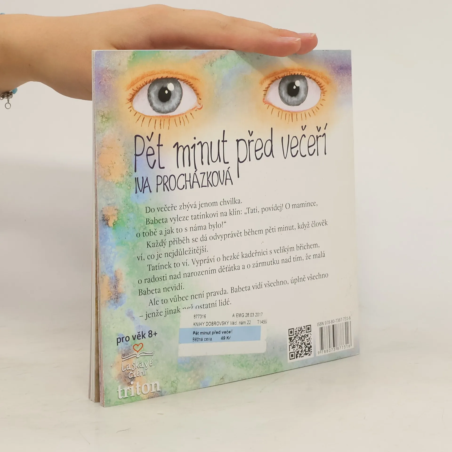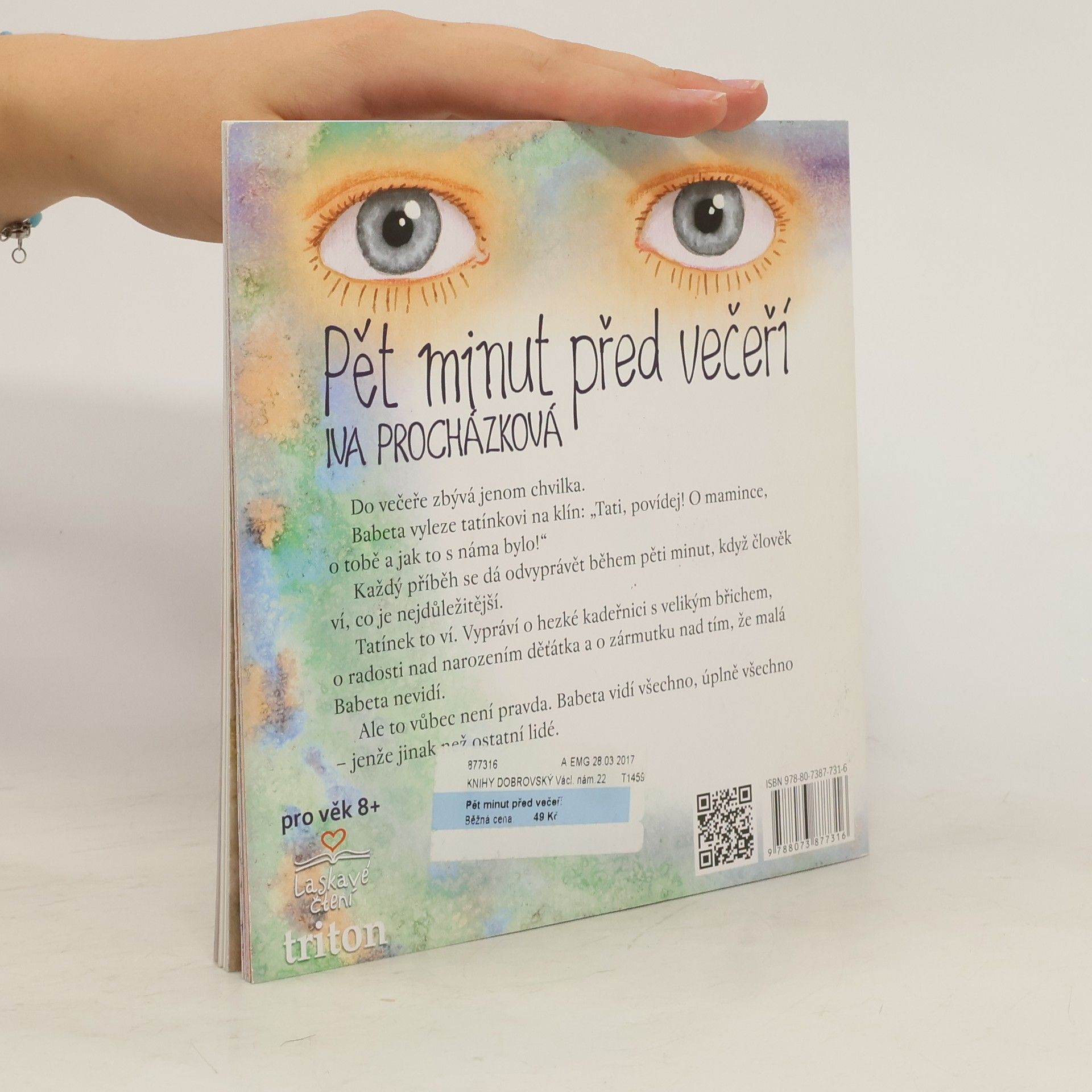 Do večeře zbývá jenom chvilka. Babeta vyleze tatínkovi na klín: „Tati, povídej! O mamince, o tobě a jak to s náma bylo!“Každý příběh se dá odvyprávět během pěti minut, když člověk ví, co je nejdůležitější.Tatínek to ví. Vypráví o hezké kadeřnici s velikým břichem,o radosti nad narozením děťátka a o zármutku nad tím, že malá Babeta nevidí. Ale to vůbec není pravda. Babeta vidí všechno, úplně všechno – jenže jinak než ostatní lidé.