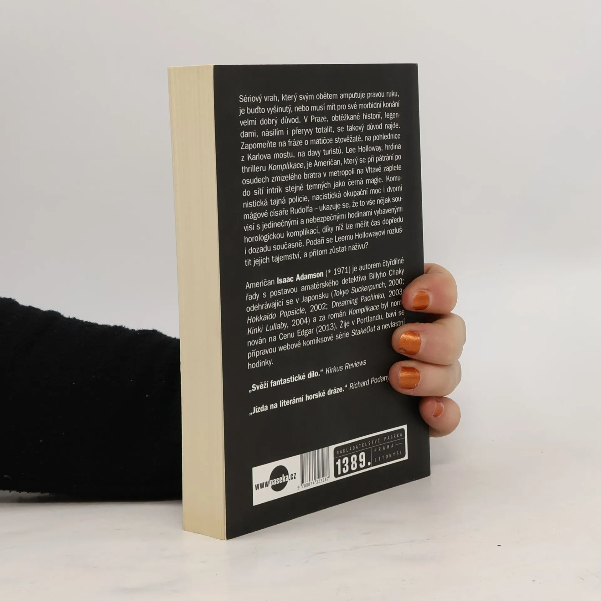 Sériový vrah, který svým obětem amputuje pravou ruku, je buďto vyšinutý, nebo musí mít pro své morbidní konání velmi dobrý důvod. V Praze, obtěžkané historií, legendami, násilím i přeryvy totalit, se takový důvod najde. Zapomeňte na fráze o matičce stověžaté, na pohlednice z Karlova mostu, na davy turistů. Lee Holloway, hrdina thrilleru Komplikace, je Američan, který se při pátrání po osudech zmizelého bratra v metropoli na Vltavě zaplete do sítí intrik stejně temných jako černá magie. Komunistická tajná policie, nacistická okupační moc i dvorní mágové císaře Rudolfa – ukazuje se, že to vše nějak souvisí s jedinečnými a nebezpečnými hodinami vybavenými horologickou komplikací, díky níž lze měřit čas dopředu i dozadu současně. Isaac Adamson (1971) je autorem čtyřdílné řady s postavou novináře a amatérského detektiva Billyho Chaky odehrávající se v Japonsku (2002–2004) a za román Komplikace byl nominován na Cenu Edgar (2013). Žije v Portlandu, baví se přípravou webové komiksové série StakeOut a nevlastní hodinky.