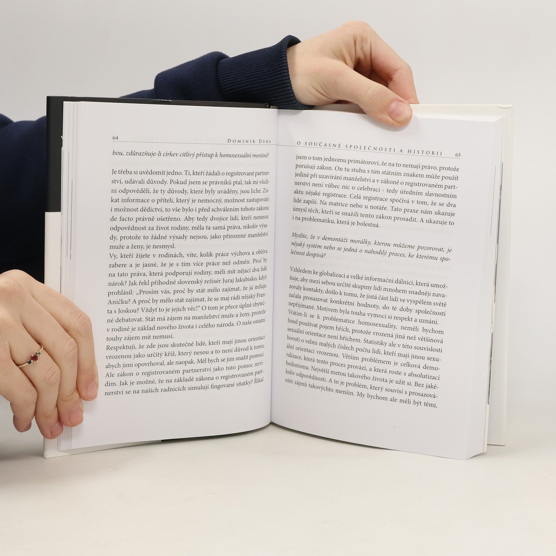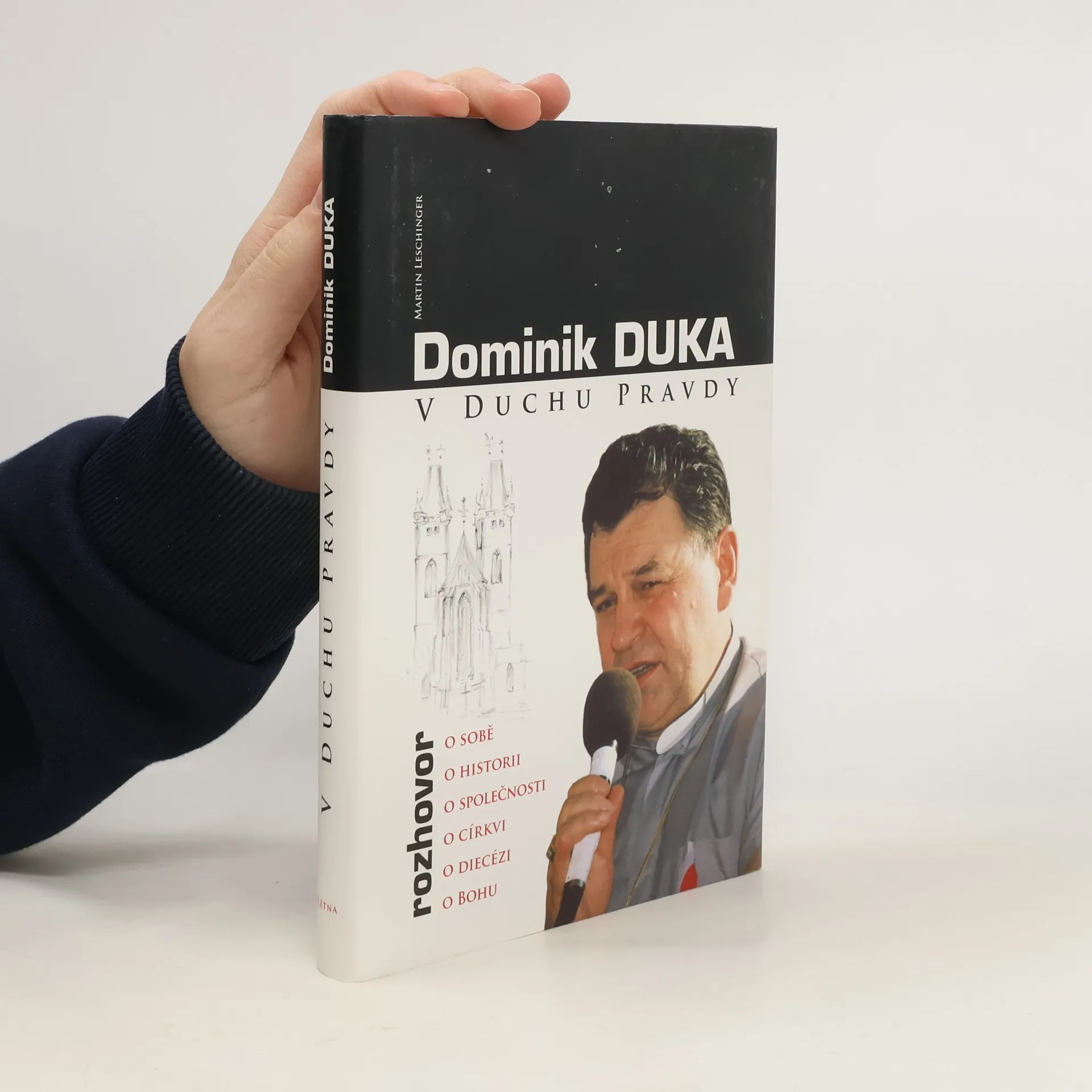 Rozhovor o sobě, o historii, o společnosti, o církvi, o diecézi, o Bohu. Kniha rozhovorů Martina Leschingera s Dominikem Dukou OP, 24. královéhradeckým sídelním biskupem, nabízí hluboký pohled do života této osobnosti a současné společnosti. Biskup Duka se otevřeně vyjadřuje k řadě kontroverzních témat, včetně souvislostí mezi jeho osobou a kampaní, která se proti němu rozvinula v době nejistoty ohledně pražského arcibiskupa. Rozhovor se zabývá nepopulárními historickými otázkami, jako jsou křížové výpravy, inkvizice nebo vztah katolické církve a svobodného zednářství. Kniha obsahuje také osobní pasáže, které ukazují na pevný životní postoj Dominika Duky. Doplněna je černobílými a barevnými fotografiemi, které dokumentují významné okamžiky, jako je setkání Václava Havla, Víta Tajovského a Dominika Duky v roce 1990, návštěva českého vojenského kontingentu v Basře a meditace biskupa na Genezaretském jezeře. Tato fotografie zdobí obálku. Kniha byla vydána, aby představila osobnost z vedení české katolické církve, která obhajuje katolicismus navzdory minulým i současným předsudkům.