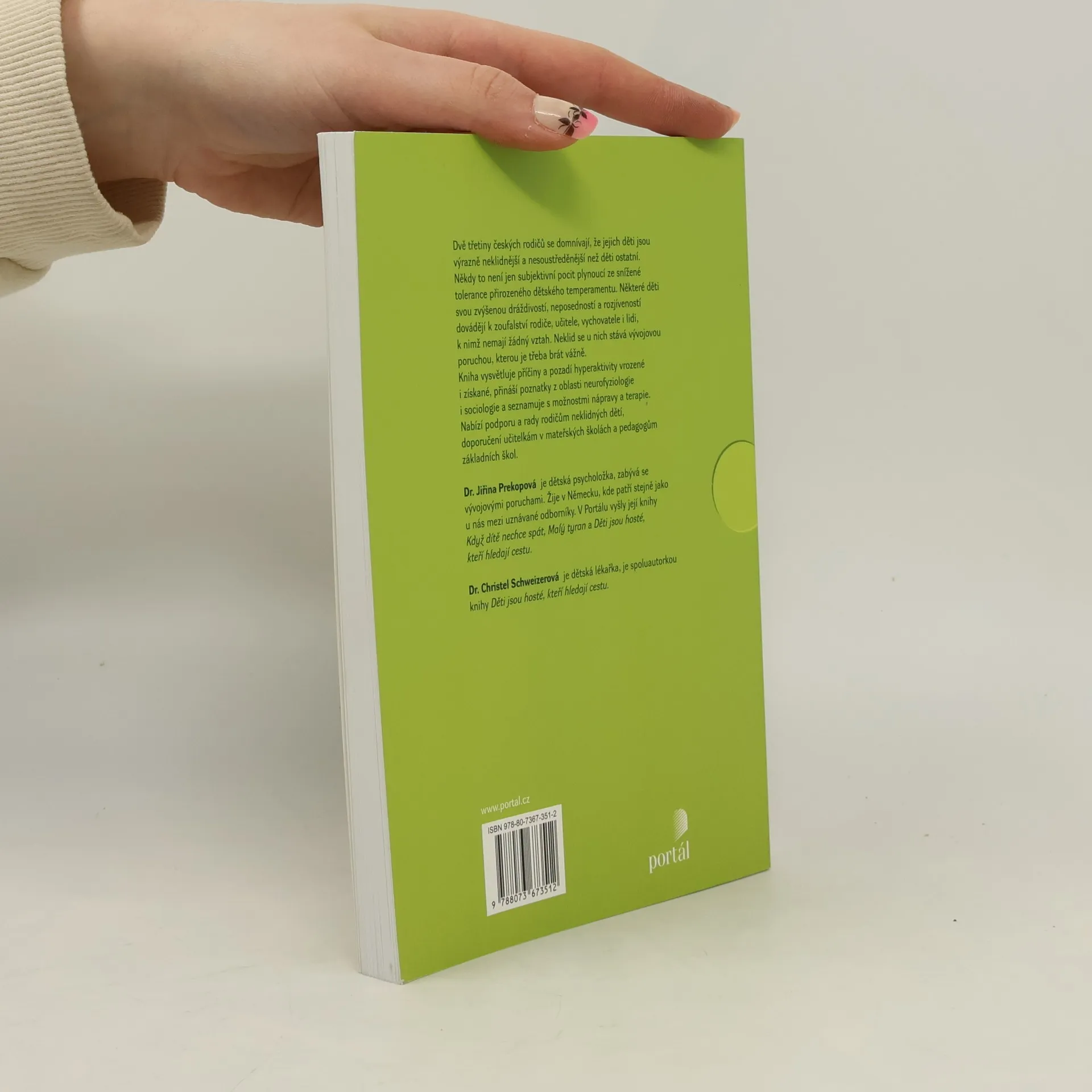 Dvě třetiny českých rodičů se domnívají, že jejich děti jsou výrazně neklidnější a nesoustředěnější než děti ostatní. Někdy to není jen subjektivní pocit plynoucí ze snížené tolerance přirozeného dětského temperamentu. Některé děti svou zvýšenou dráždivostí, neposedností a rozjíveností dovádějí k zoufalství rodiče, učitele, vychovatele i lidi, k nimž nemají žádný vztah. Neklid se u nich stává vývojovou poruchou, kterou je třeba brát vážně. Kniha vysvětluje příčiny hyperaktivity vrozené i získané, přináší poznatky z oblasti neurofyziologie i sociologie a seznamuje s možnostmi nápravy-terapie. Nabízí podporu a rady rodičům neklidných dětí, doporučení učitelkám v mateřských školách a pedagogům ZŠ. Dr. J. Prekopová je uznávaná dětská psycholožka, zabývá se vývojovými poruchami. Žije v Německu. V Portálu vyšly její knihy Když dítě nechce spát, Malý tyran a Děti jsou hosté, kteří hledají cestu. Dr. Ch. Schweizerová je dětská lékařka, spoluautorka knihy Děti jsou hosté, kteří hledají cestu.