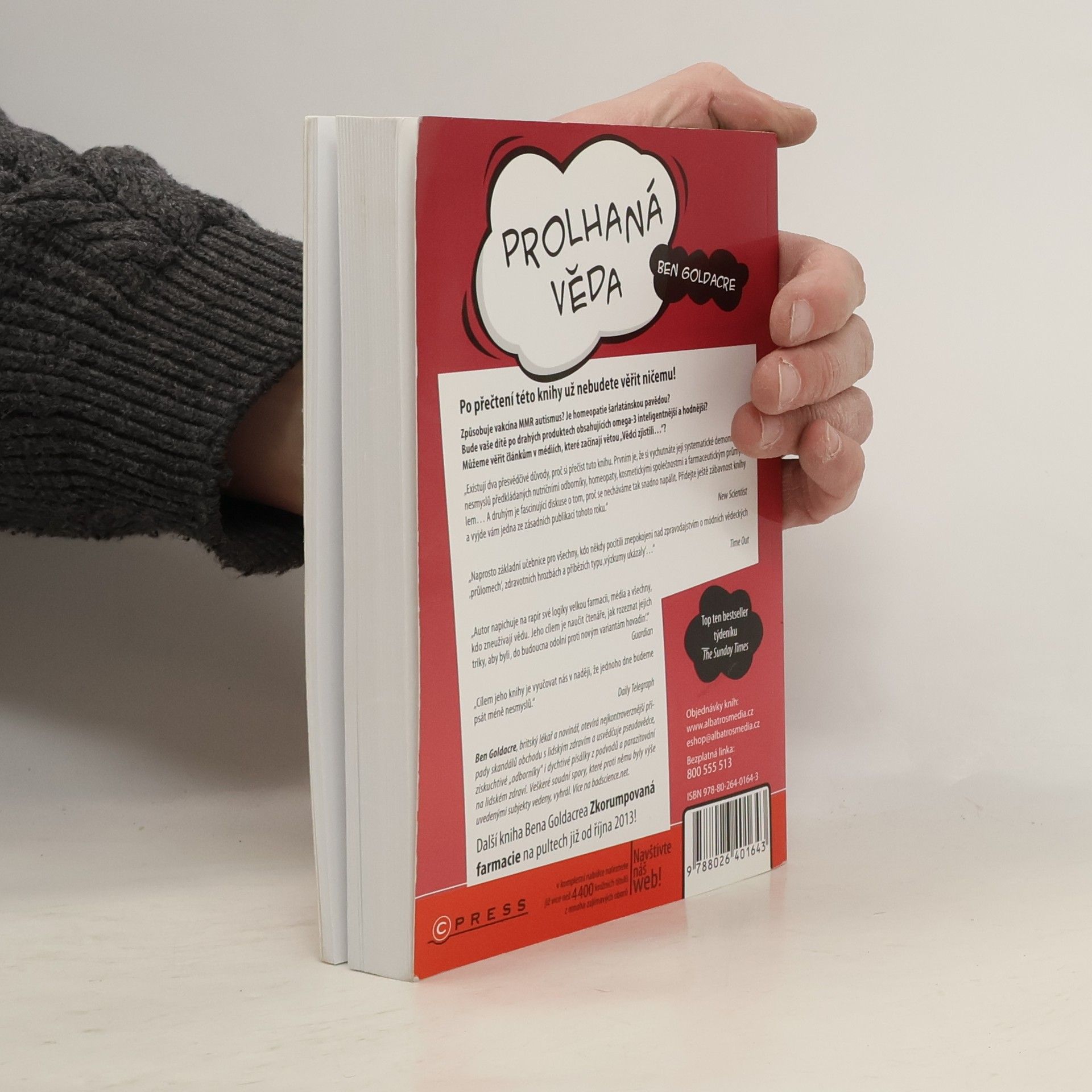 Po přečtení této knihy už nebudete věřit ničemu! Způsobuje vakcína MMR autismus? Je homeopatie šarlatánskou pavědou? Budou vaše děti po drahých produktech s omega-3 inteligentnější? Můžeme věřit článkům v médiích, které začínají větou „Vědci zjistili…“? Existují dva přesvědčivé důvody, proč si tuto knihu přečíst. Prvním je systematické demontování nesmyslů předkládaných nutričními odborníky, homeopaty, kosmetickými společnostmi a farmaceutickým průmyslem. Druhým je fascinující diskuse o tom, proč se necháváme snadno napálit. Kniha je zábavná a stává se jednou ze zásadních publikací tohoto roku. Je to základní učebnice pro všechny, kdo někdy pocítili znepokojení nad zpravodajstvím o módních vědeckých „průlomech“ a zdravotních hrozbách. Autor napichuje na rapír své logiky velkou farmacii, média a všechny, kdo zneužívají vědu. Jeho cílem je naučit čtenáře, jak rozeznat jejich triky, aby byli odolní proti novým variantám hovadin. Cílem jeho knihy je vyučovat nás v naději, že jednoho dne budeme psát méně nesmyslů. Ben Goldacre je publicista, komentátor a lékař, známý svým sloupkem „Bad Science“ v Guardianu. Narodil se v roce 1974 a pracuje na plný úvazek jako lékař ve státním zdravotnictví ve Velké Británii.