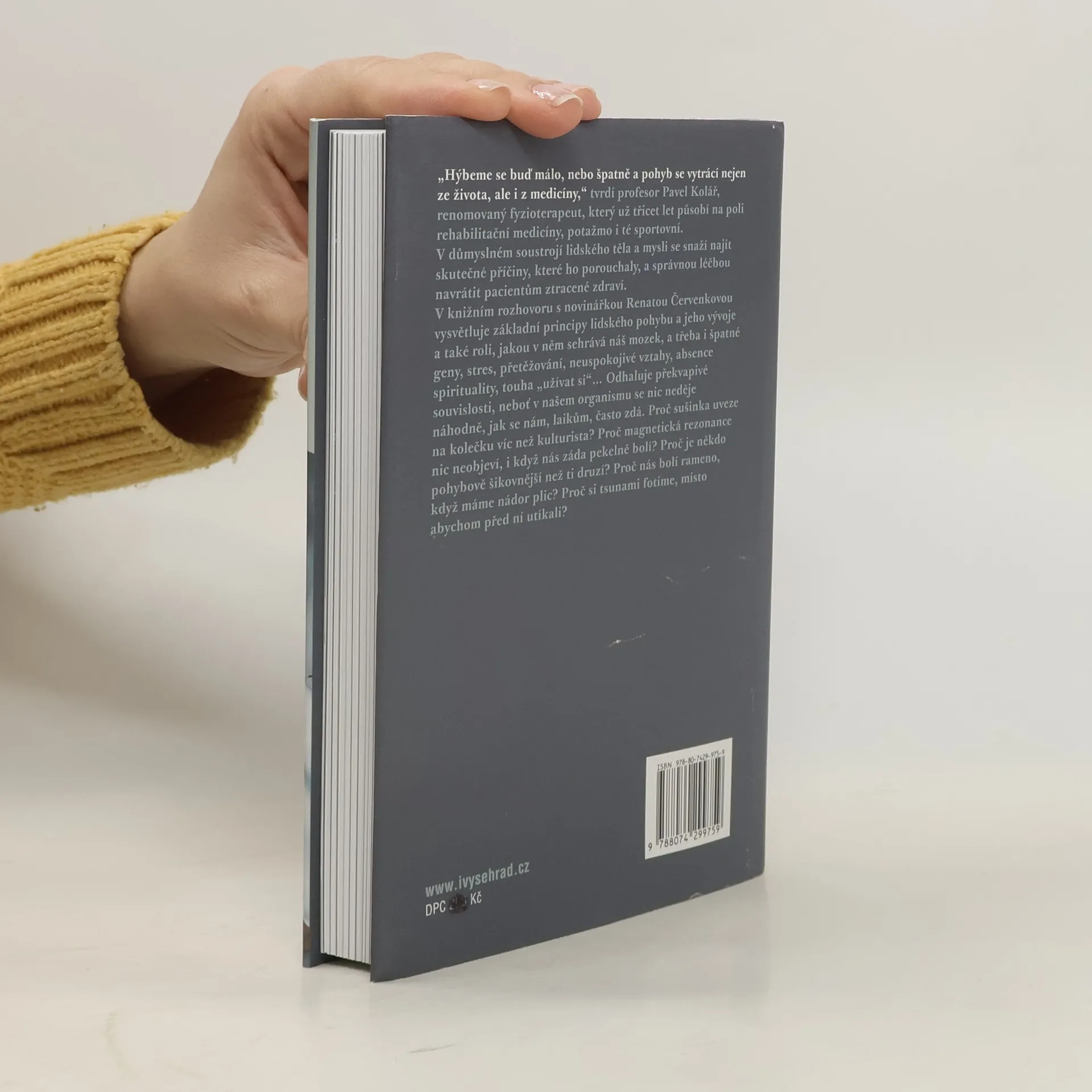 Knižní rozhovor s renomovaným fyzioterapeutem prof. Kolářem. „Hýbeme se buď málo, nebo špatně a pohyb se vytrácí nejen ze života, ale i z medicíny,“ tvrdí profesor Pavel Kolář, renomovaný fyzioterapeut, který už třicet let působí na poli rehabilitační medicíny, potažmo i té sportovní. V důmyslném soustrojí lidského těla a mysli se snaží najít skutečné příčiny, které ho porouchaly, a správnou léčbou navrátit pacientům ztracené zdraví. V rozhovorech s novinářkou Renátou Červenkovou vysvětluje základní principy lidského pohybu a jeho vývoje a také roli, jakou v něm sehrává náš mozek a třeba i špatné geny, stres, přetěžování, neuspokojivé vztahy, absence spirituality, touha „užívat si“... Odhaluje překvapivé souvislosti, neboť v našem organismu se nic neděje náhodně, jak se nám, laikům, často zdá. Proč nás bolí rameno, když máme nádor plic? Proč sušinka uveze na kolečku víc než kulturista? Proč magnetická rezonance nic neobjeví, i když nás záda pekelně bolí? Proč je někdo pohybově šikovnější než ti druzí? Proč si tsunami fotíme, místo abychom před ní utíkali?