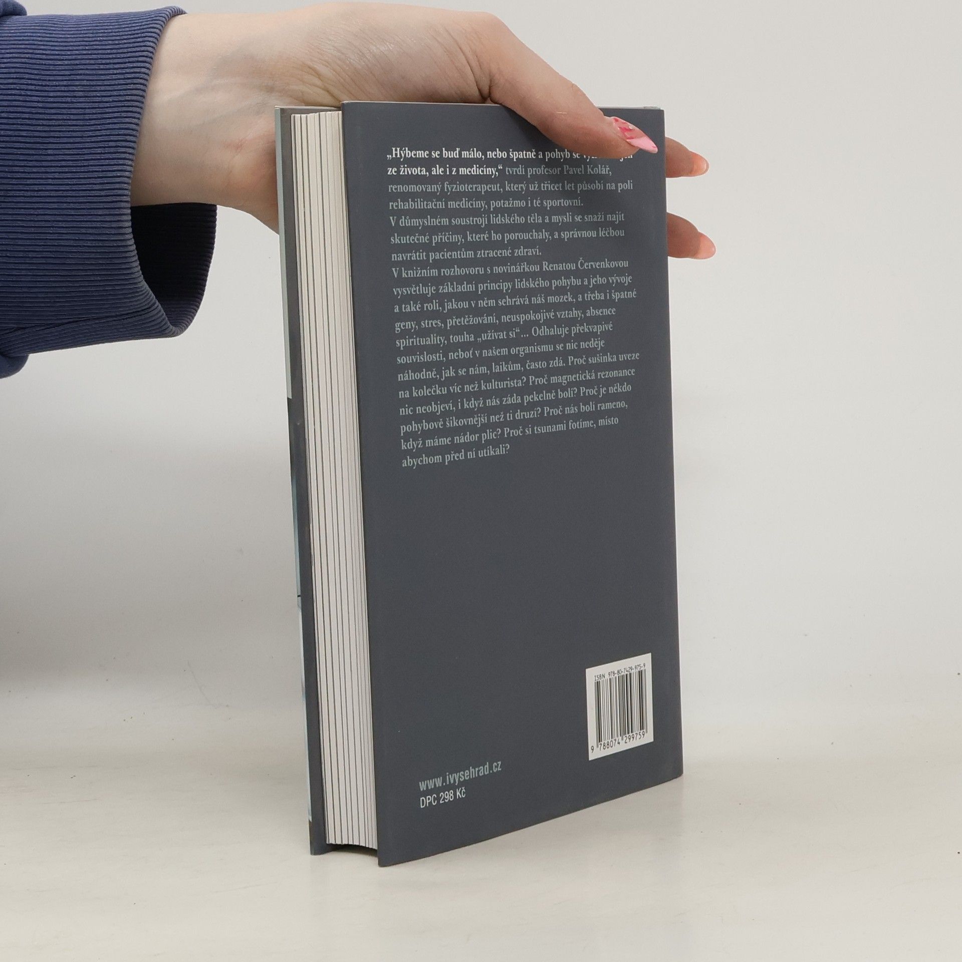 Knižní rozhovor s renomovaným fyzioterapeutem prof. Kolářem. „Hýbeme se buď málo, nebo špatně a pohyb se vytrácí nejen ze života, ale i z medicíny,“ tvrdí profesor Pavel Kolář, renomovaný fyzioterapeut, který už třicet let působí na poli rehabilitační medicíny, potažmo i té sportovní. V důmyslném soustrojí lidského těla a mysli se snaží najít skutečné příčiny, které ho porouchaly, a správnou léčbou navrátit pacientům ztracené zdraví. V rozhovorech s novinářkou Renátou Červenkovou vysvětluje základní principy lidského pohybu a jeho vývoje a také roli, jakou v něm sehrává náš mozek a třeba i špatné geny, stres, přetěžování, neuspokojivé vztahy, absence spirituality, touha „užívat si“... Odhaluje překvapivé souvislosti, neboť v našem organismu se nic neděje náhodně, jak se nám, laikům, často zdá. Proč nás bolí rameno, když máme nádor plic? Proč sušinka uveze na kolečku víc než kulturista? Proč magnetická rezonance nic neobjeví, i když nás záda pekelně bolí? Proč je někdo pohybově šikovnější než ti druzí? Proč si tsunami fotíme, místo abychom před ní utíkali?