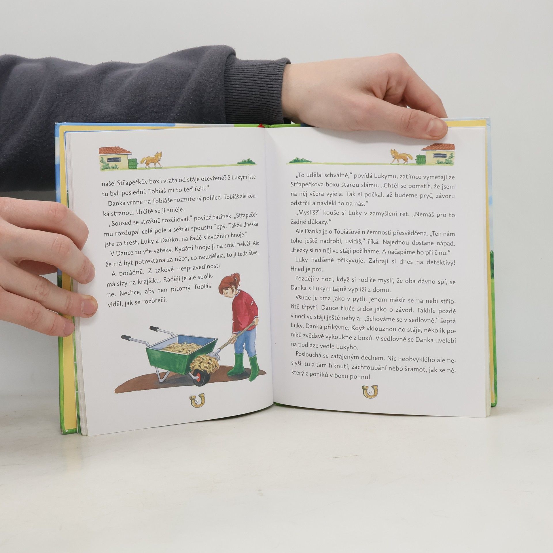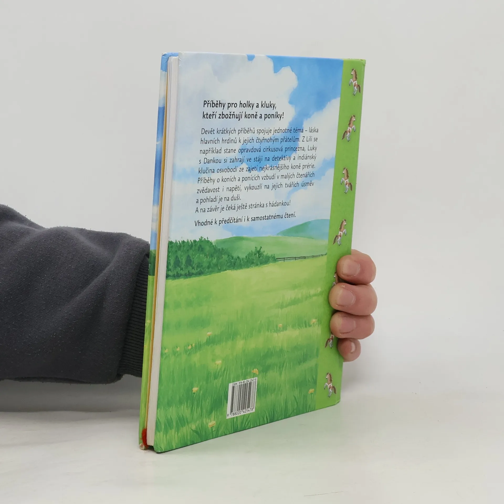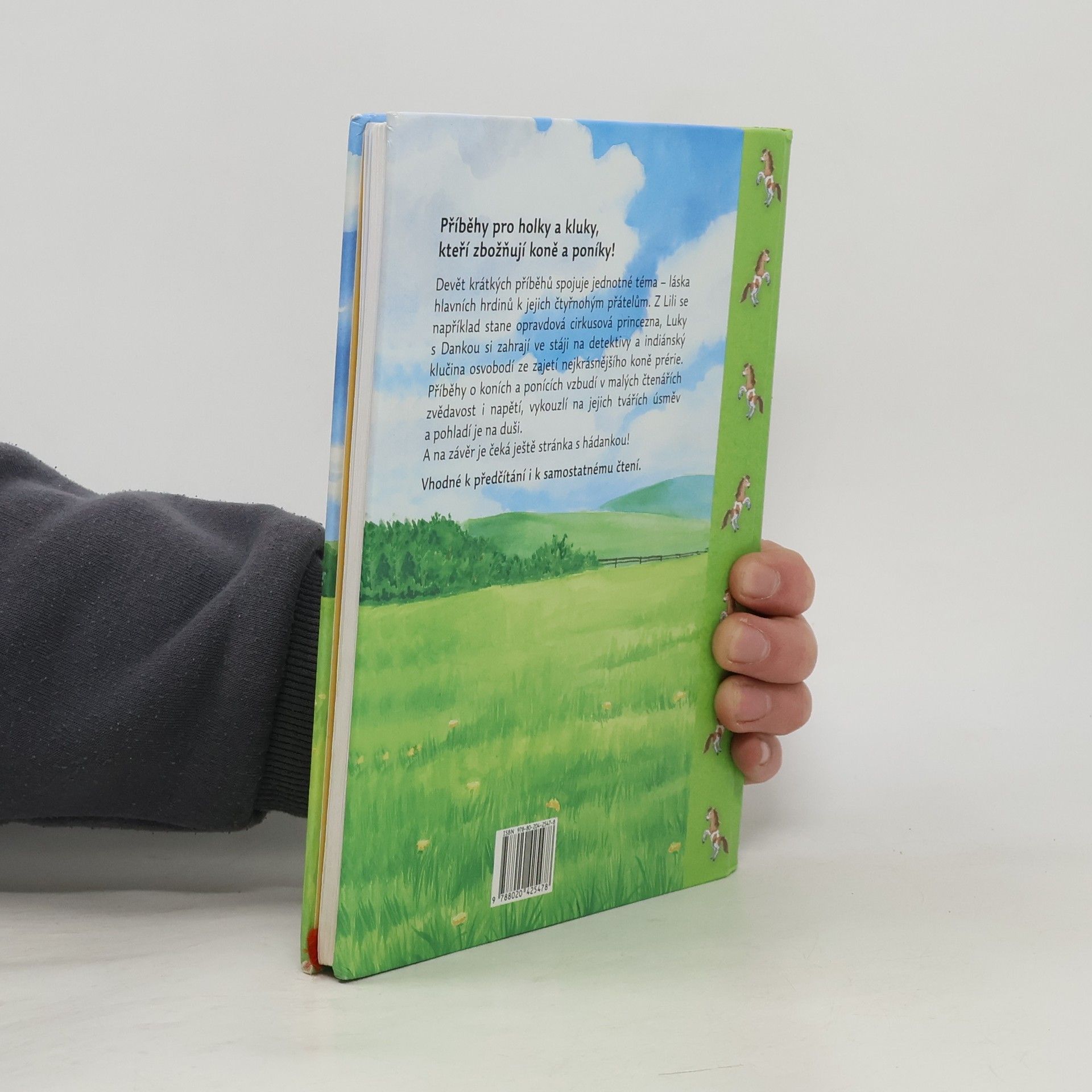 Každé vyprávění se odehrává v jiném prostředí, nechybí mu dobrodružná zápletka, napětí a samozřejmě šťastný konec. Tak je tu holčička z rodiny cirkusových umělců, které tatínek nechce dovolit akrobacii na koni; kluk, kterému se kluci smějí, že jeho největší láskou není fotbal, ale koně; ošklivé hříbátko; malý indián, který zachrání divokého koně před zloději, a další malí hrdinové. Milé příběhy jsou doprovázeny krásnými barevnými ilustracemi a na konci knihy čeká děti ještě malý úkol!