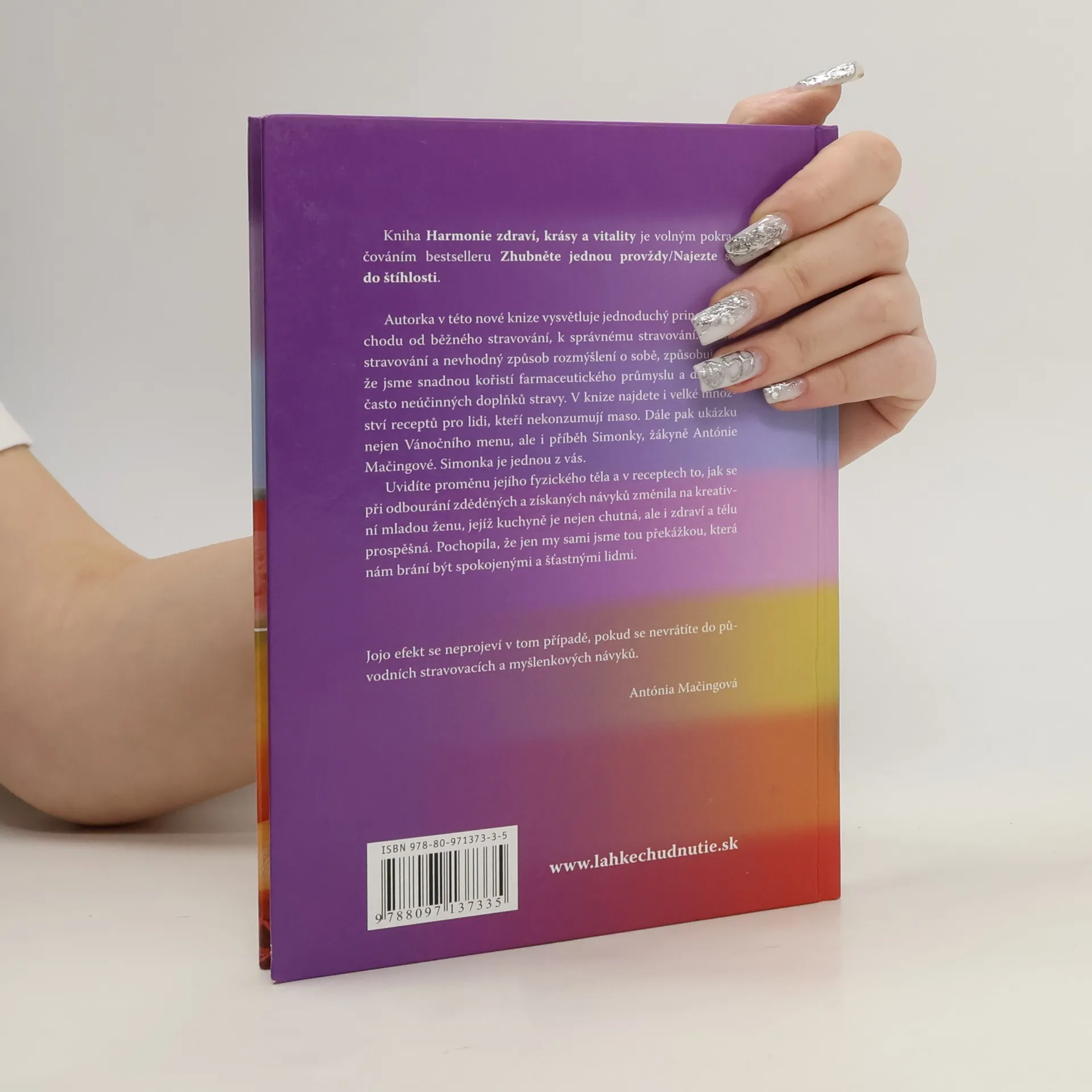 Autorka v této nové knize vysvětluje jednoduchý princip přechodu od běžného stravování, k správnému stravování. Běžné stravování a nevhodný způsob rozmýšlení o sobě, způsobuje to, že jsme snadnou kořistí farmaceutického průmyslu a drahých, často neúčinných doplňků stravy. V knize najdete i velké množství receptů pro lidi, kteří nekonzumují maso. Dále pak ukázku nejen Vánočního menu, ale i příběh Simonky, žákyně Antónie Mačingové. Simonka je jednou z vás. Uvidíte proměnu jejího fyzického těla a v receptech to, jak se při odbourání zděděných a získaných návyků změnila na kreativní mladou ženu, jejíž kuchyně je nejen chutná, ale i zdraví a tělu prospěšná. Pochopila, že jen my sami jsme tou překážkou, která nám brání být spokojenými a šťastnými lidmi. Jojo efekt se neprojeví v tom případě, pokud se nevrátíte do původních stravovacích návyků. Antónia Mačingová